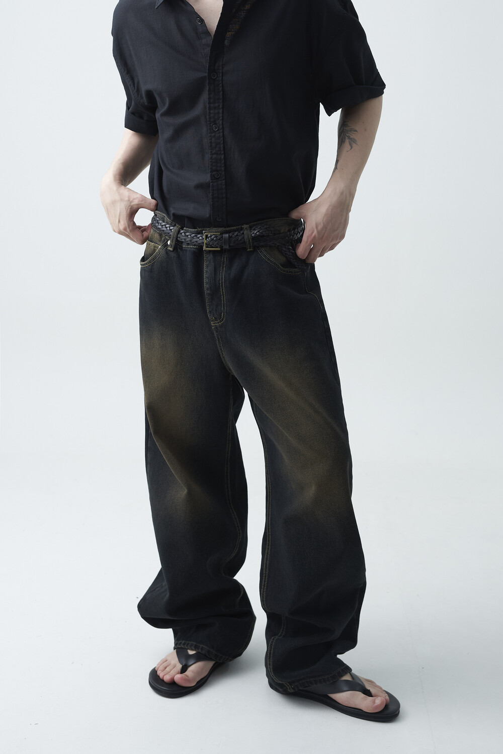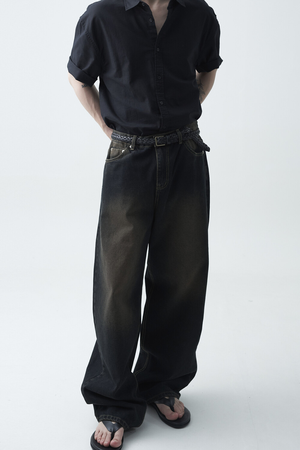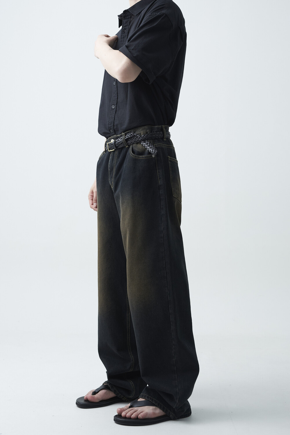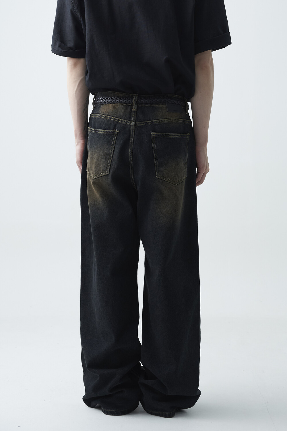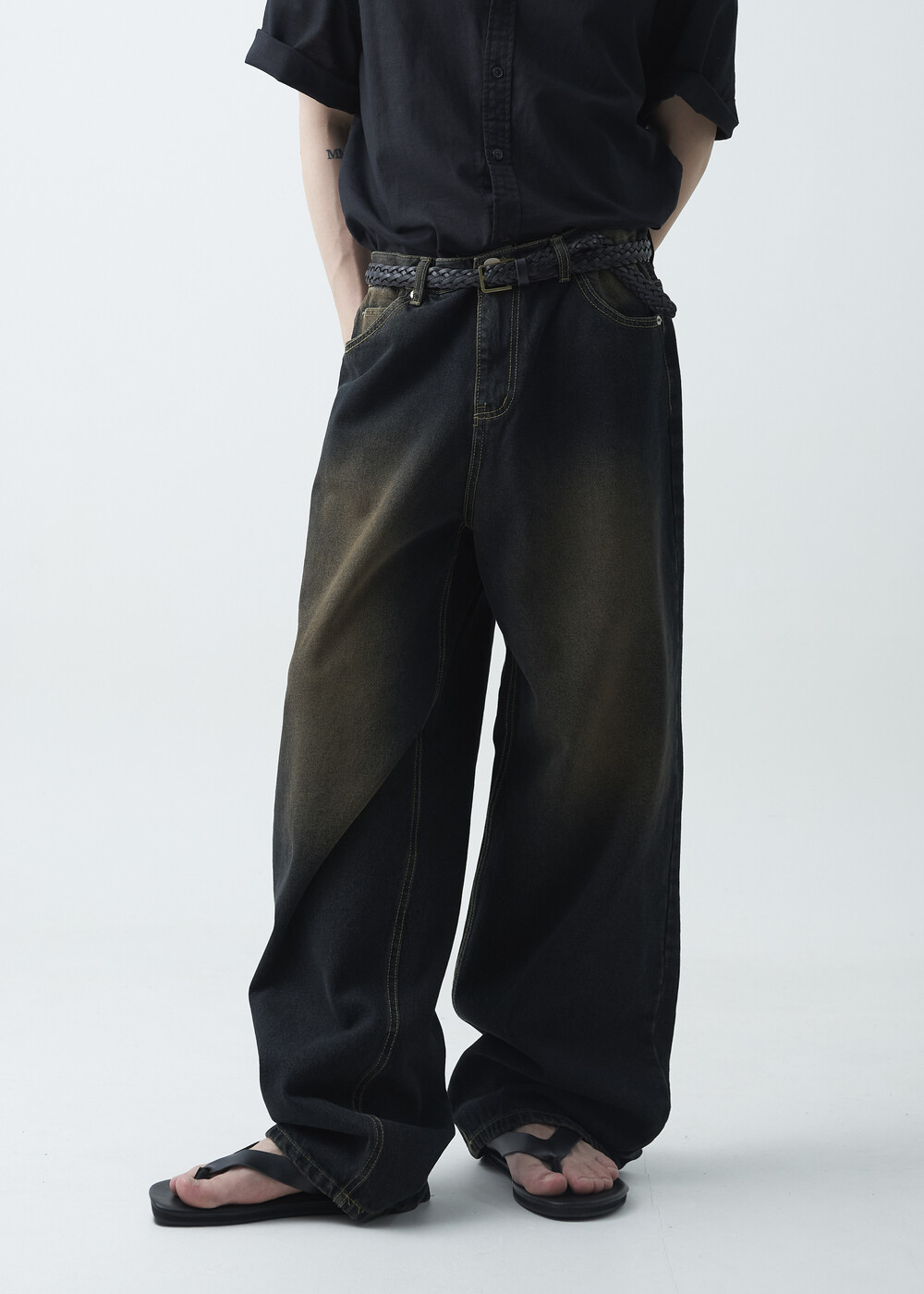 - 블랙 브라운 컬러감의 워싱 와이드 데님팬츠 제품
