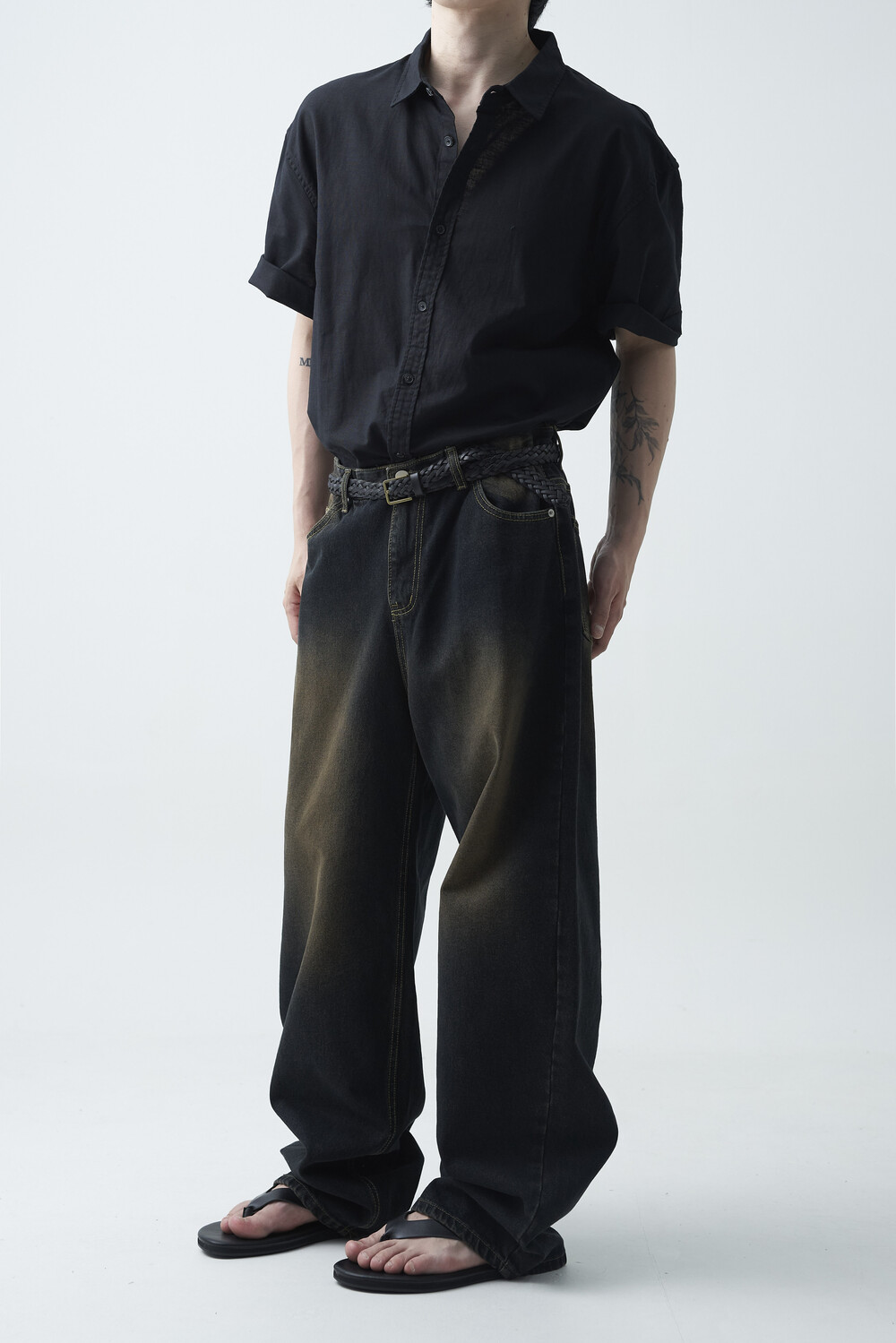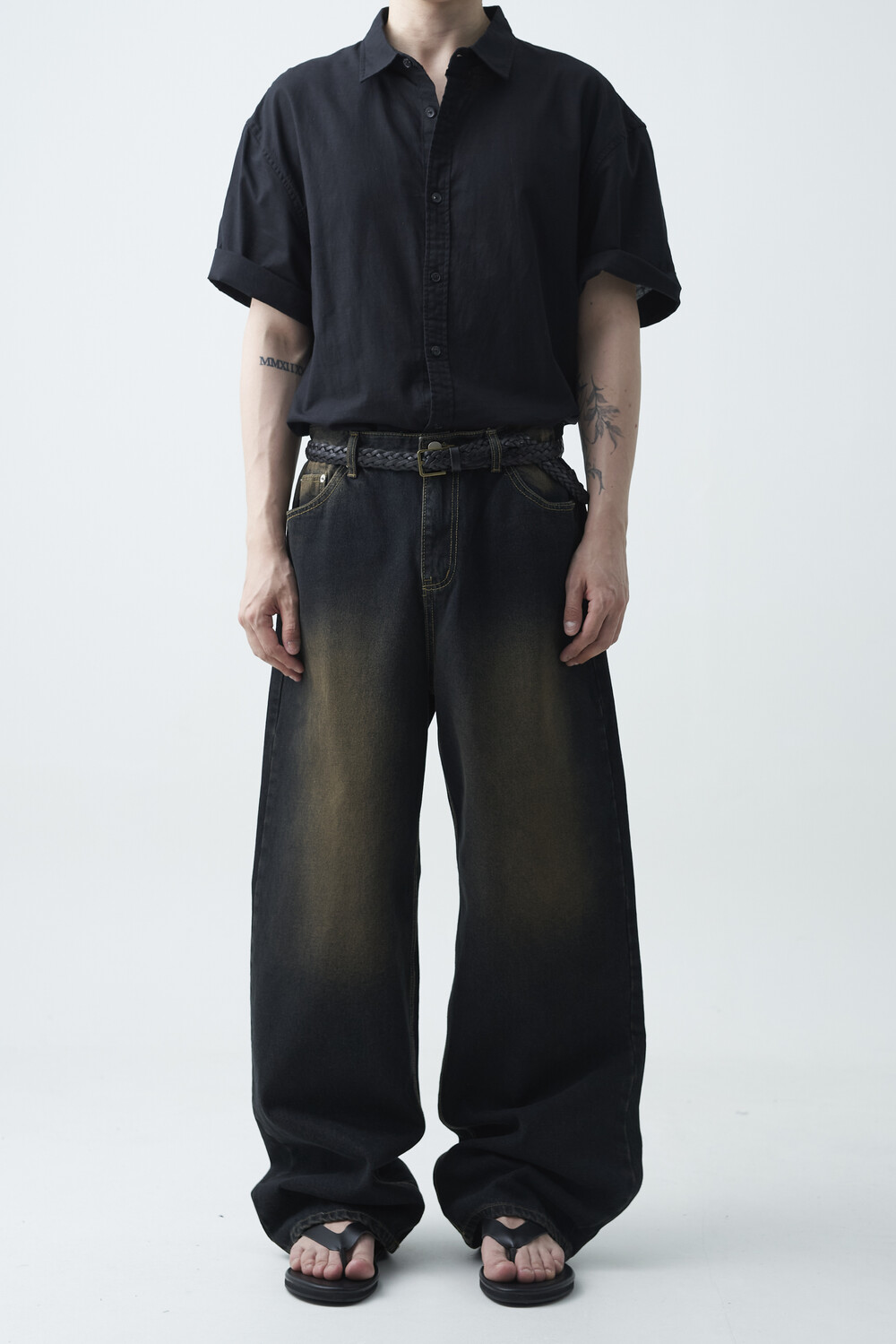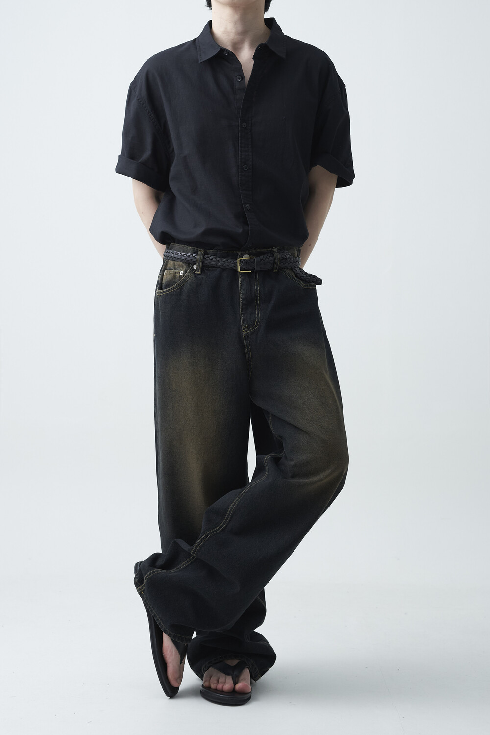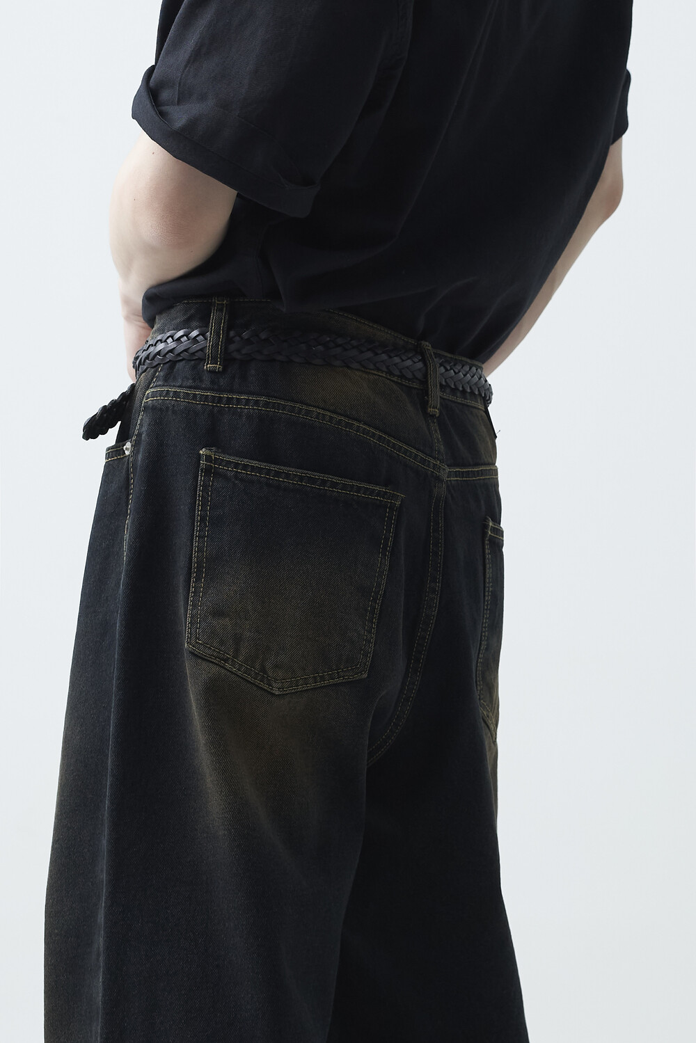 - 블랙 브라운 컬러감의 워싱 와이드 데님팬츠 제품