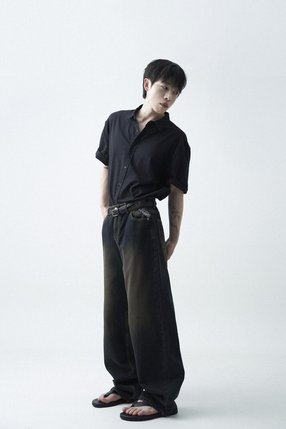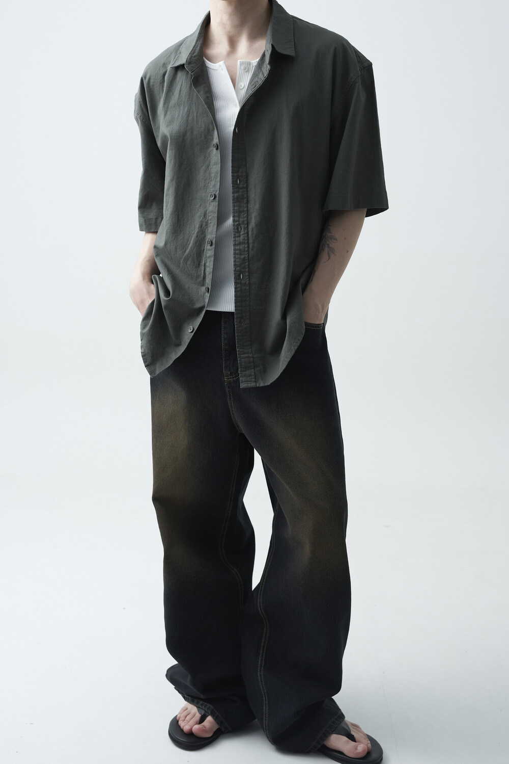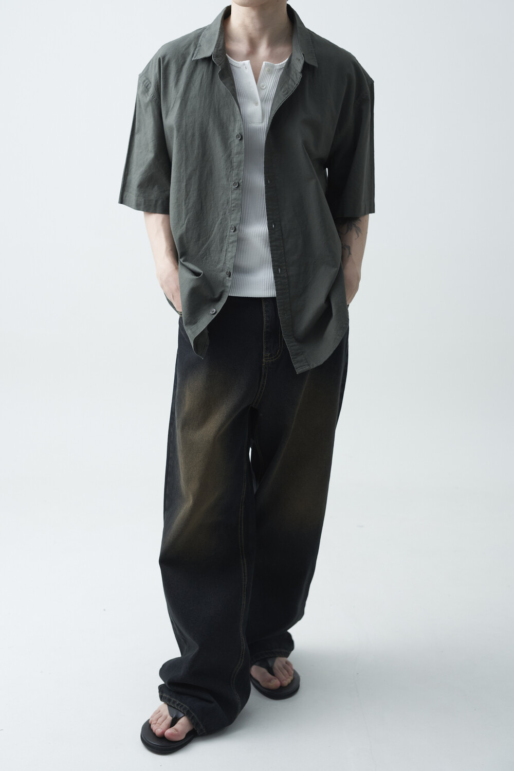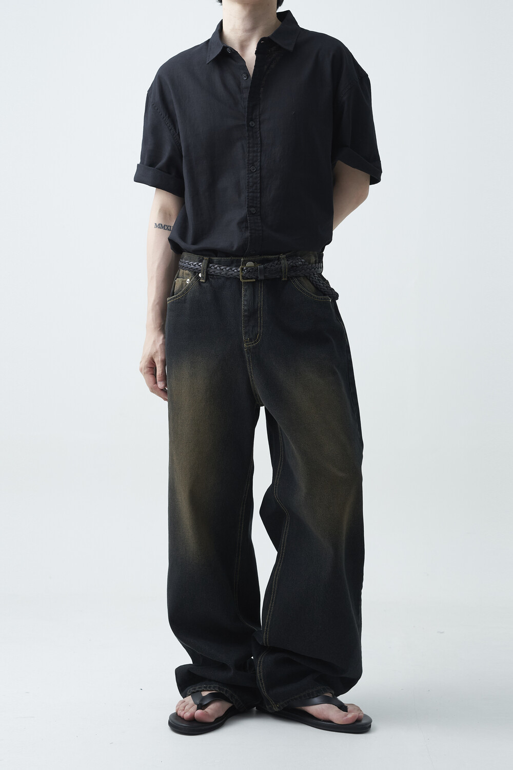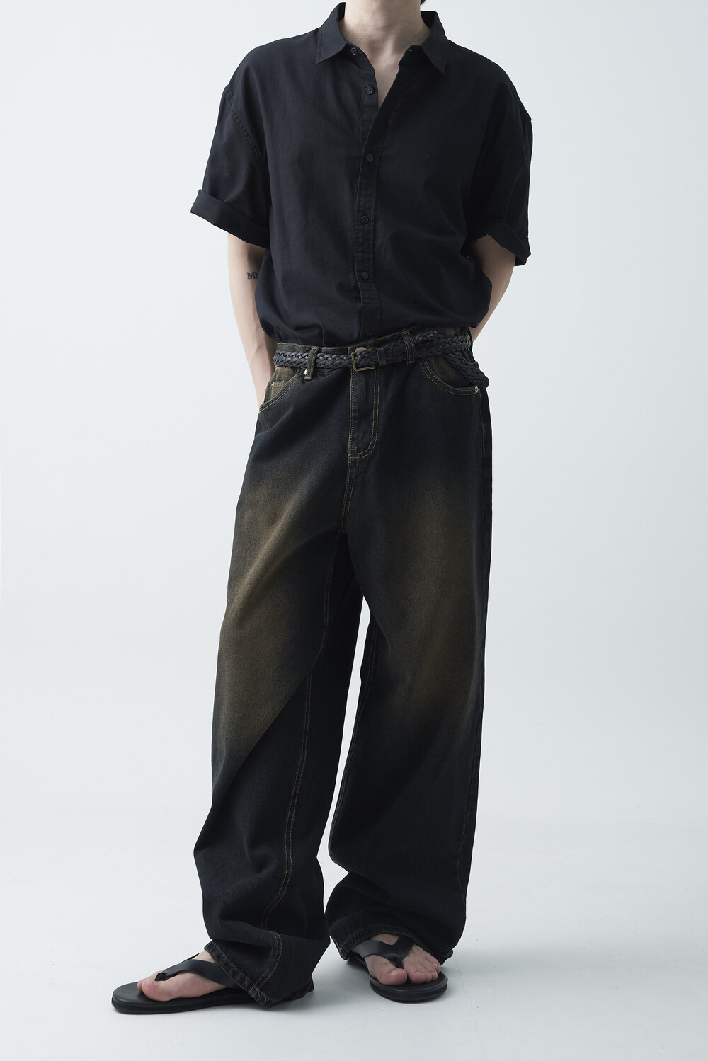 - 블랙 브라운 컬러감의 워싱 와이드 데님팬츠 제품