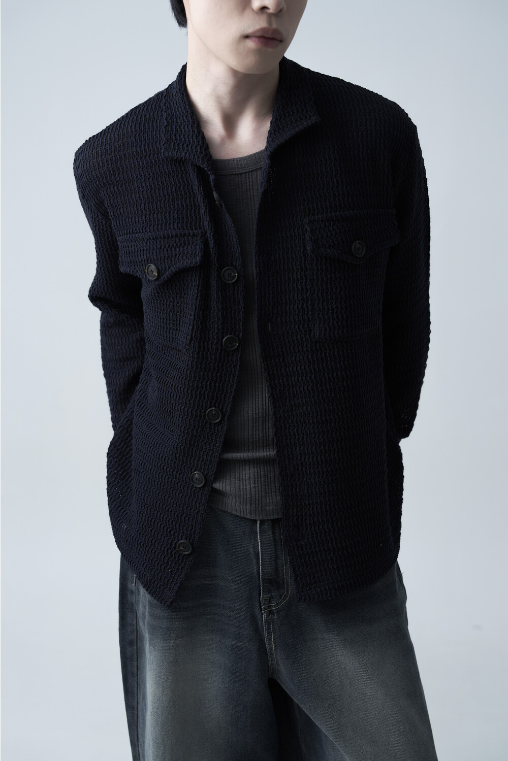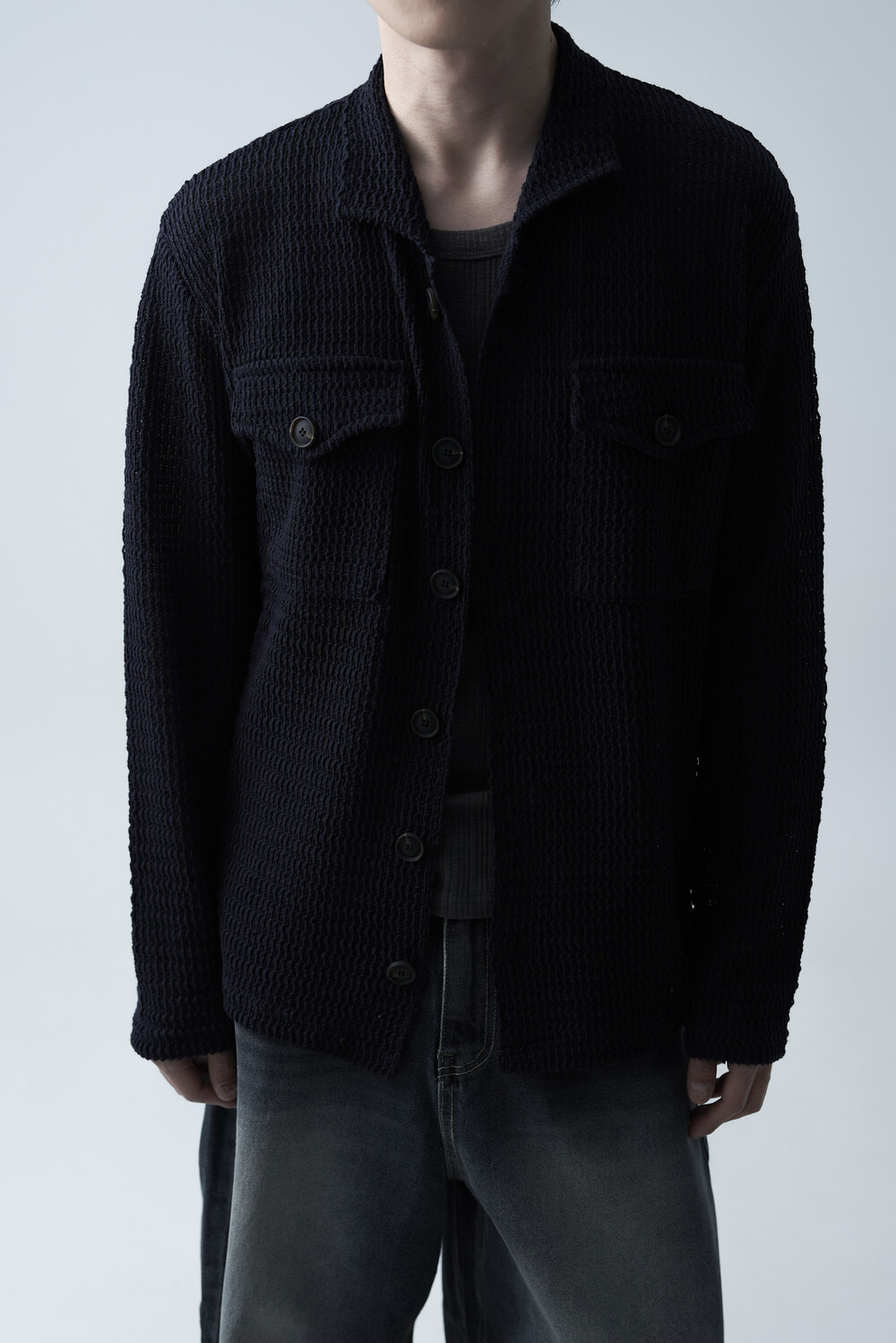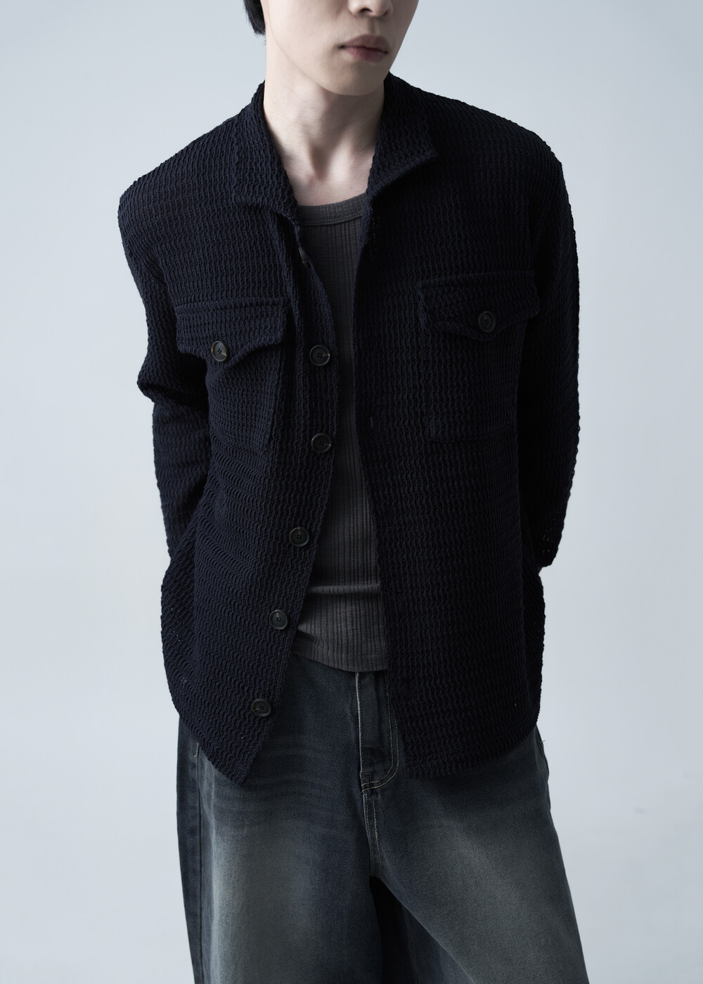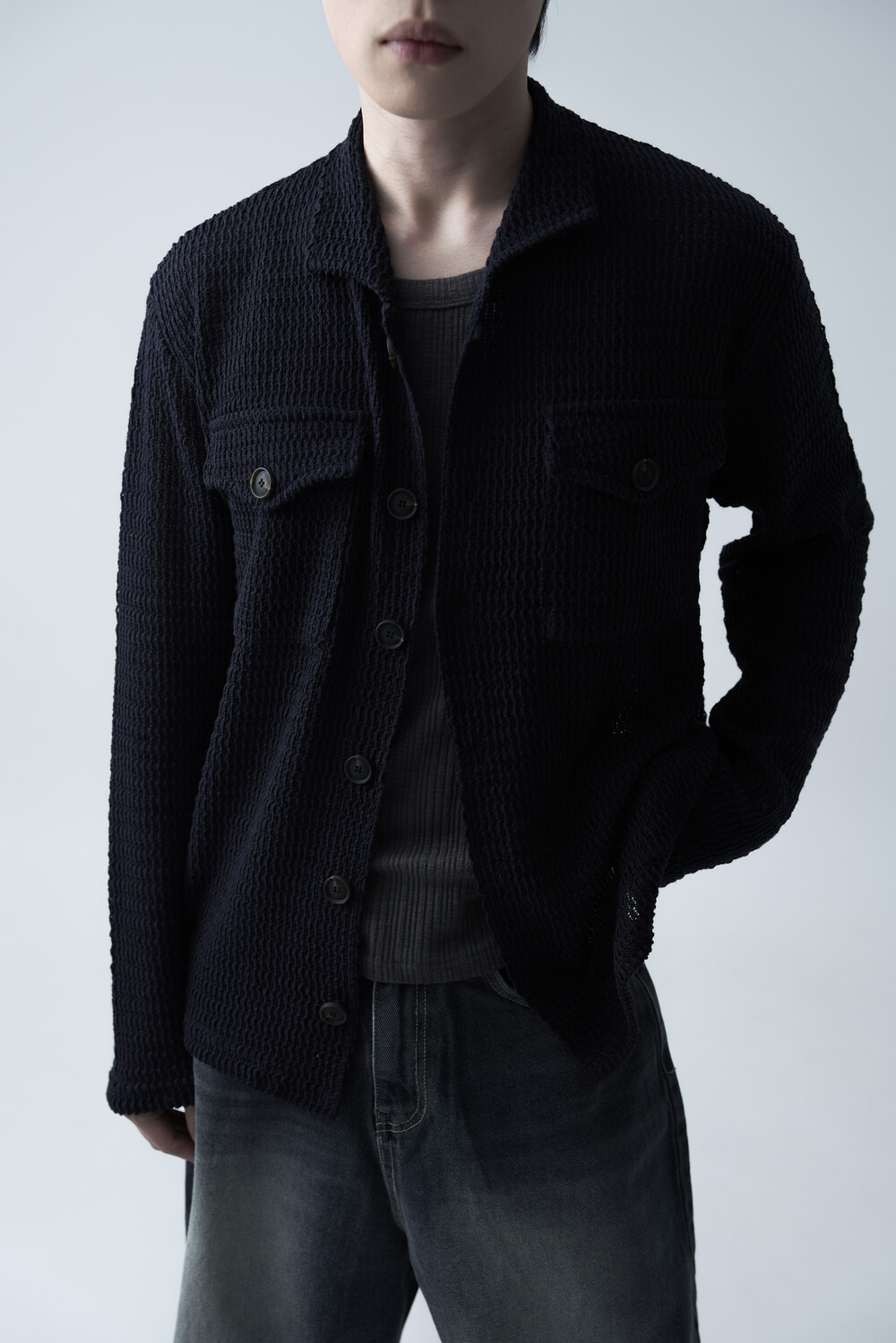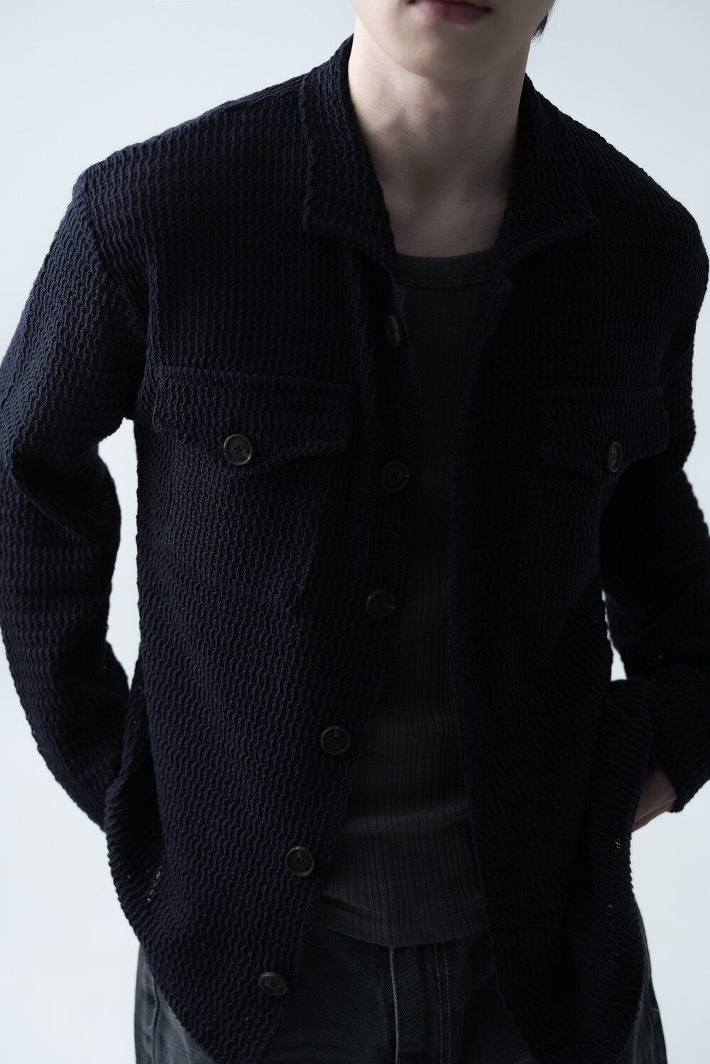 여름에도 착용할 수 있는 세밀한 펀칭 텍스쳐로 구성되어 자켓 형식으로도 착용 가능한 니트 가디건 제품입니다. 고밀도 소재로 쉽게 늘어지지 않으며, 소프트한 이너와 가볍게 레이어드하는 것을 추천드립니다.