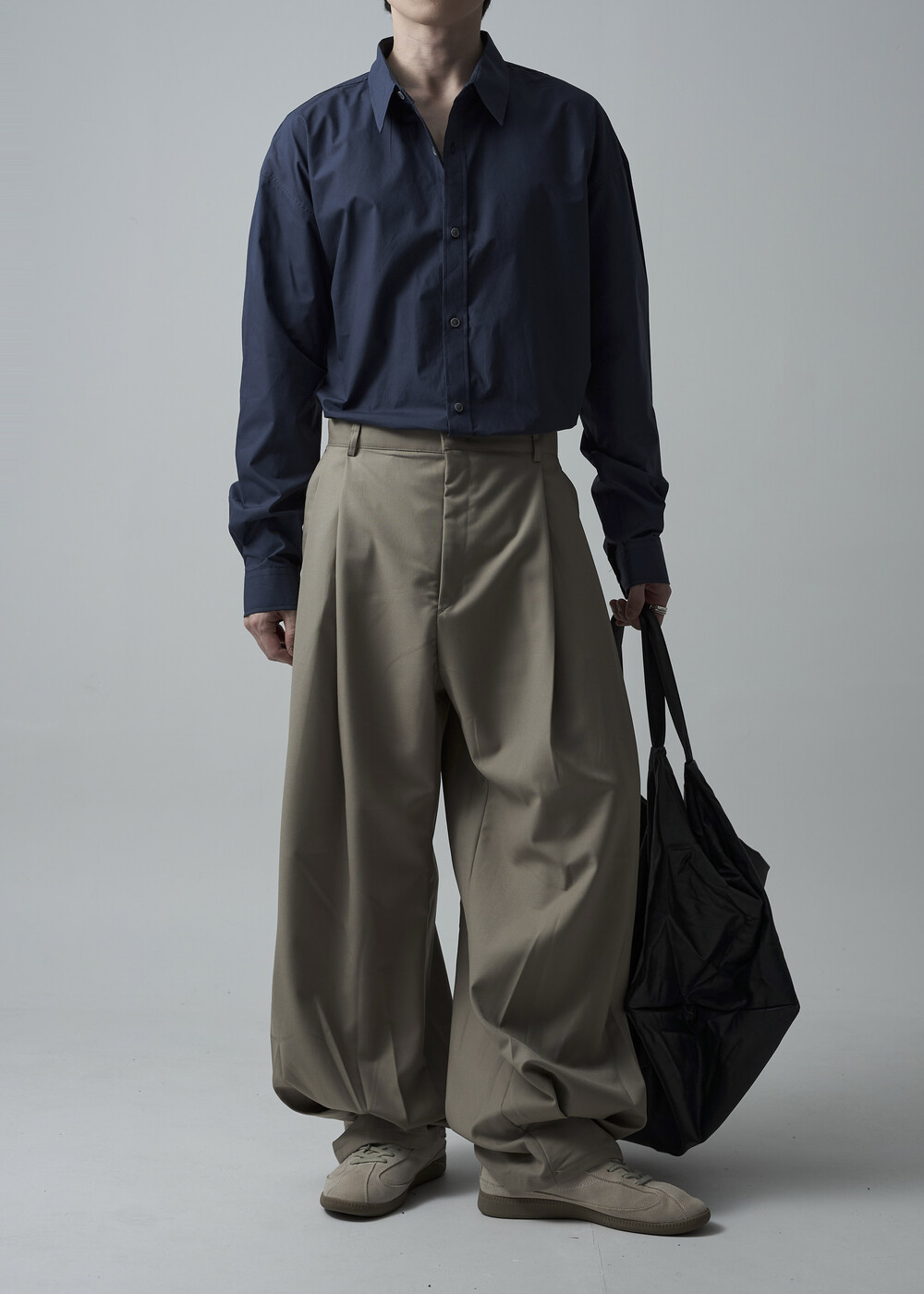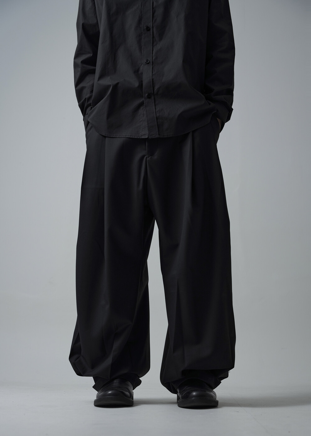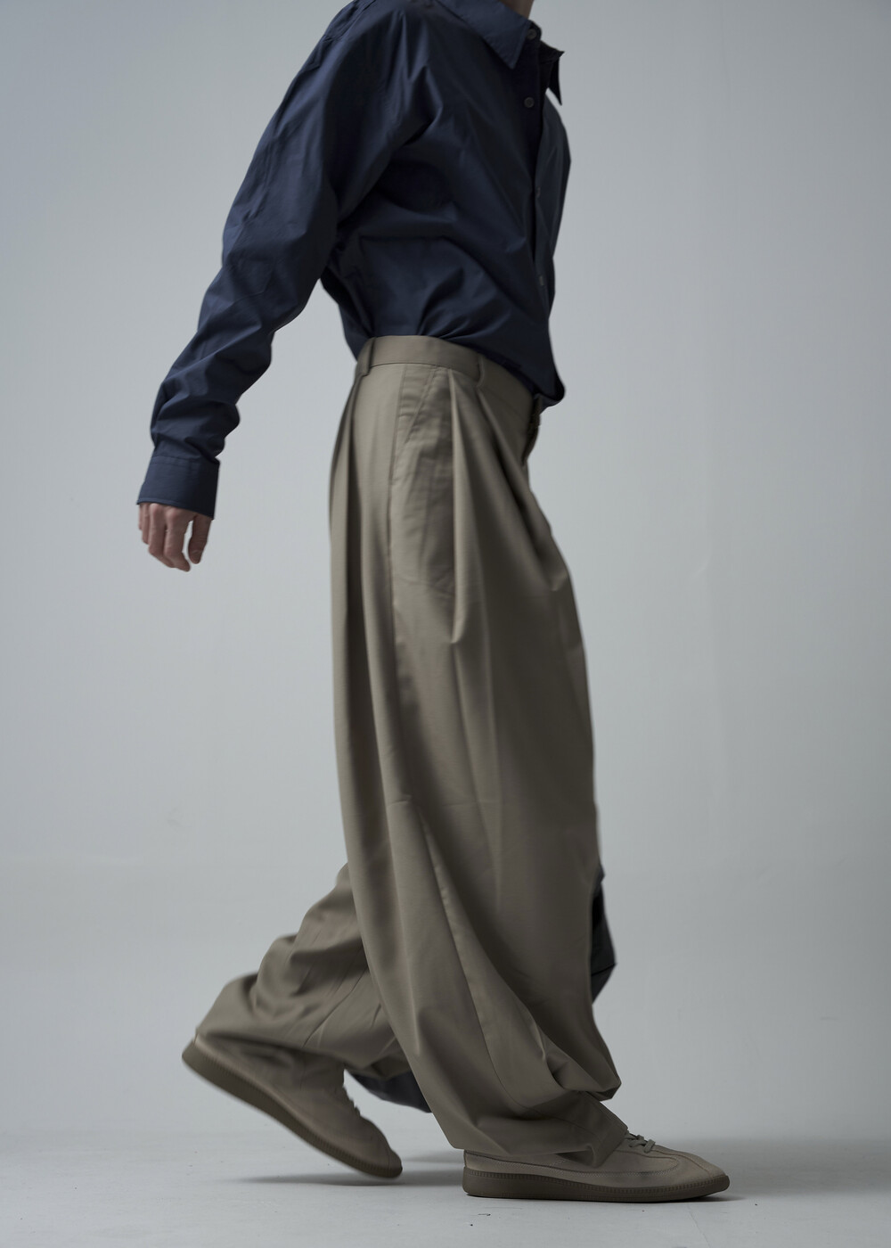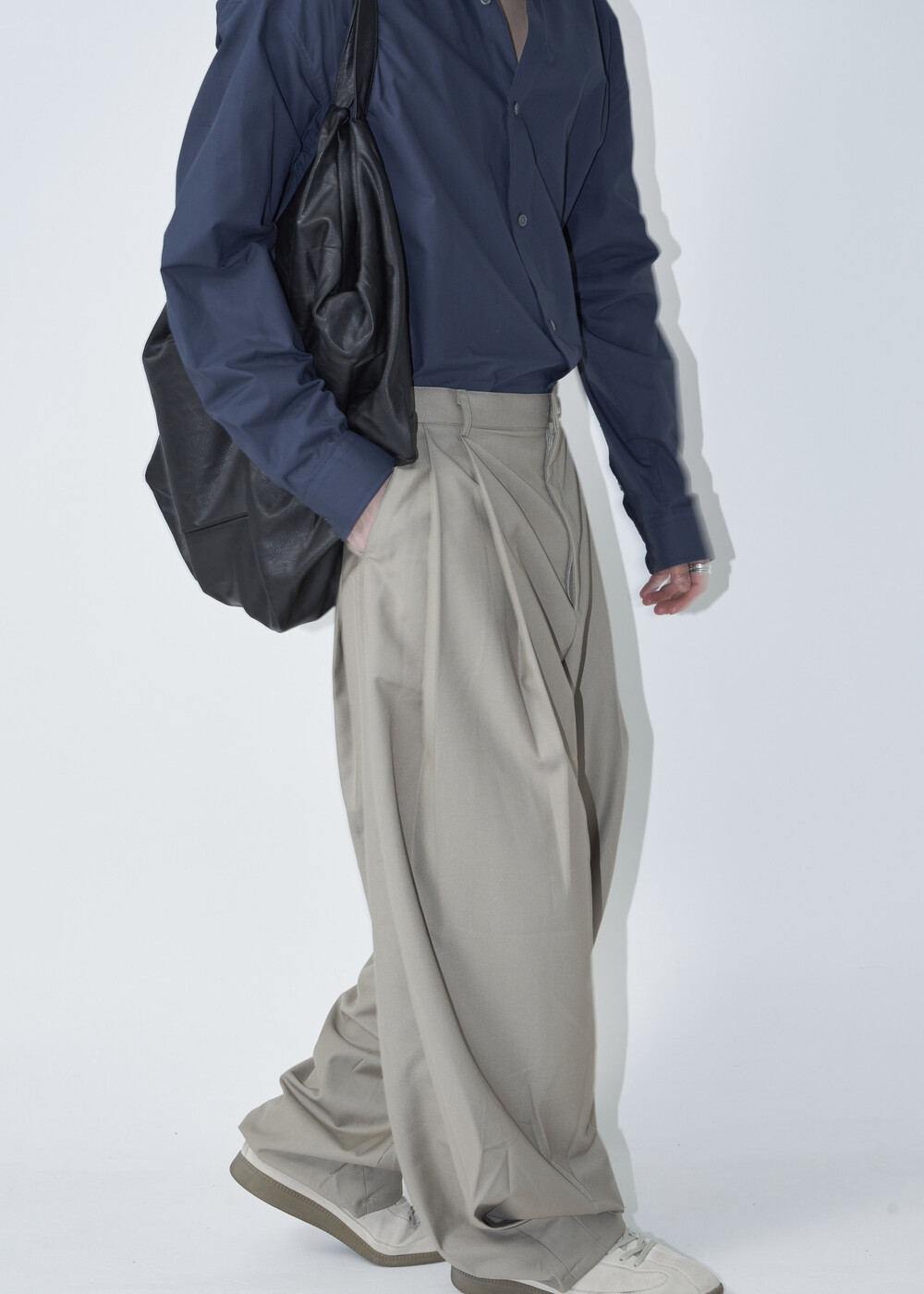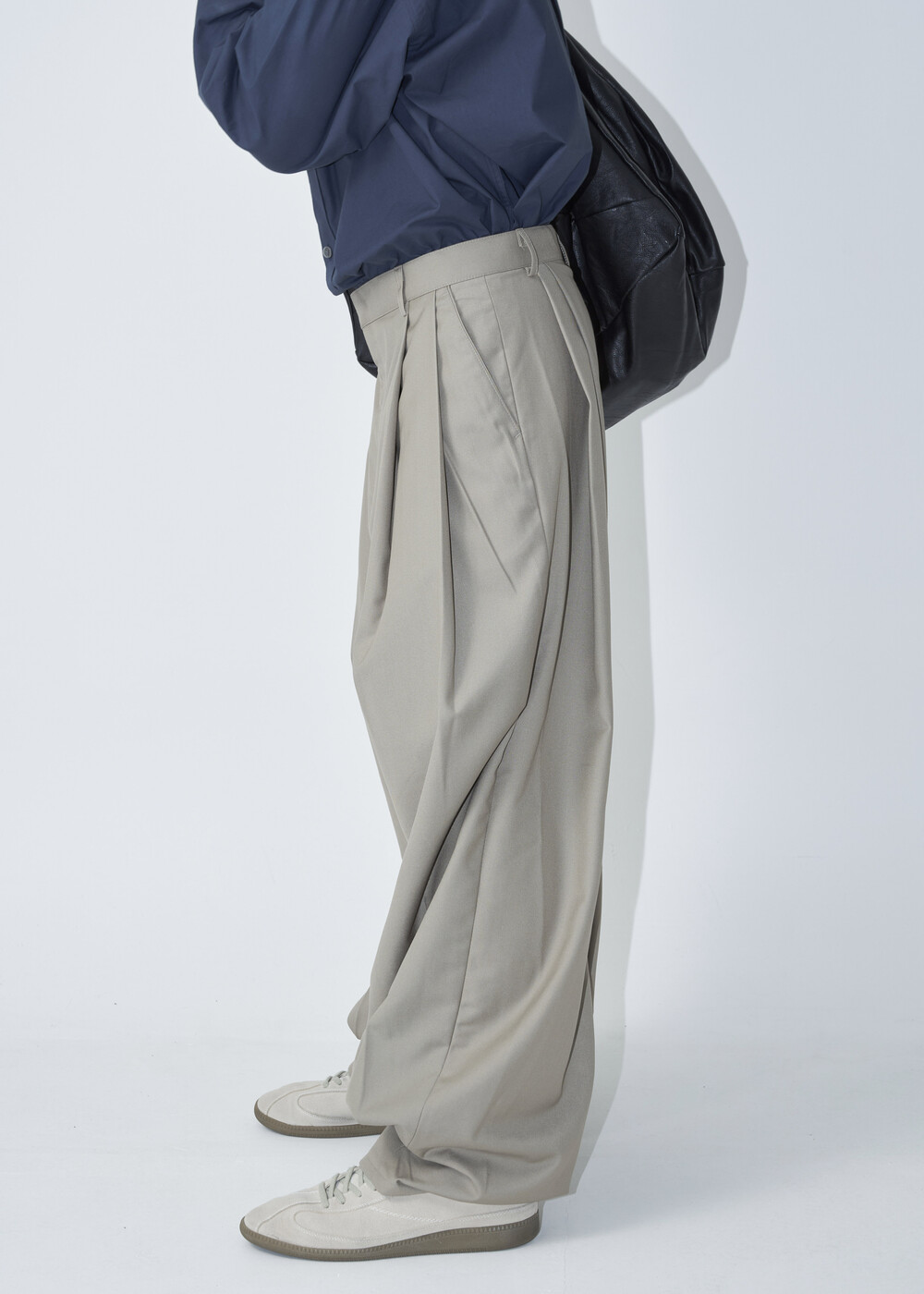 - 전면부 투 핀턱, 후면부 쓰리 핀턱을 중심으로 흐르는 듯한 실루엣을 연출하면서도 밑단 부분의 다트 디테일을 통해 유니크한 핏을 연출하는 와이드 슬렉스 제품,