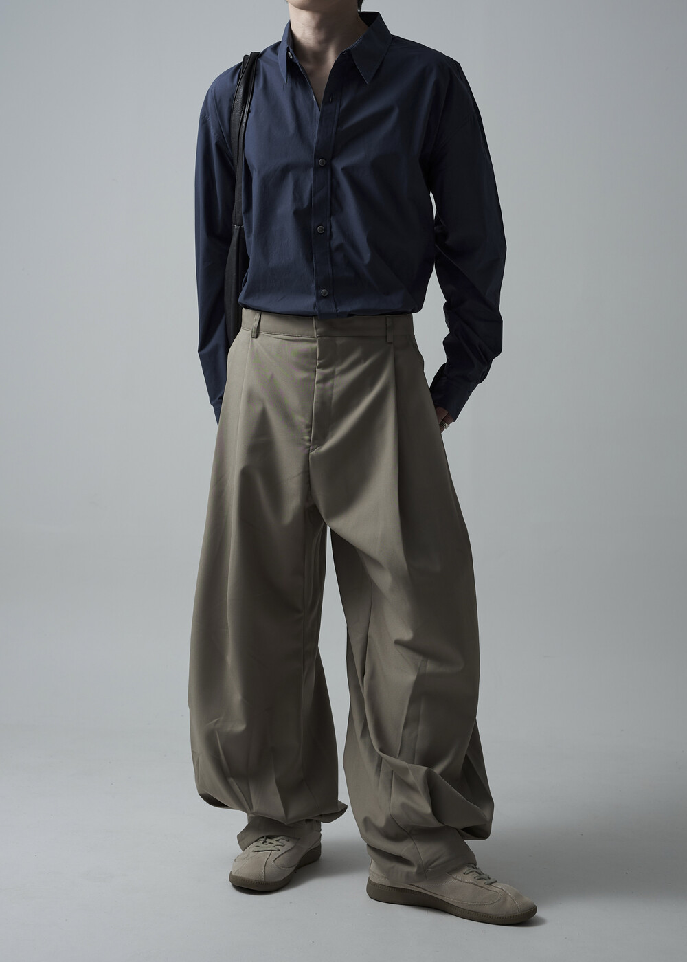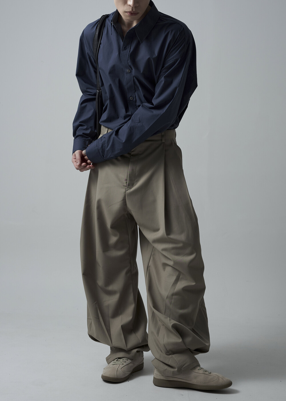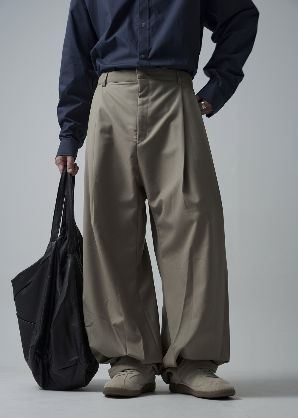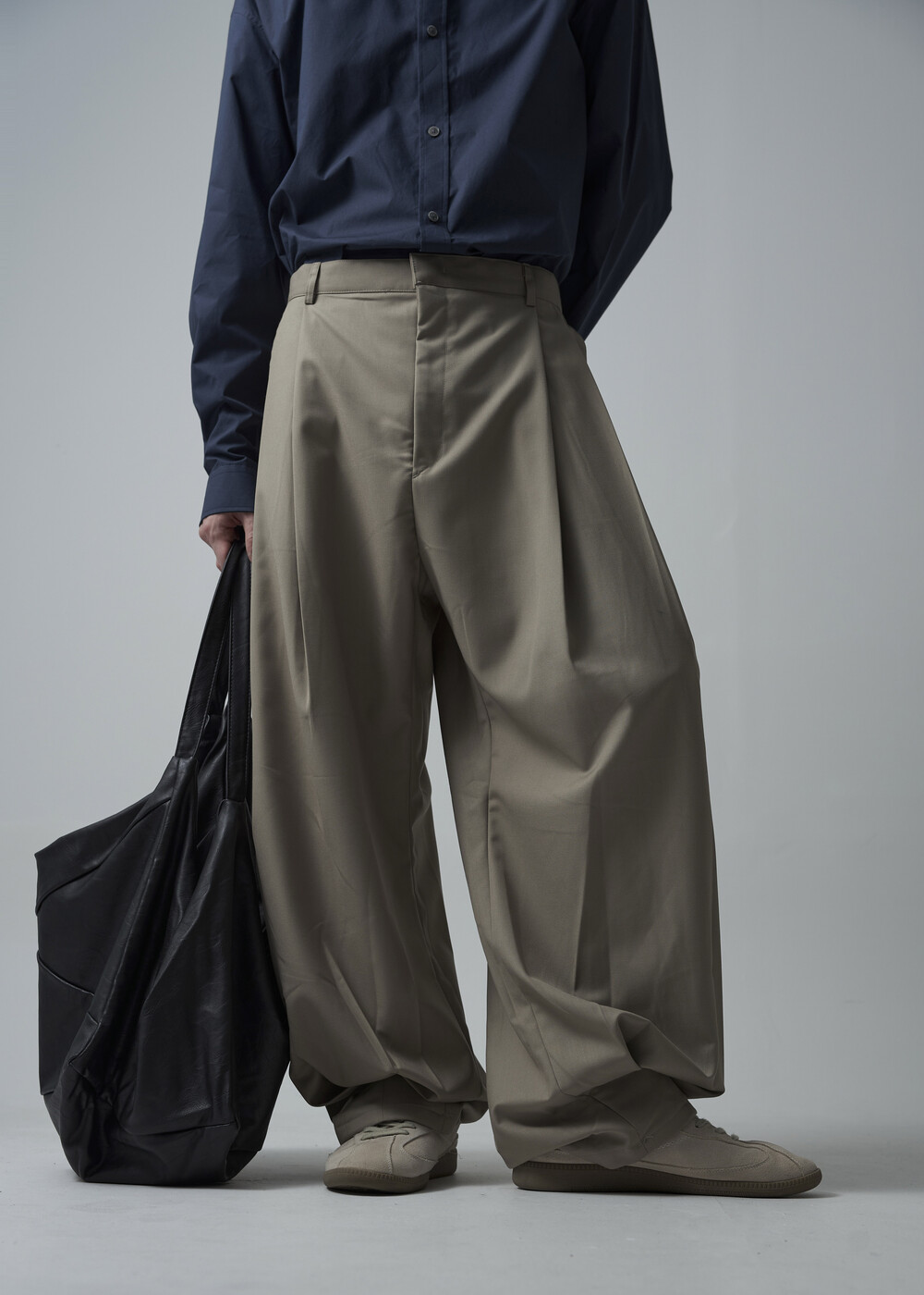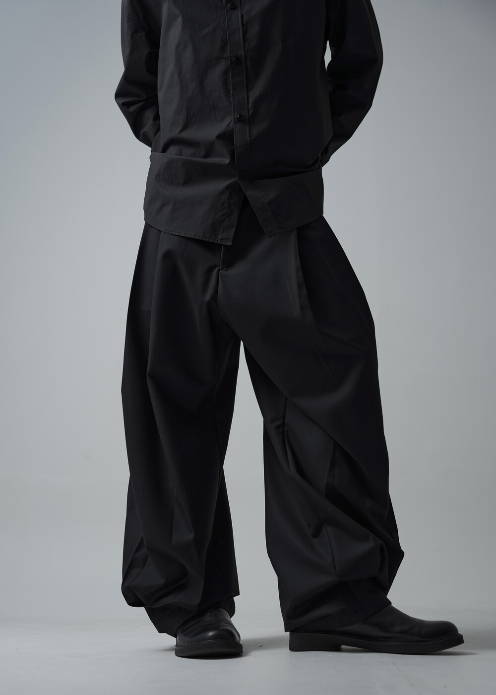 - 전면부 투 핀턱, 후면부 쓰리 핀턱을 중심으로 흐르는 듯한 실루엣을 연출하면서도 밑단 부분의 다트 디테일을 통해 유니크한 핏을 연출하는 와이드 슬렉스 제품,