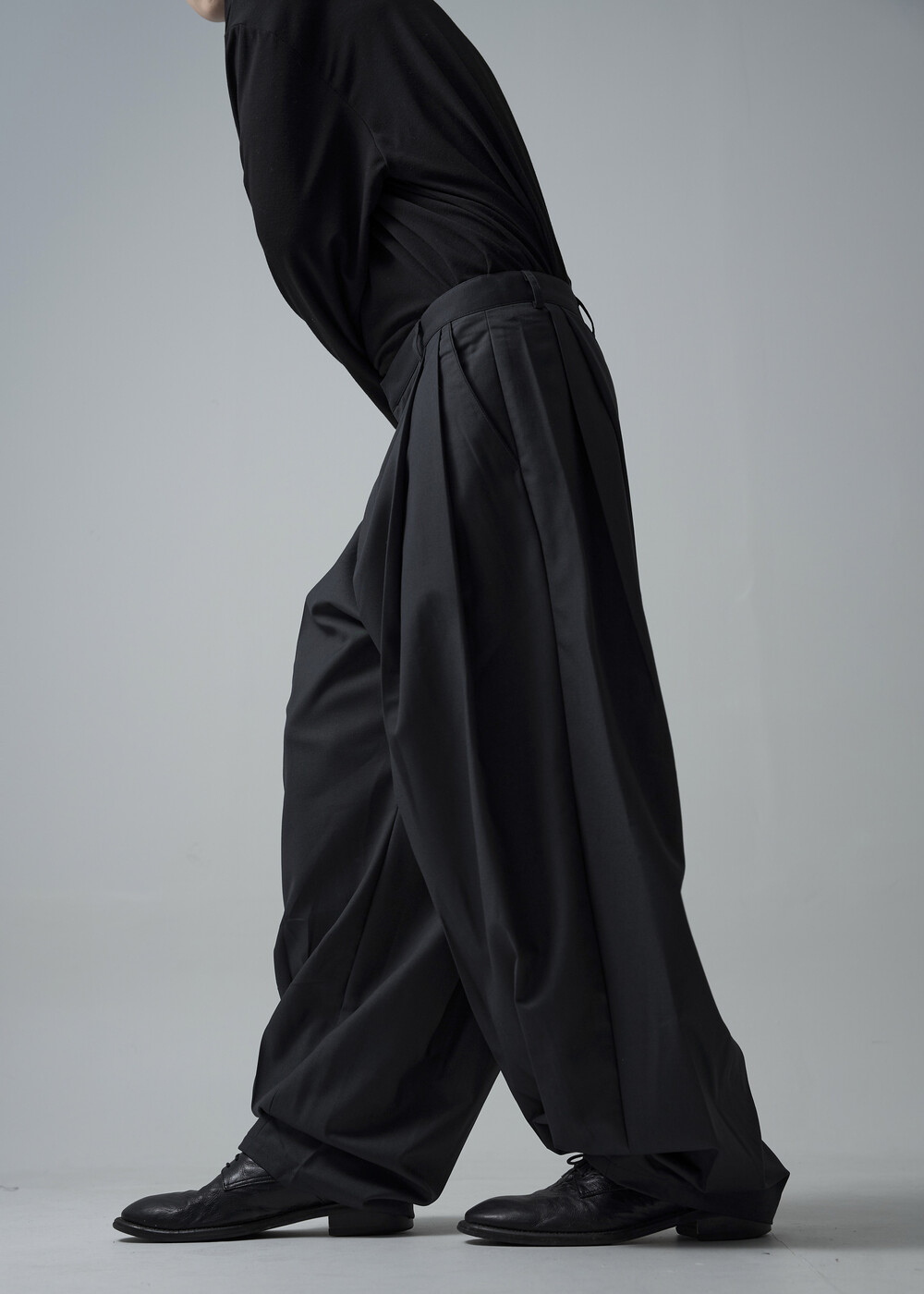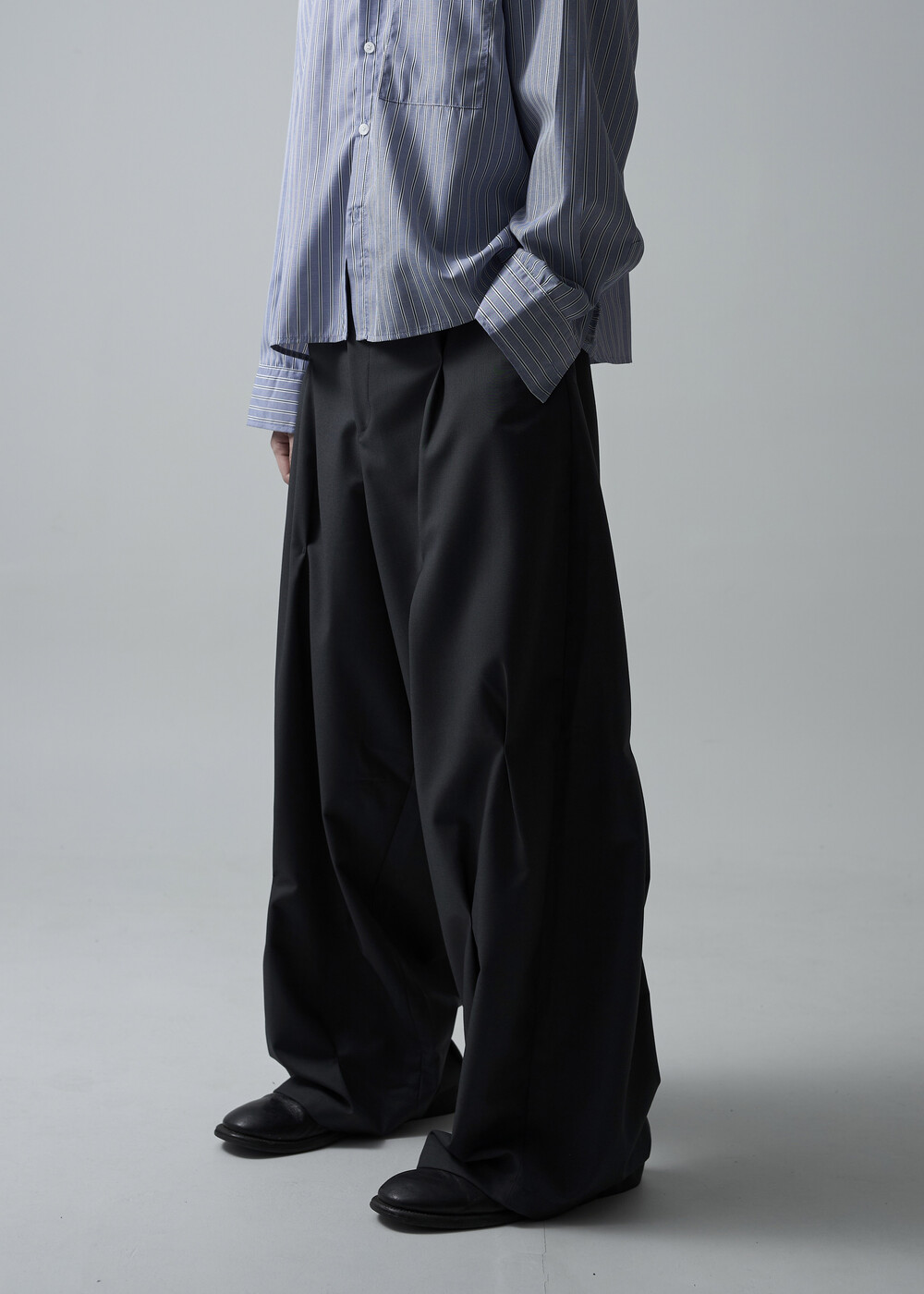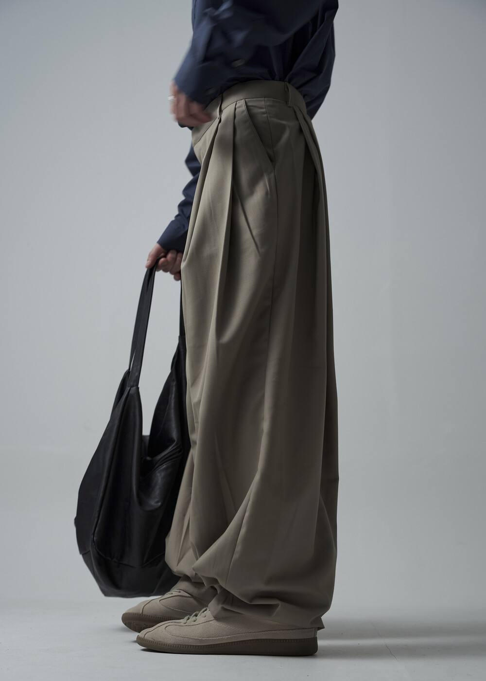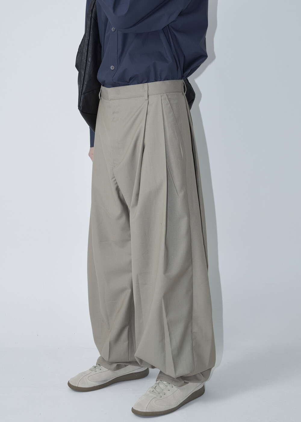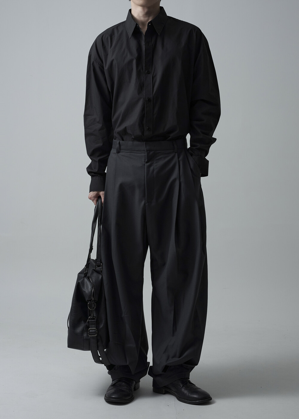 - 전면부 투 핀턱, 후면부 쓰리 핀턱을 중심으로 흐르는 듯한 실루엣을 연출하면서도 밑단 부분의 다트 디테일을 통해 유니크한 핏을 연출하는 와이드 슬렉스 제품,