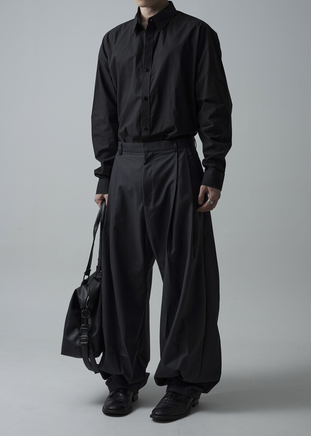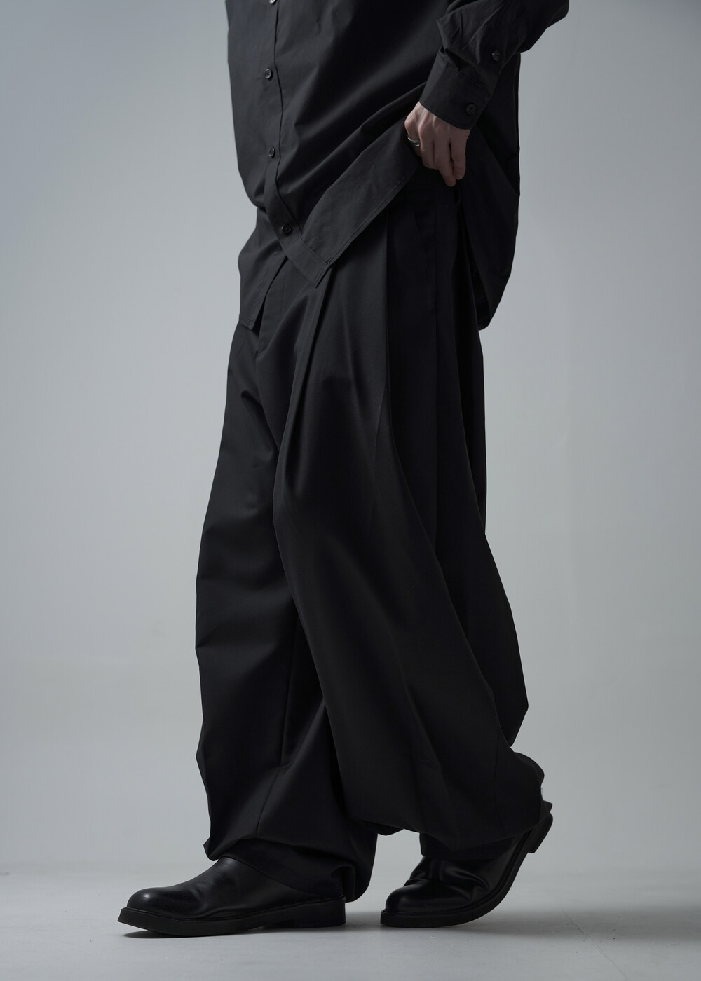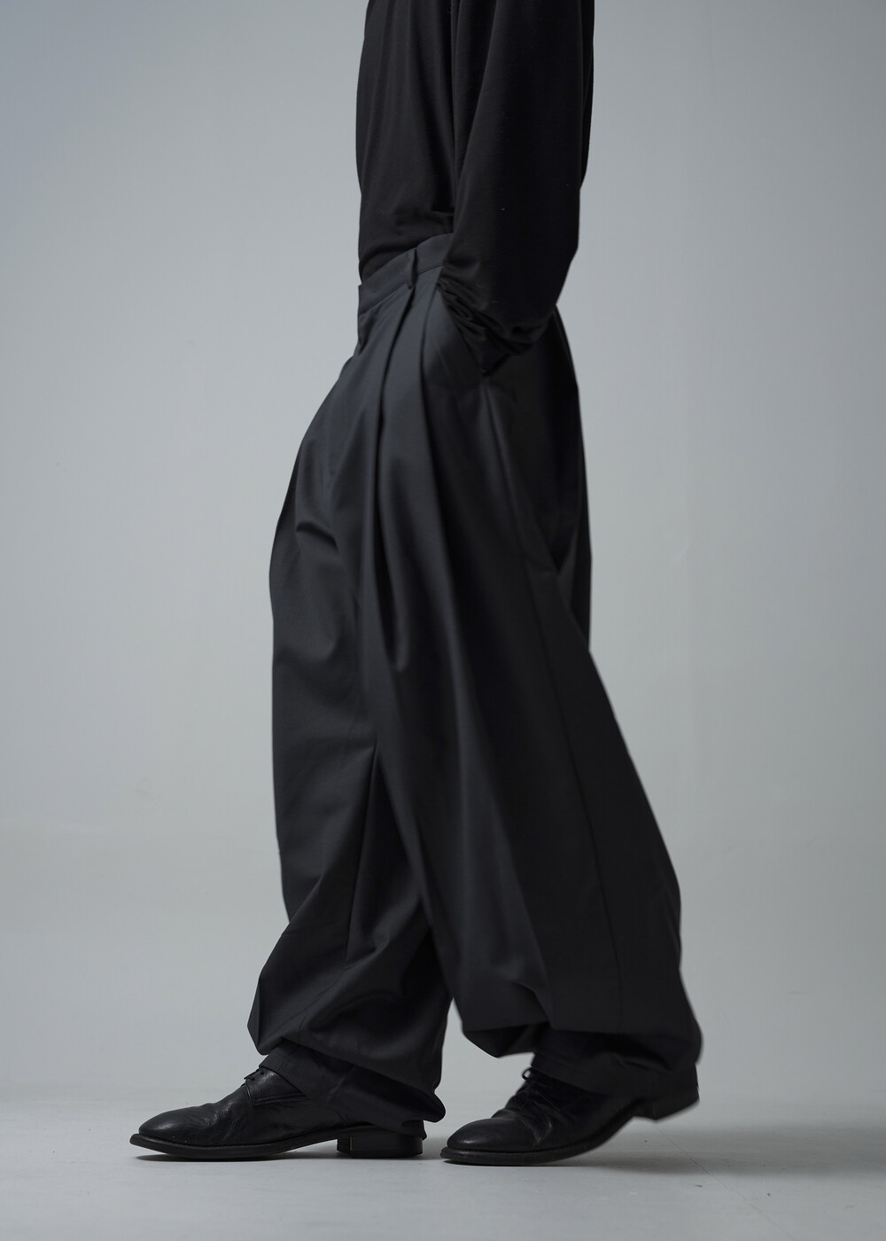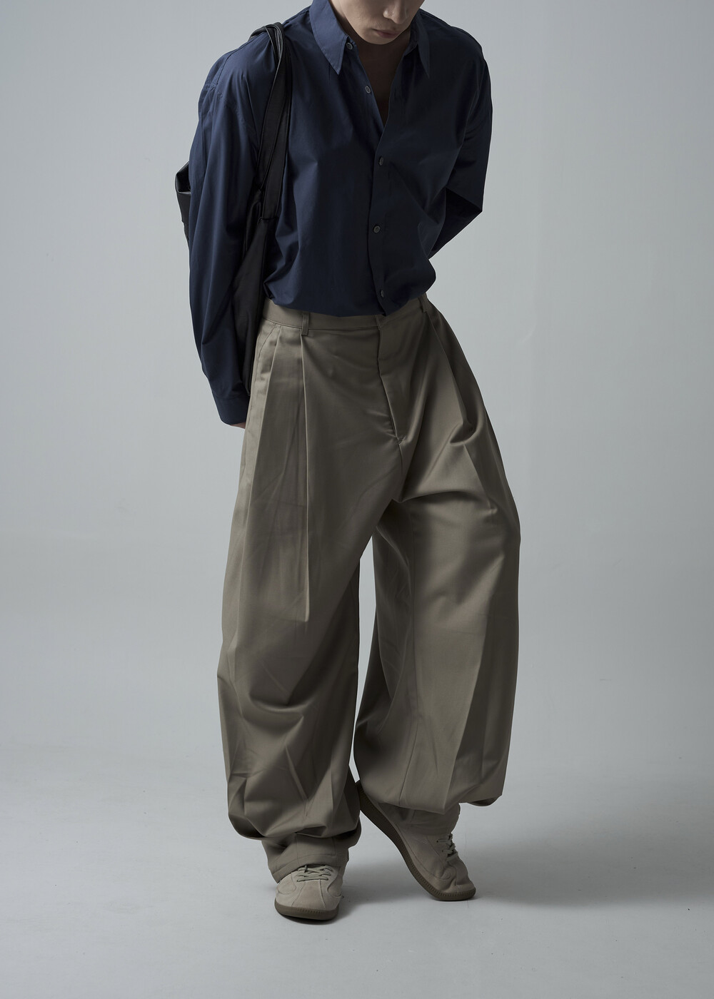 - 전면부 투 핀턱, 후면부 쓰리 핀턱을 중심으로 흐르는 듯한 실루엣을 연출하면서도 밑단 부분의 다트 디테일을 통해 유니크한 핏을 연출하는 와이드 슬렉스 제품,