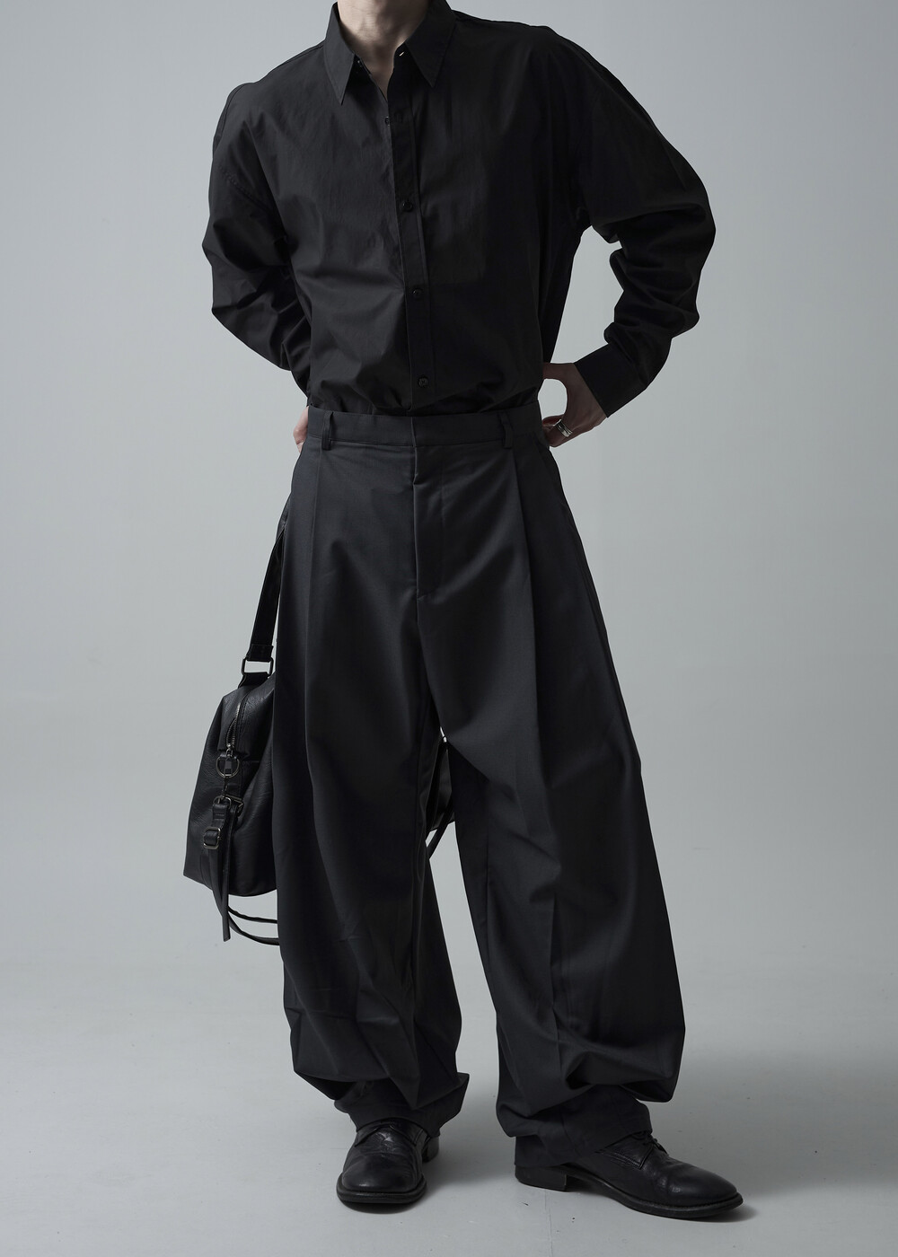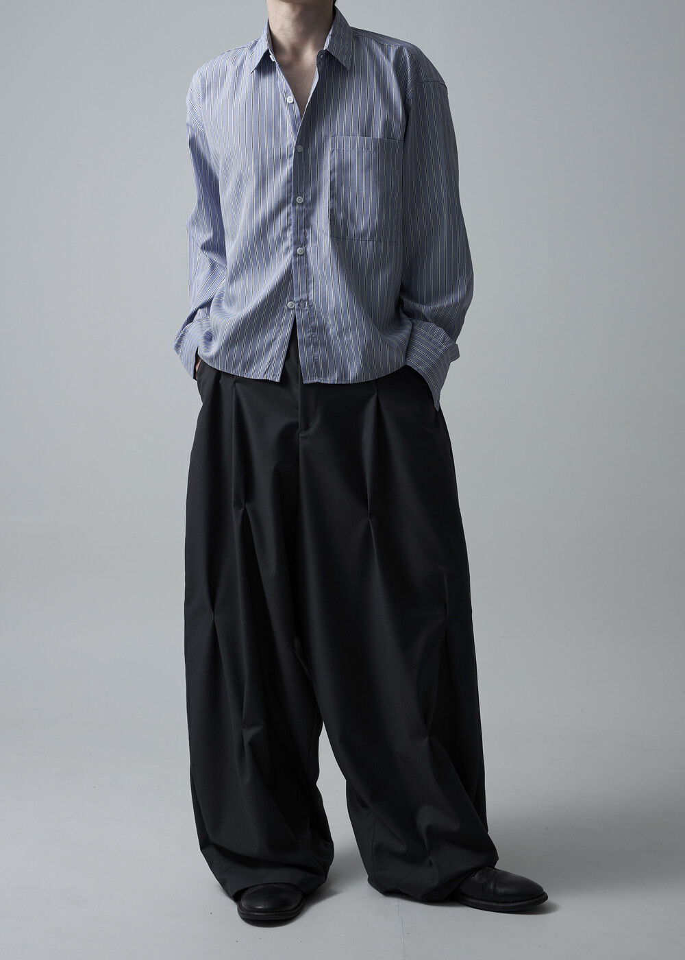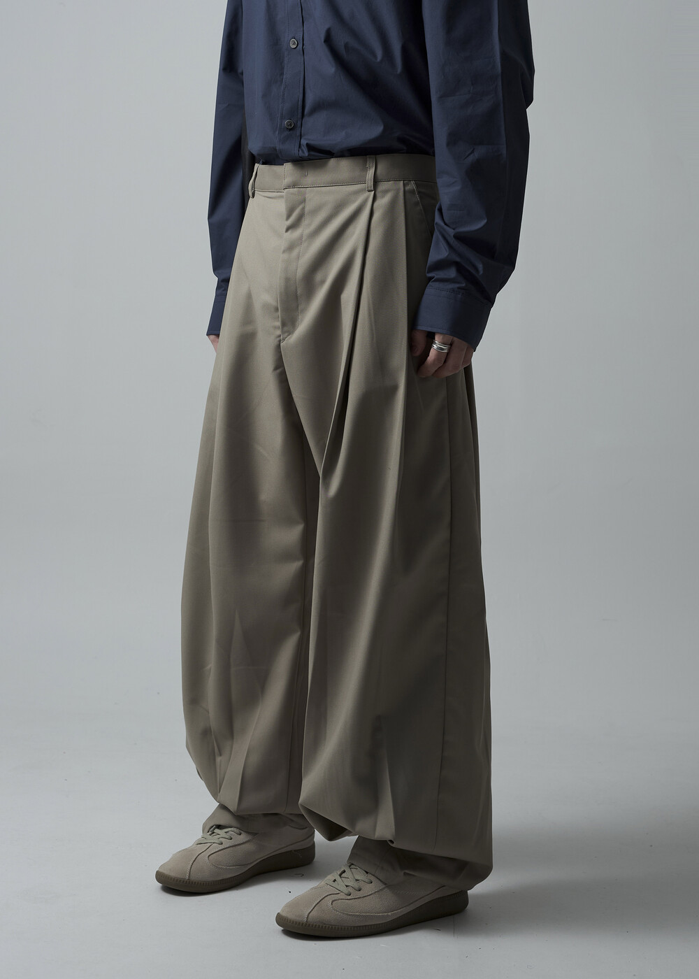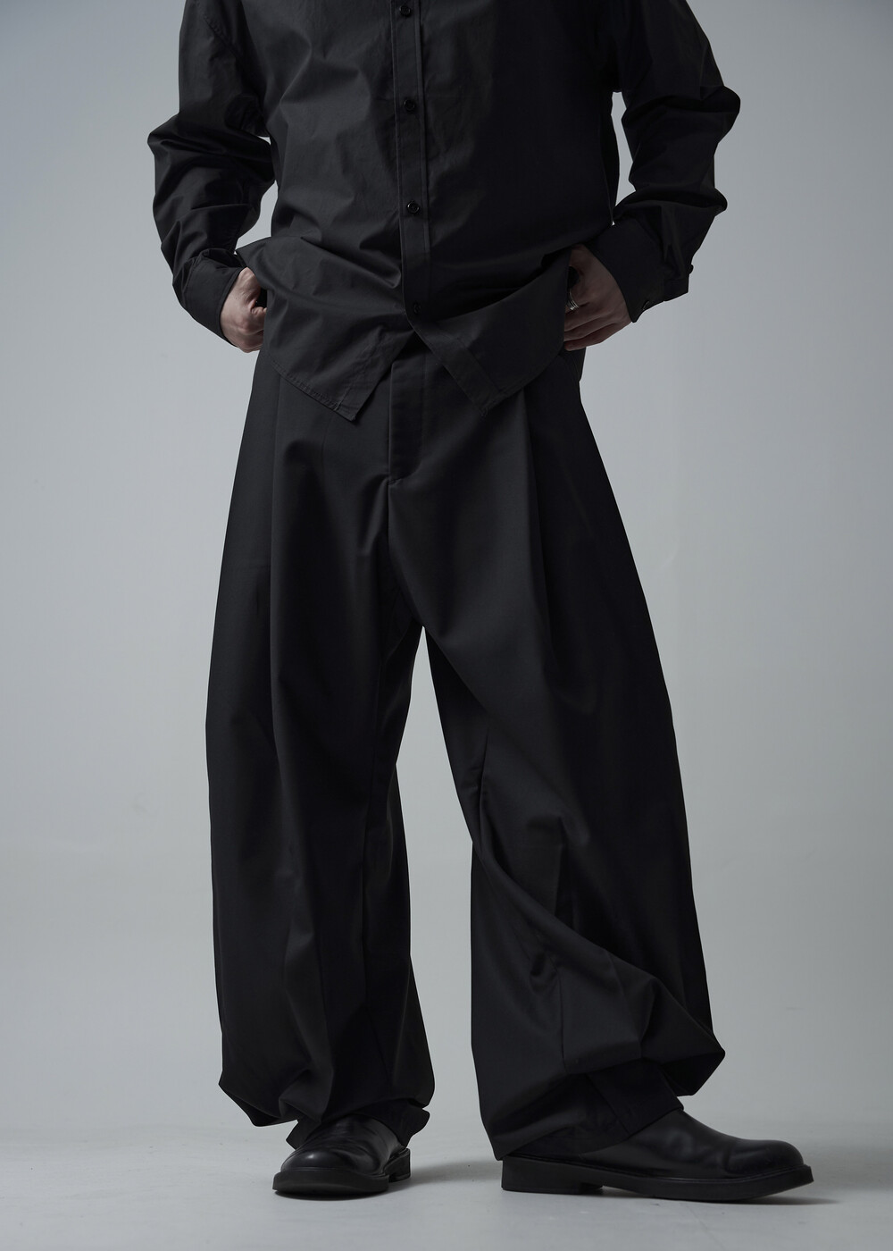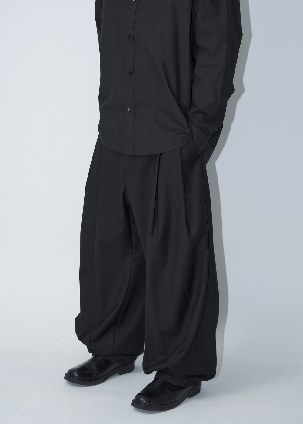- 전면부 투 핀턱, 후면부 쓰리 핀턱을 중심으로 흐르는 듯한 실루엣을 연출하면서도 밑단 부분의 다트 디테일을 통해 유니크한 핏을 연출하는 와이드 슬렉스 제품,