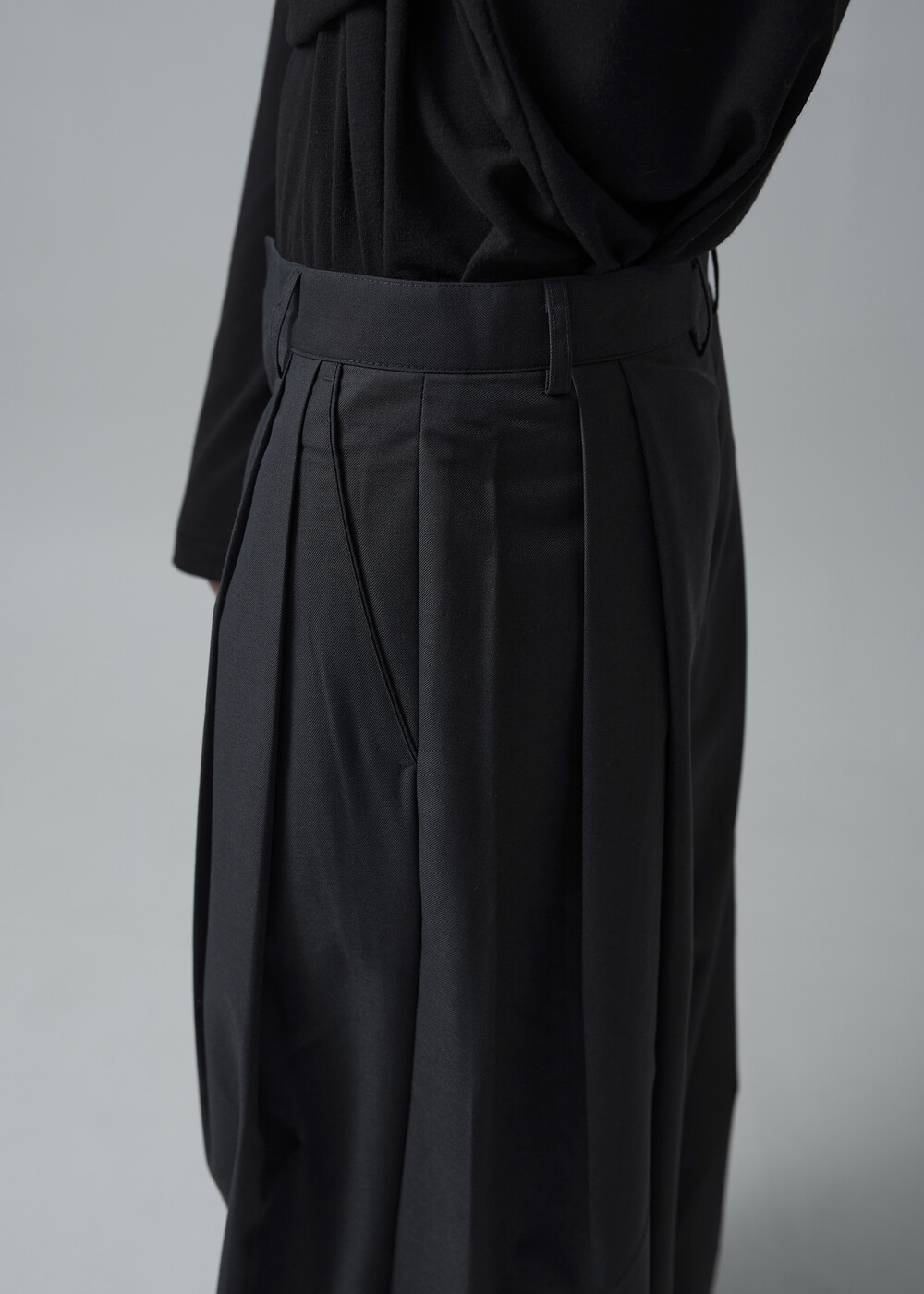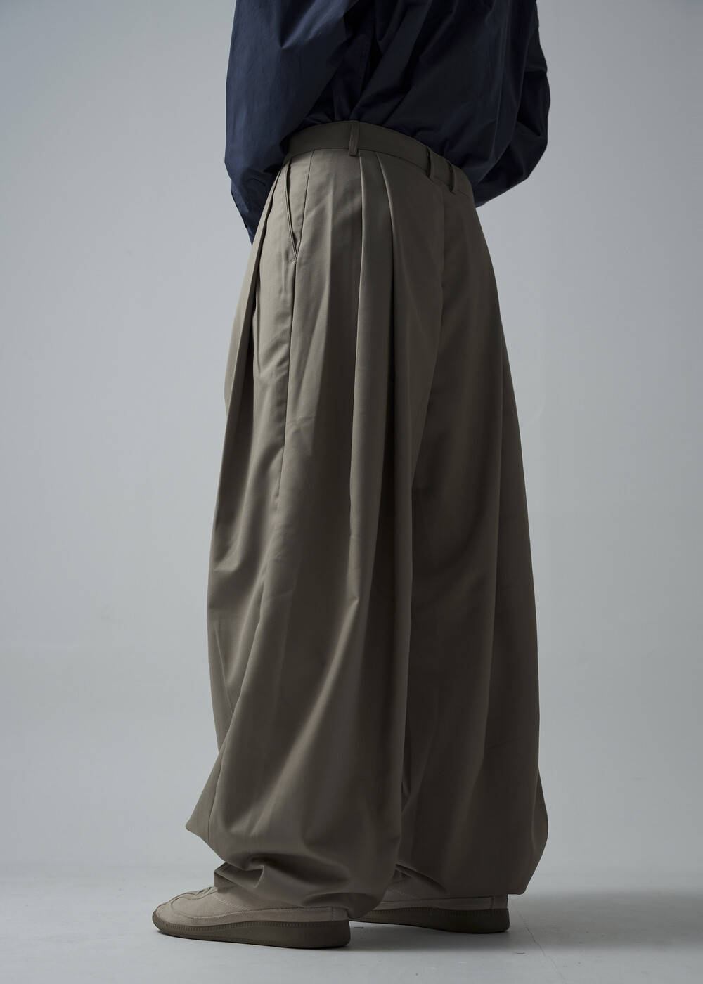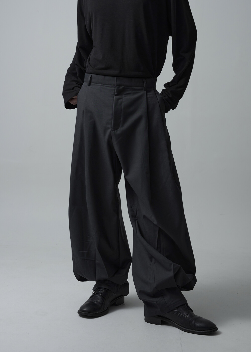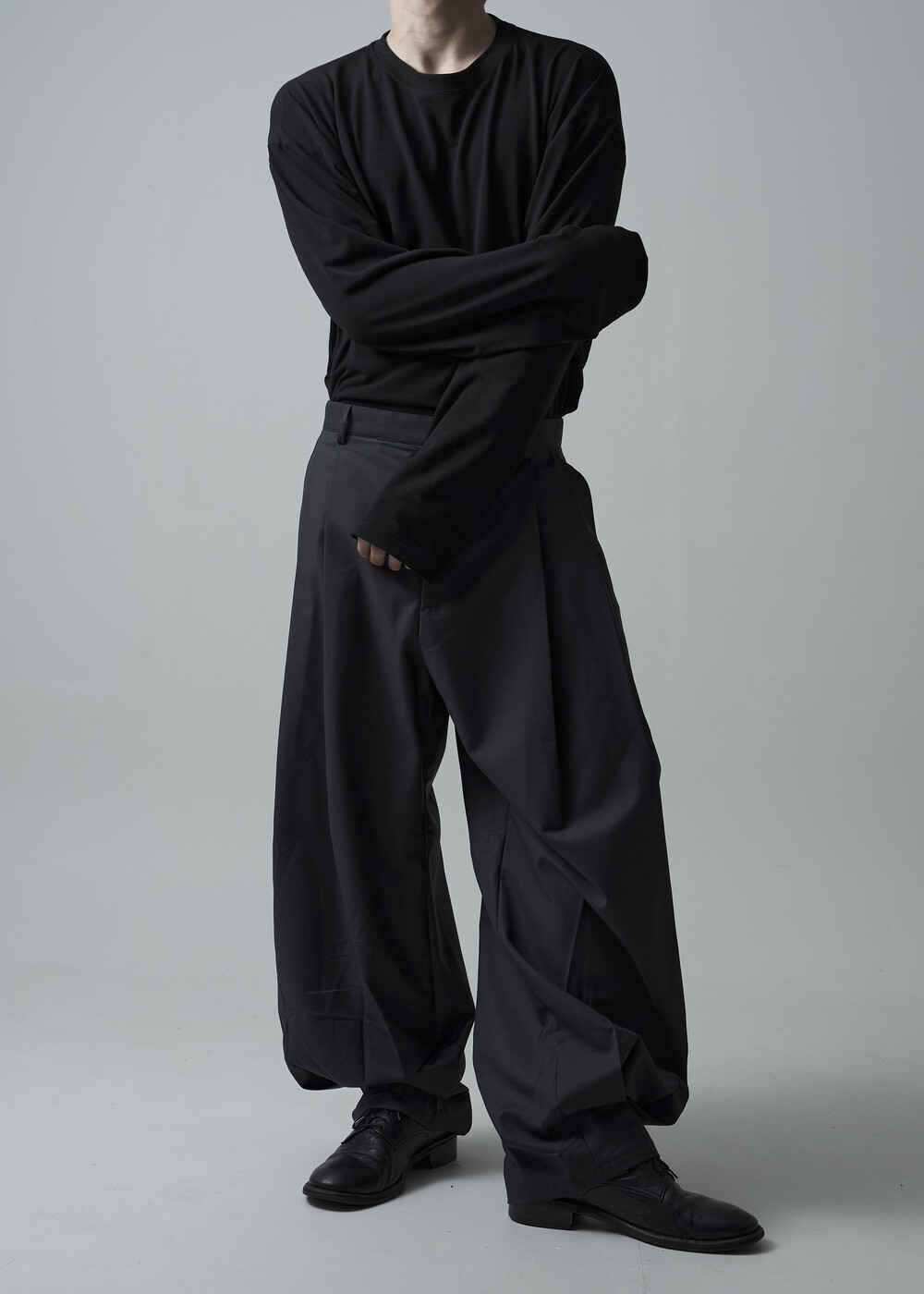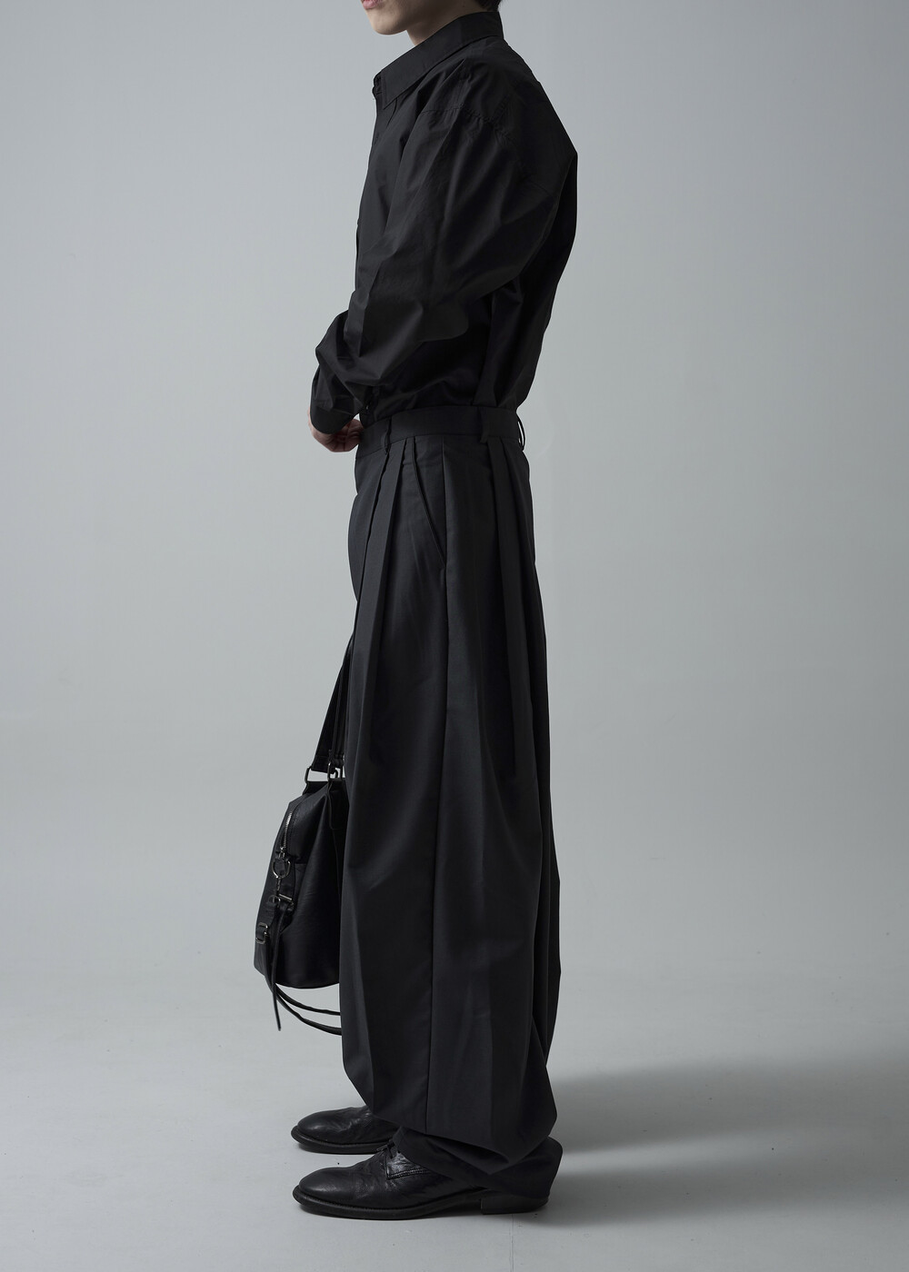 - 전면부 투 핀턱, 후면부 쓰리 핀턱을 중심으로 흐르는 듯한 실루엣을 연출하면서도 밑단 부분의 다트 디테일을 통해 유니크한 핏을 연출하는 와이드 슬렉스 제품,