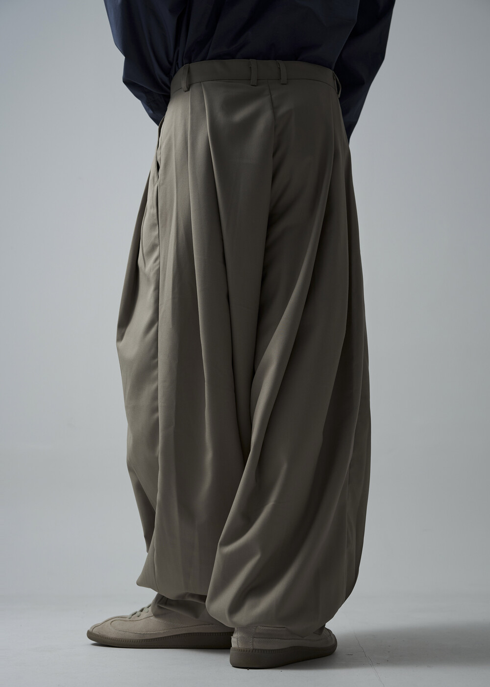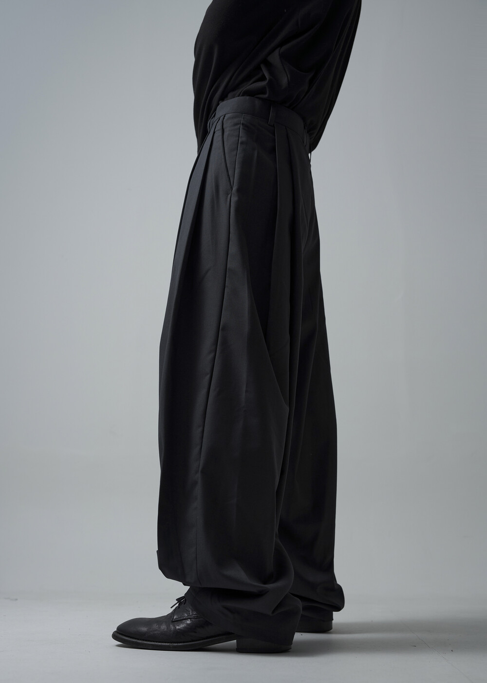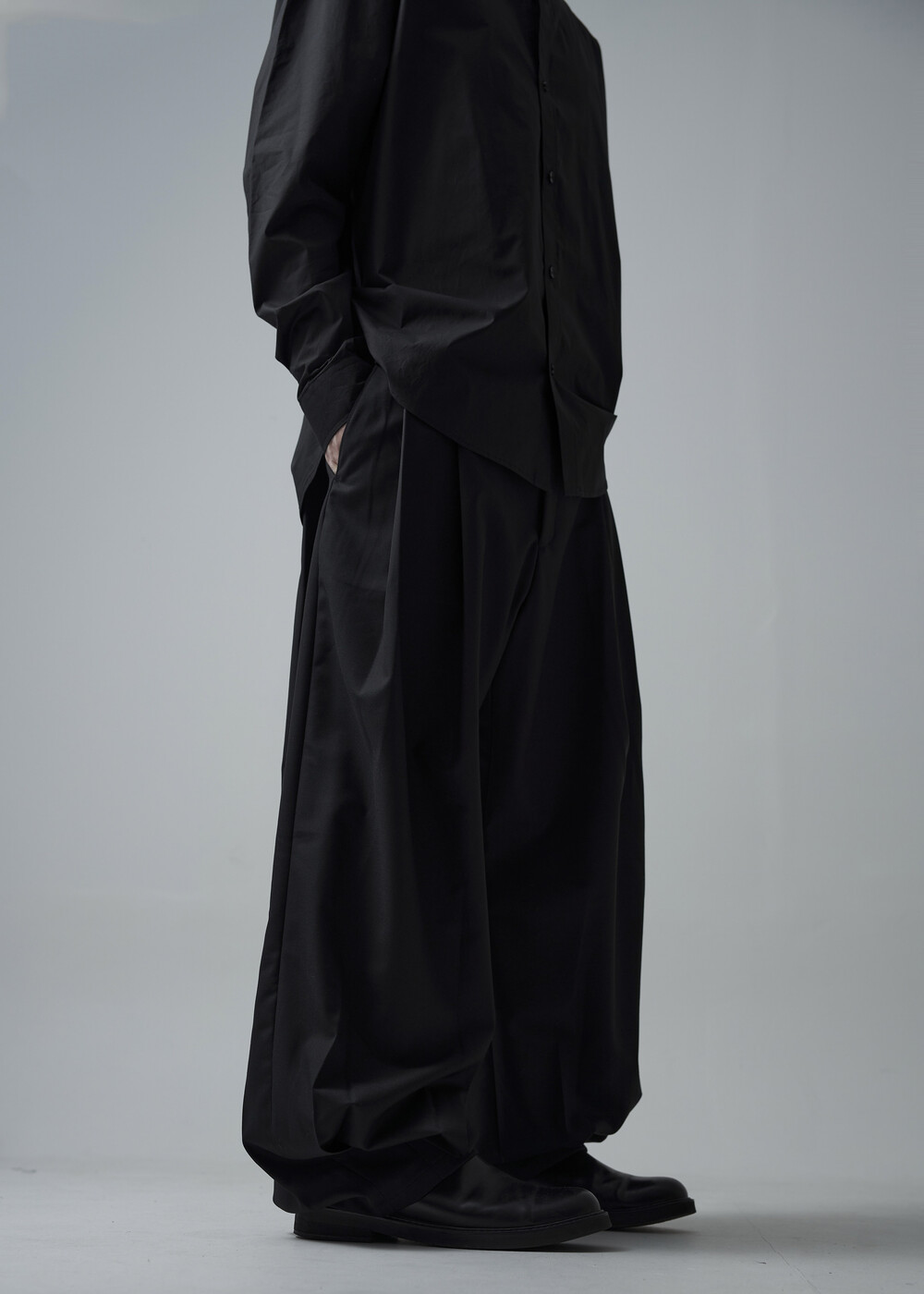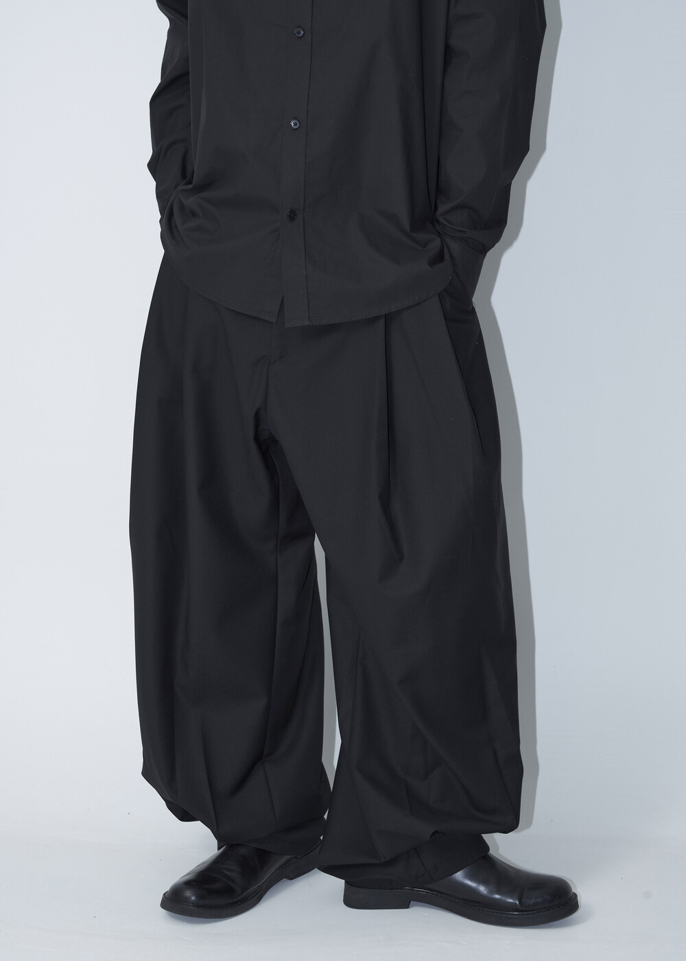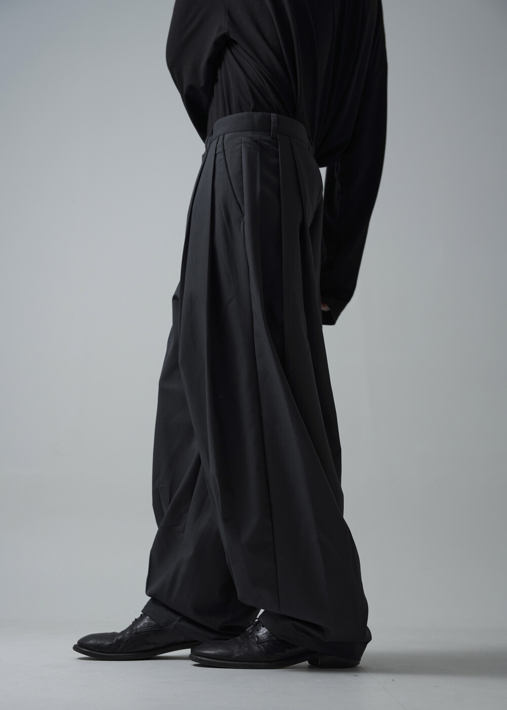 - 전면부 투 핀턱, 후면부 쓰리 핀턱을 중심으로 흐르는 듯한 실루엣을 연출하면서도 밑단 부분의 다트 디테일을 통해 유니크한 핏을 연출하는 와이드 슬렉스 제품,