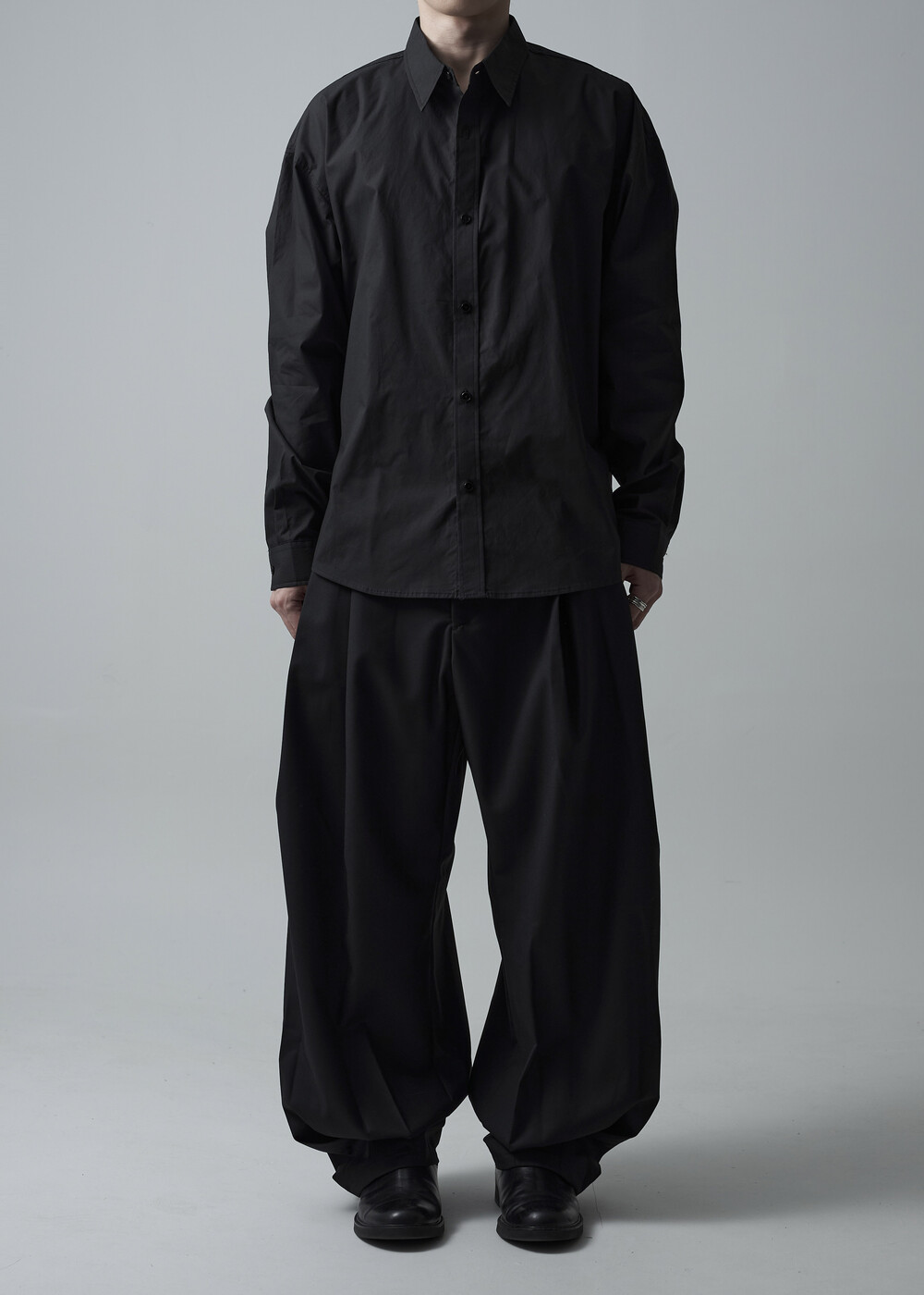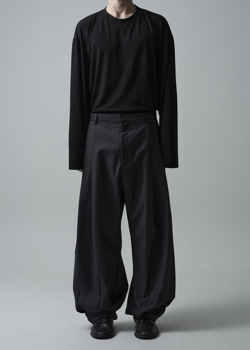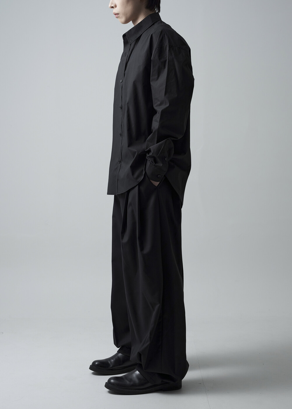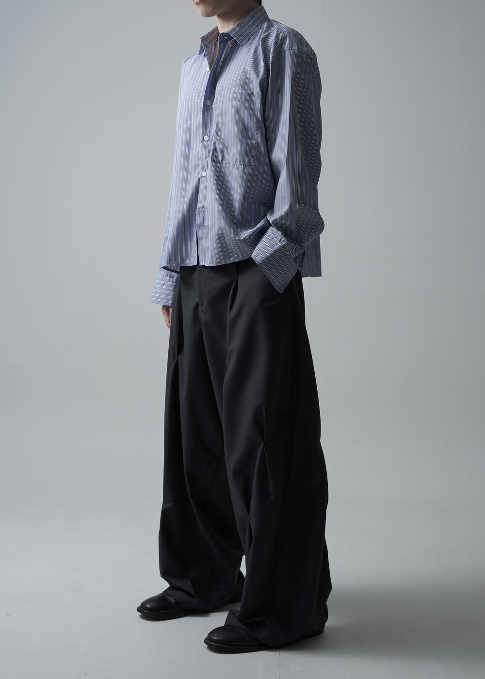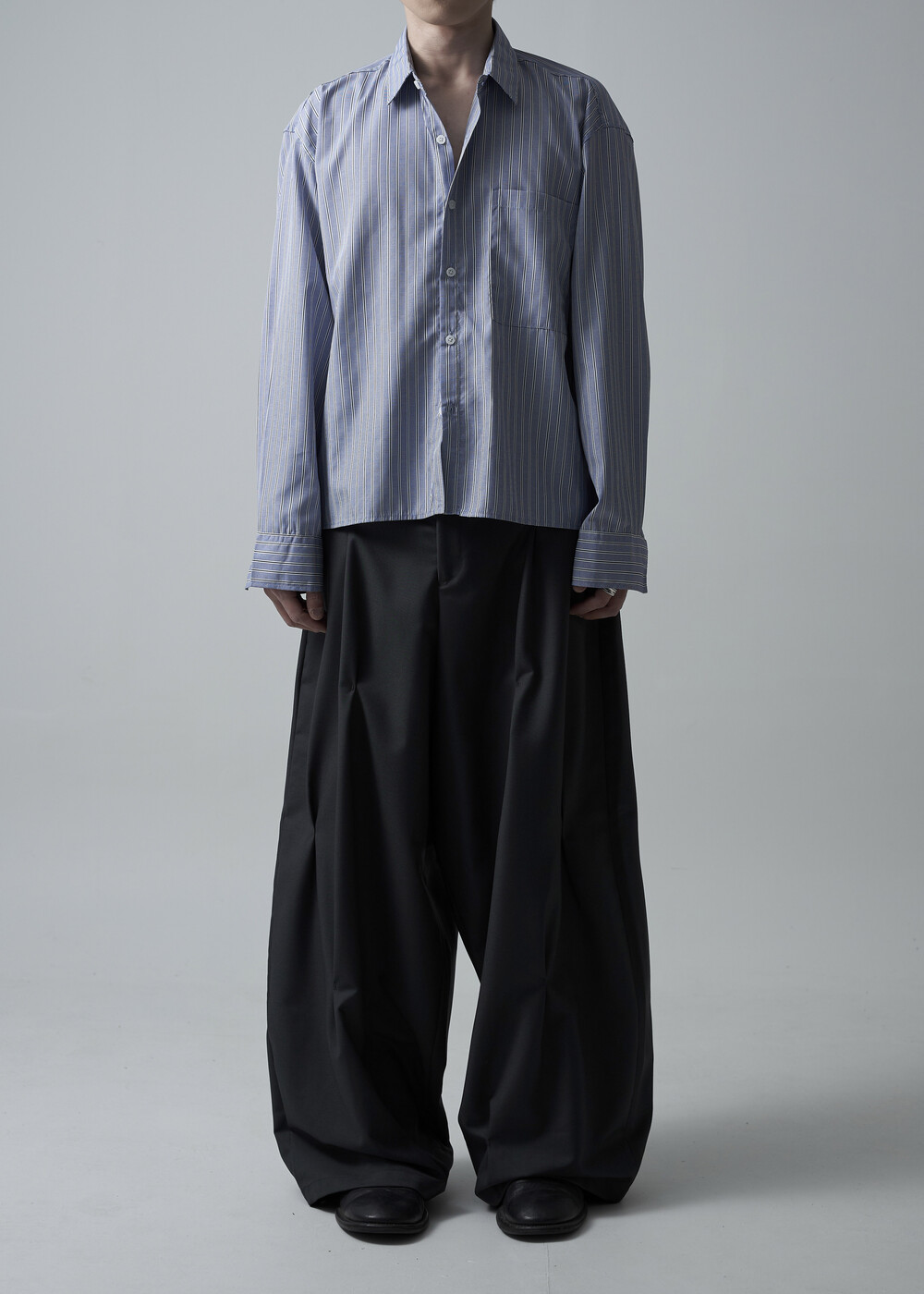 - 전면부 투 핀턱, 후면부 쓰리 핀턱을 중심으로 흐르는 듯한 실루엣을 연출하면서도 밑단 부분의 다트 디테일을 통해 유니크한 핏을 연출하는 와이드 슬렉스 제품,