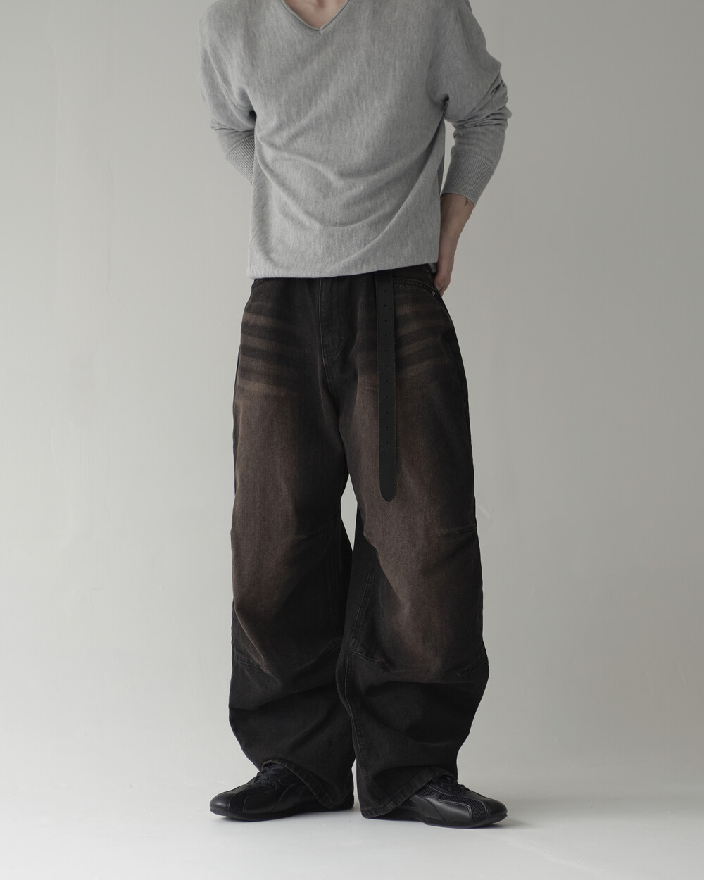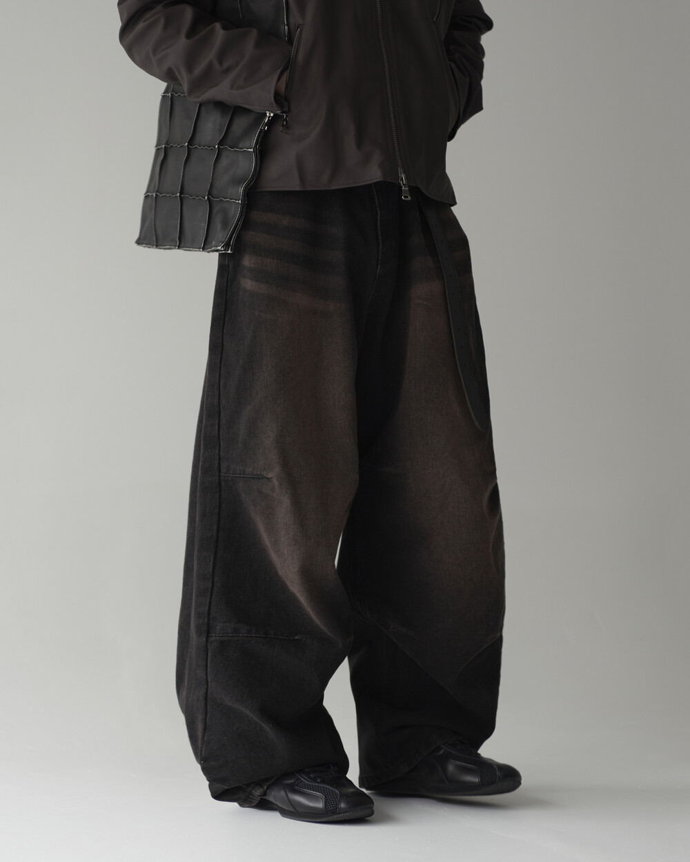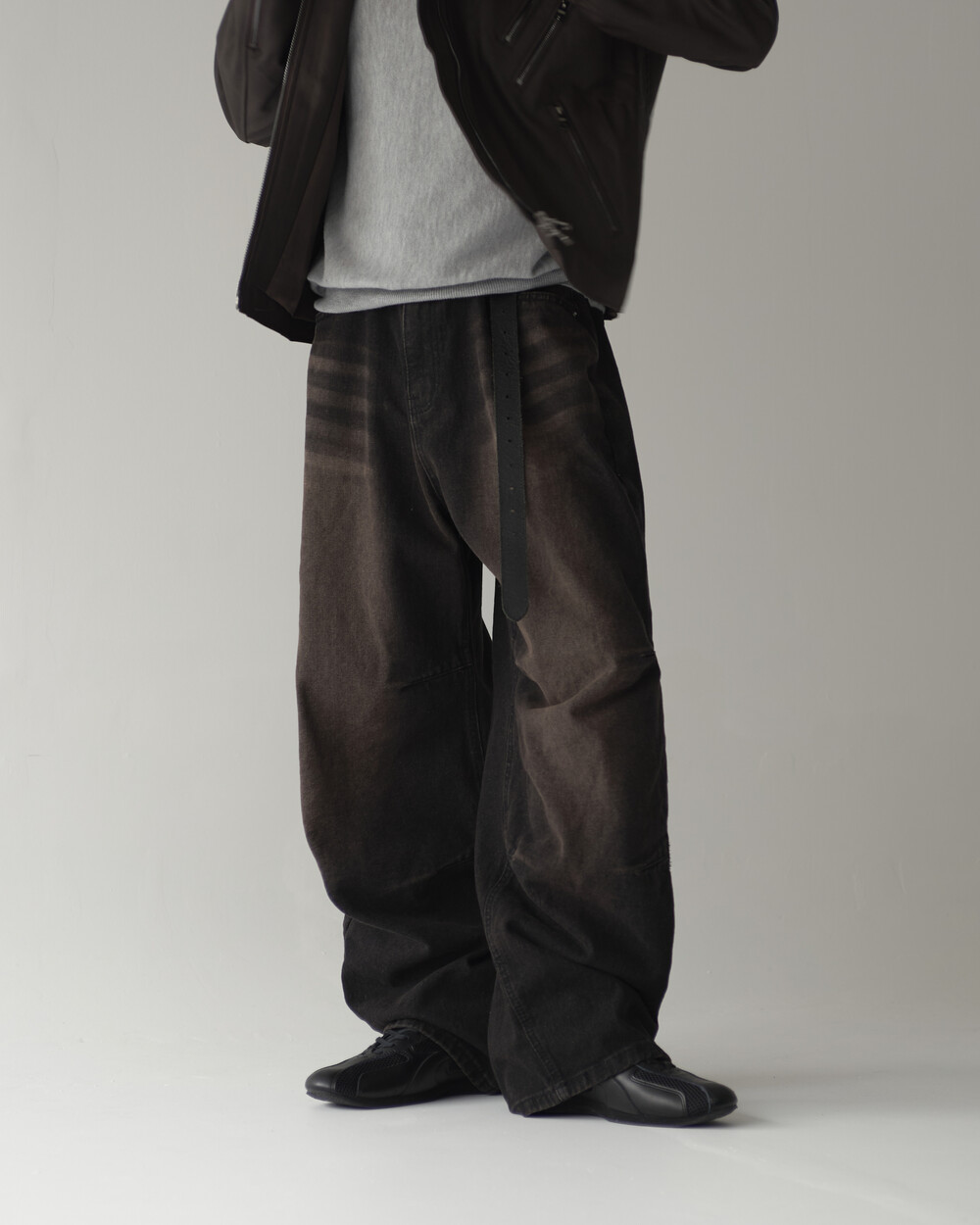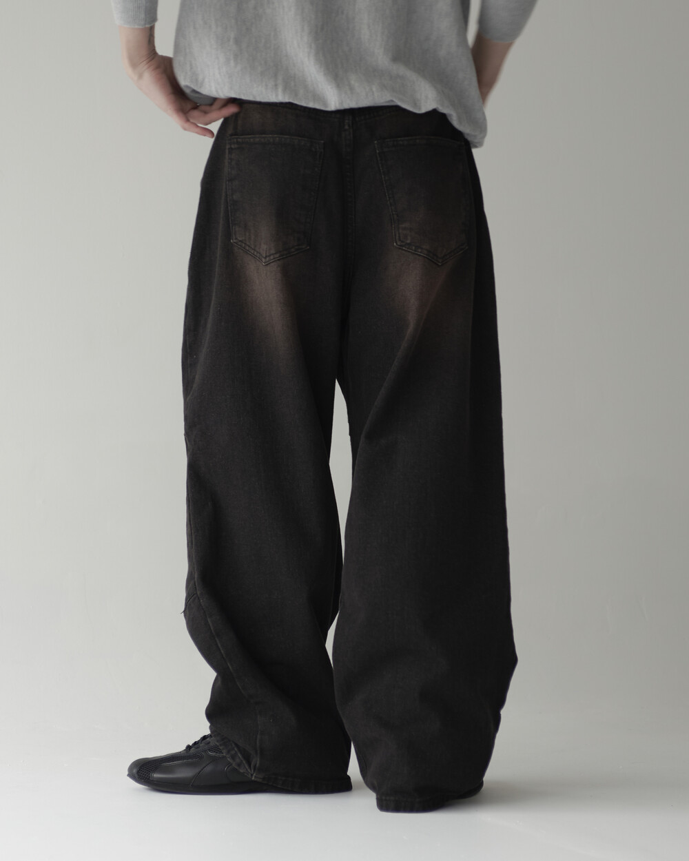 - 틴 워싱 처리과 다잉 염색을 통해 블랙 브라운 컬러감으로 연출된 와이드 데님 팬츠 제품입니다.