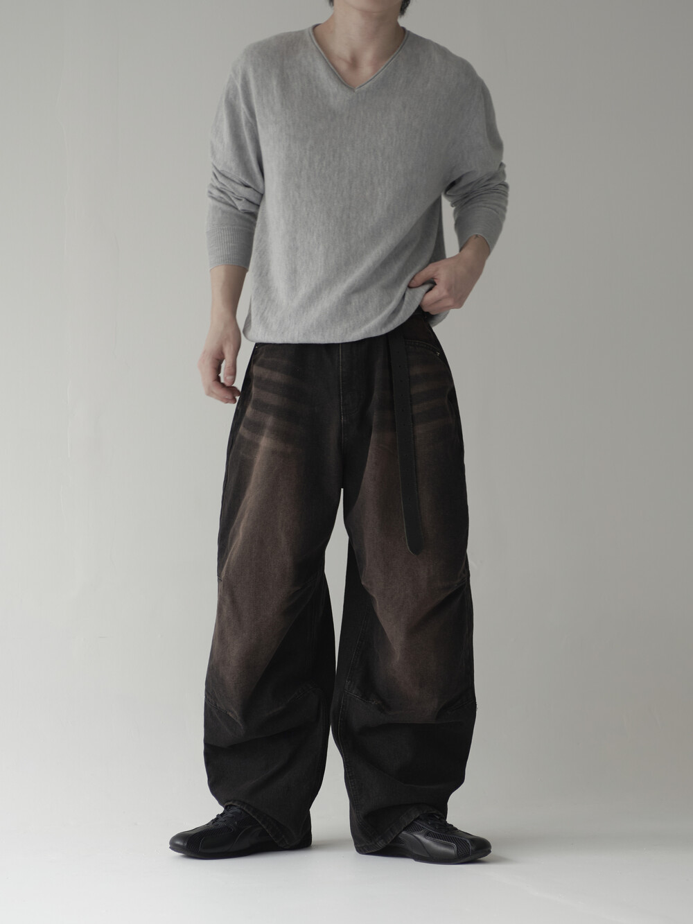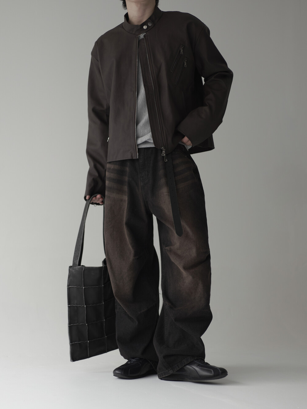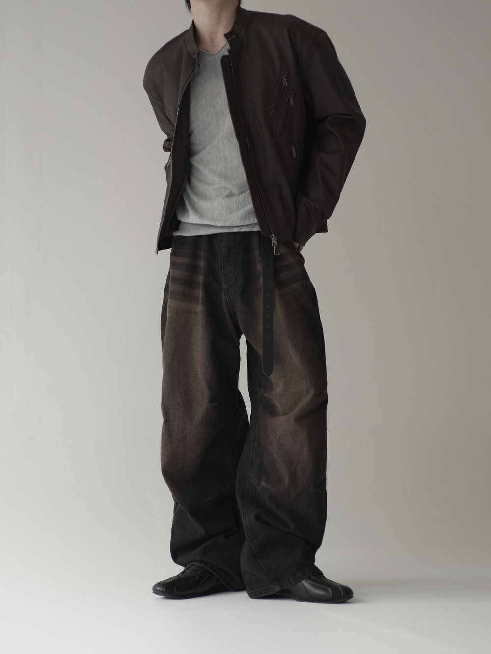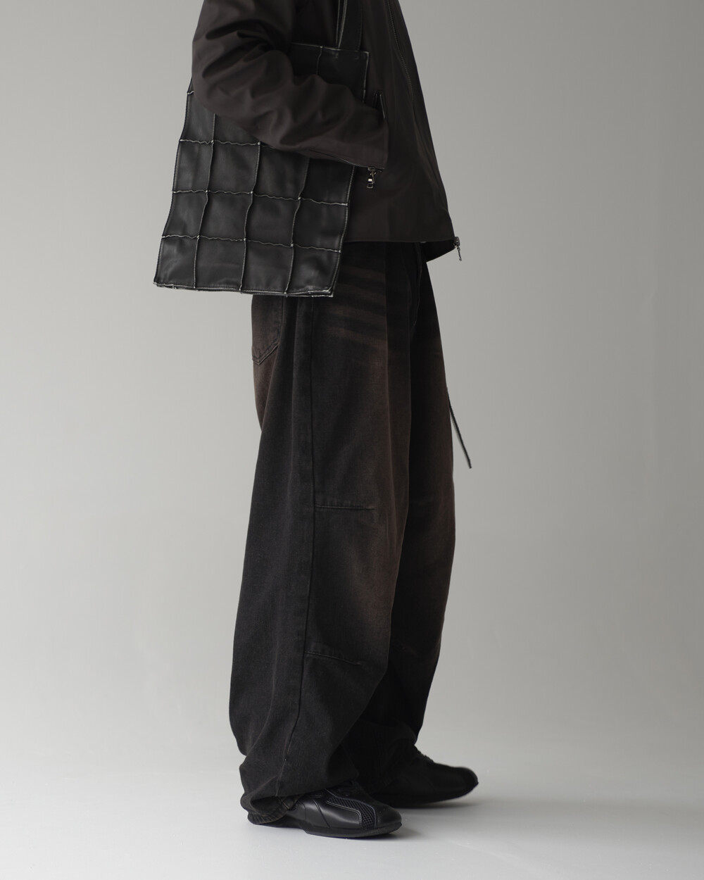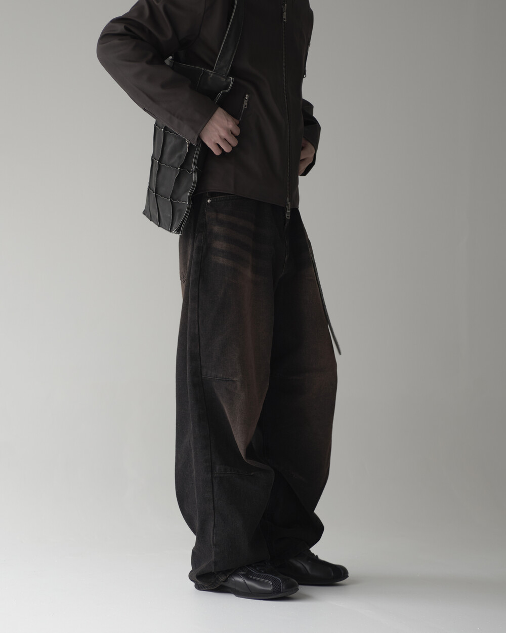 - 틴 워싱 처리과 다잉 염색을 통해 블랙 브라운 컬러감으로 연출된 와이드 데님 팬츠 제품입니다.