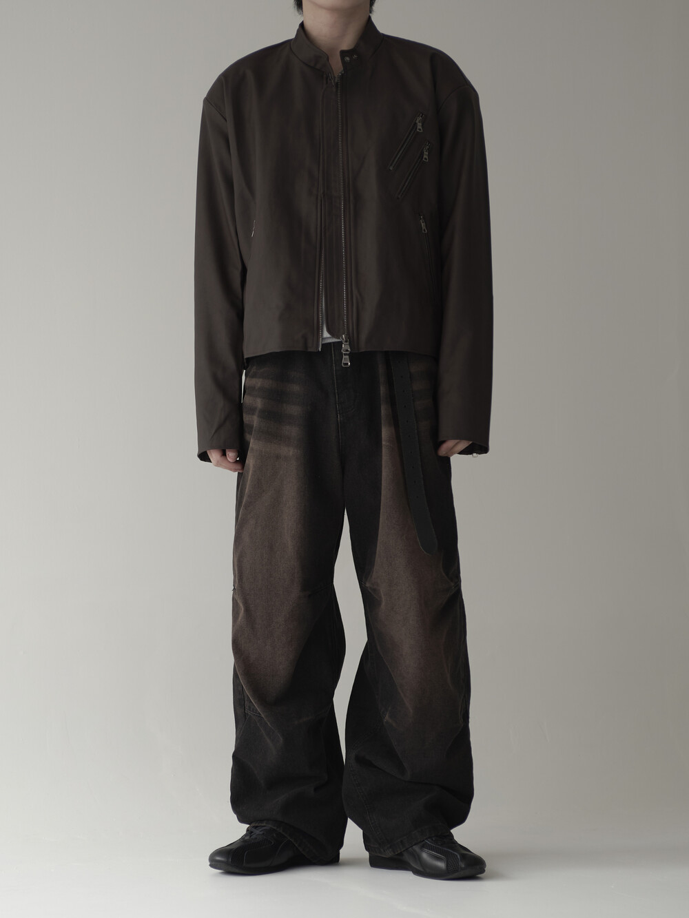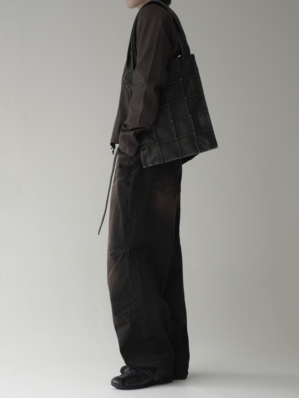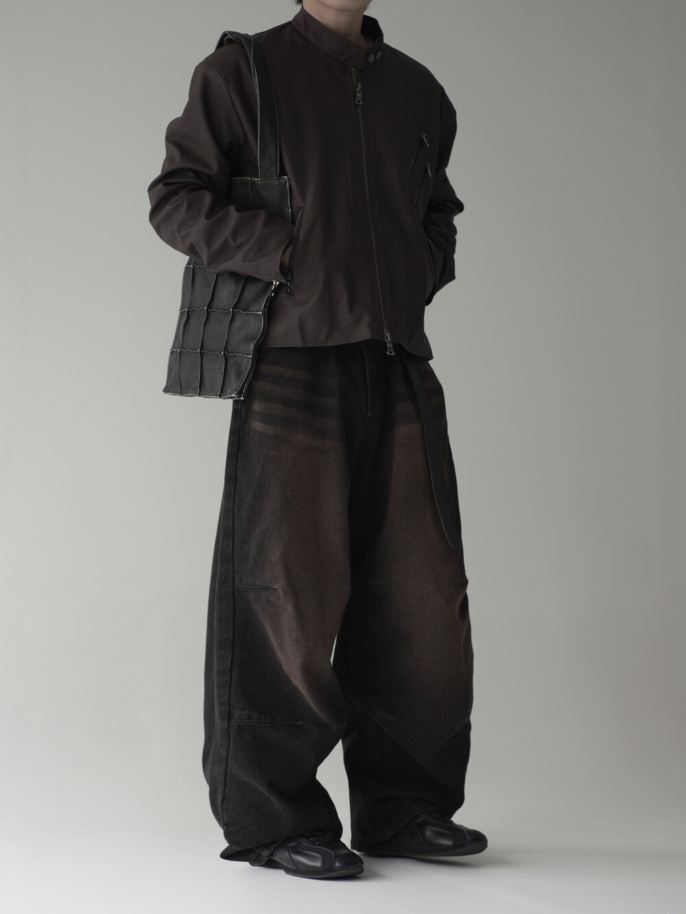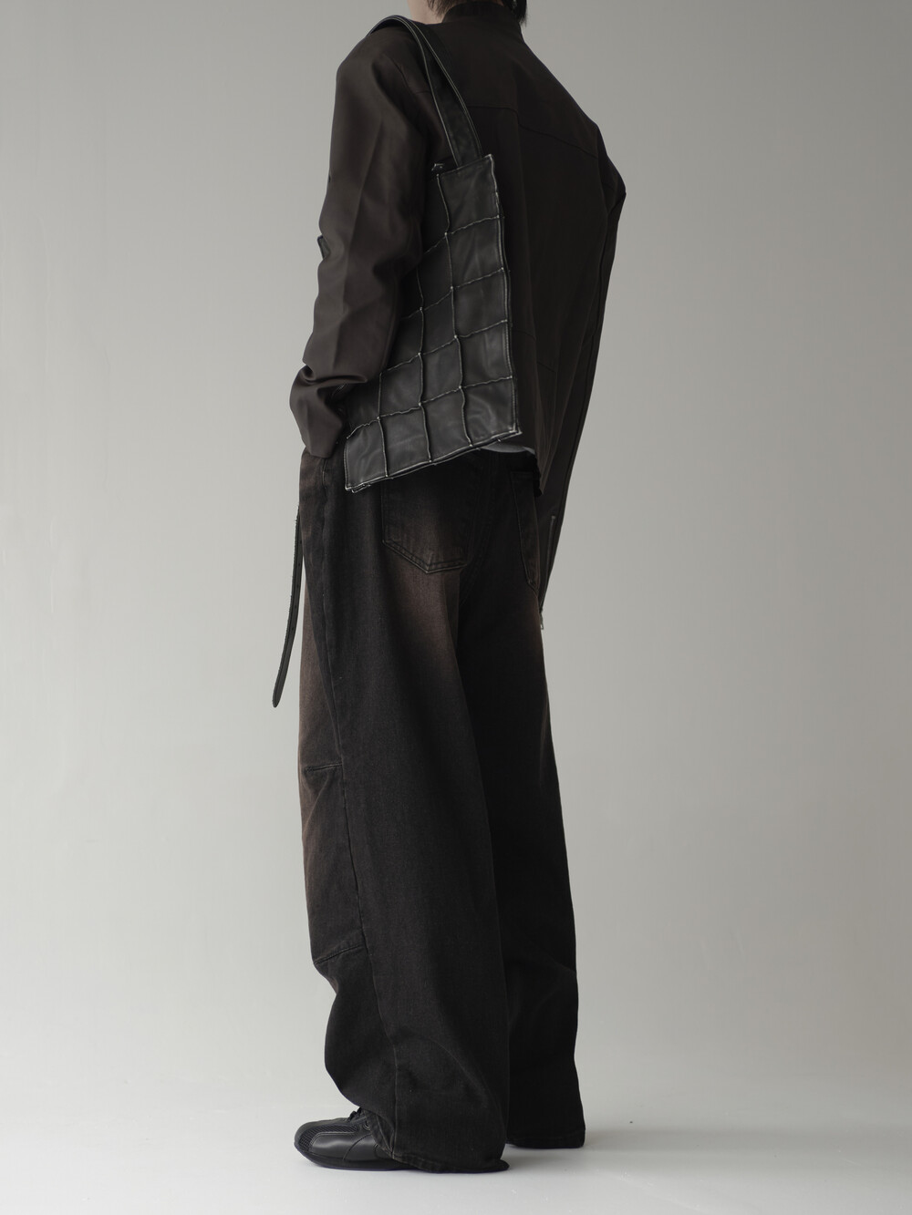 - 틴 워싱 처리과 다잉 염색을 통해 블랙 브라운 컬러감으로 연출된 와이드 데님 팬츠 제품입니다.