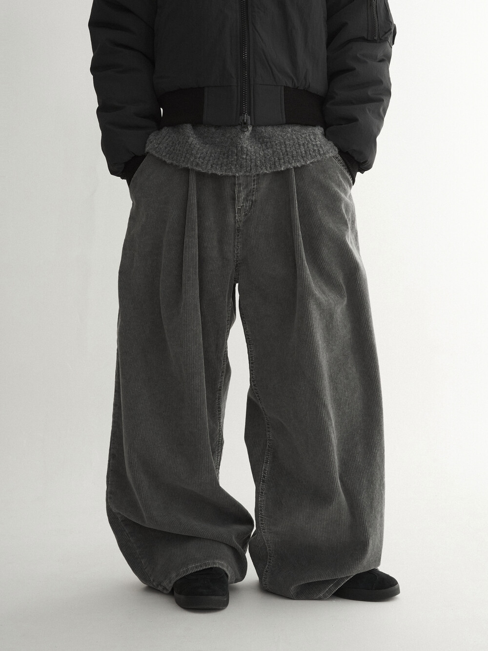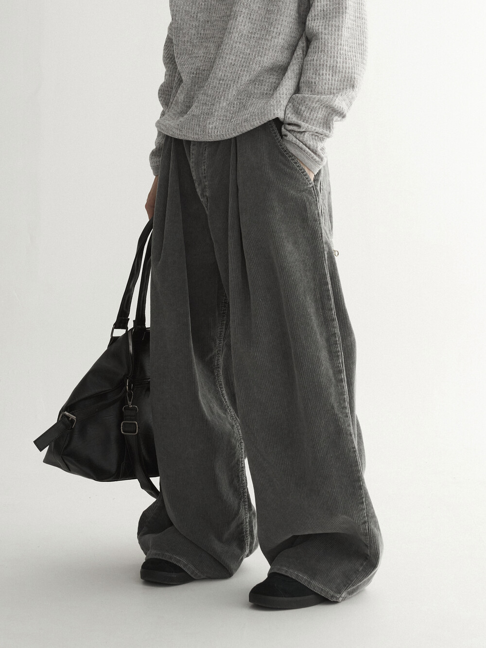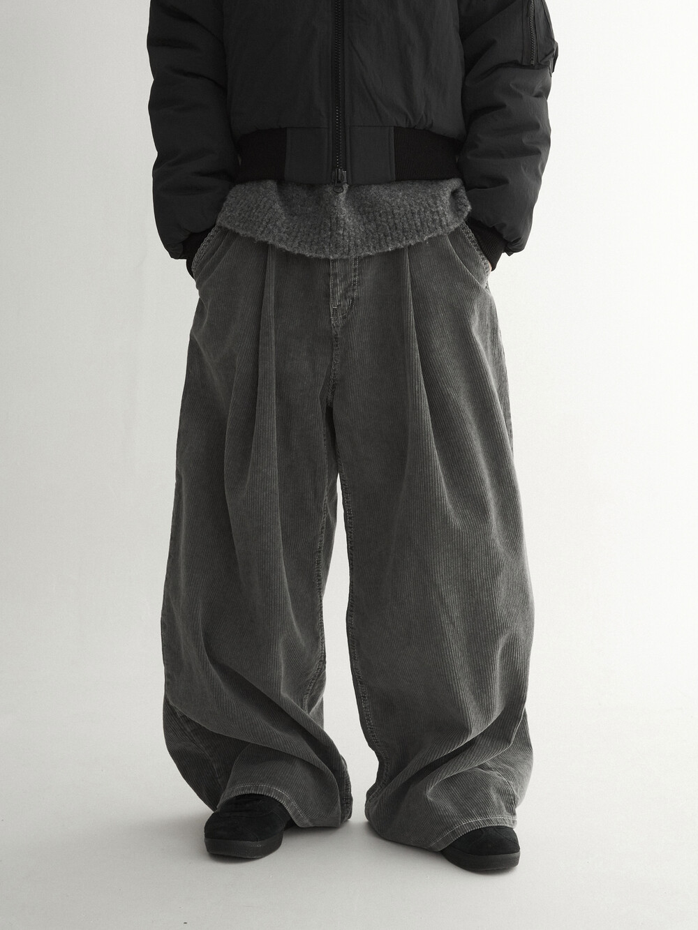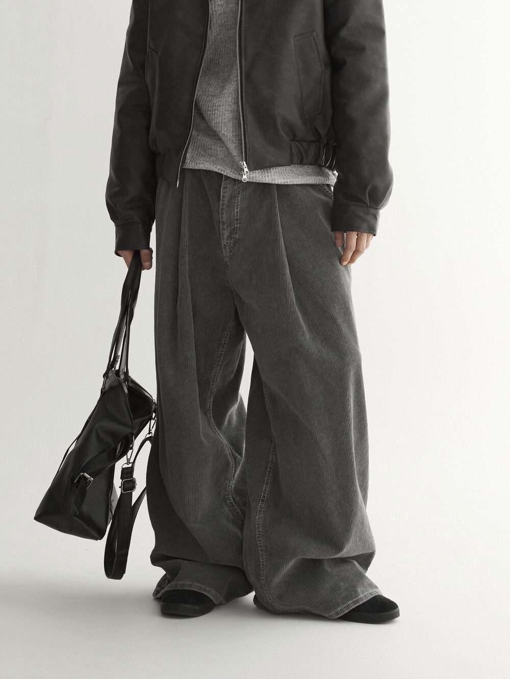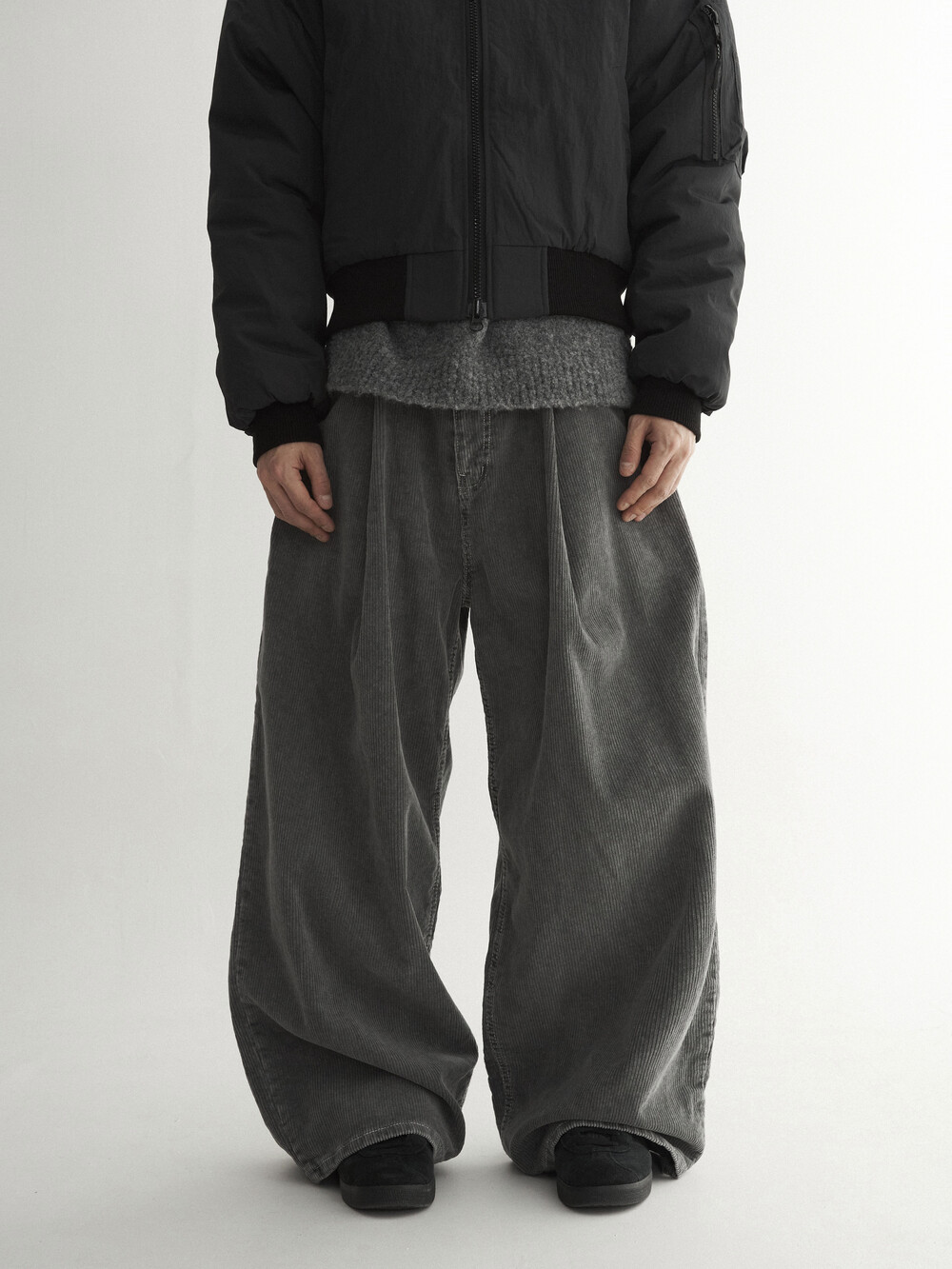 - 두꺼운 두게감과 딥 핀턱으로 활동시 무게감 있게끔 찰랑이는 아웃핏 연출