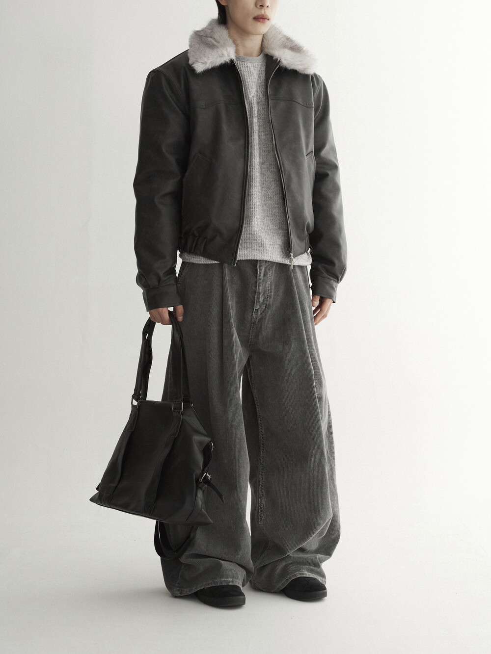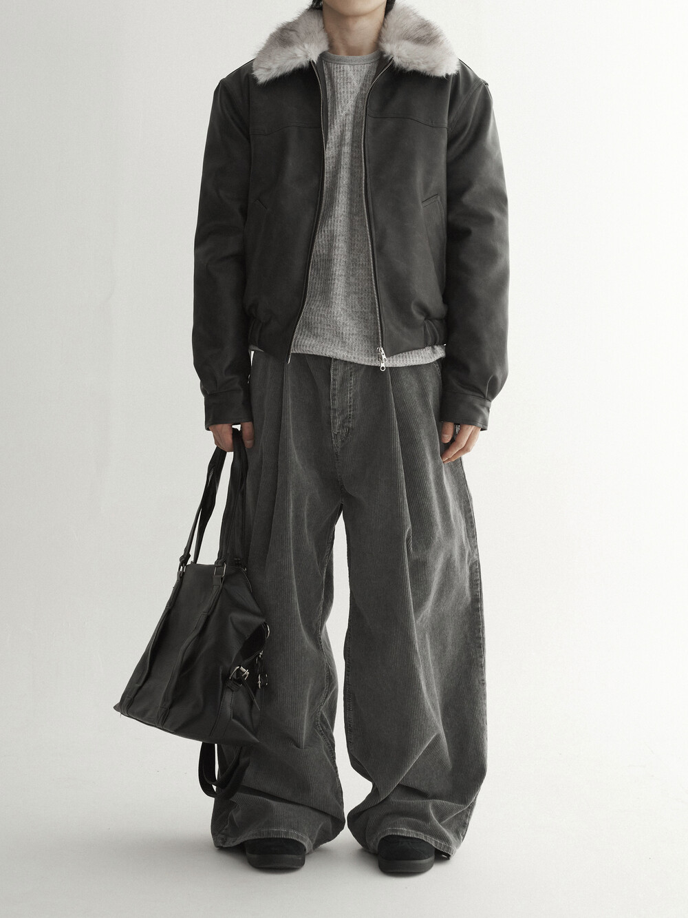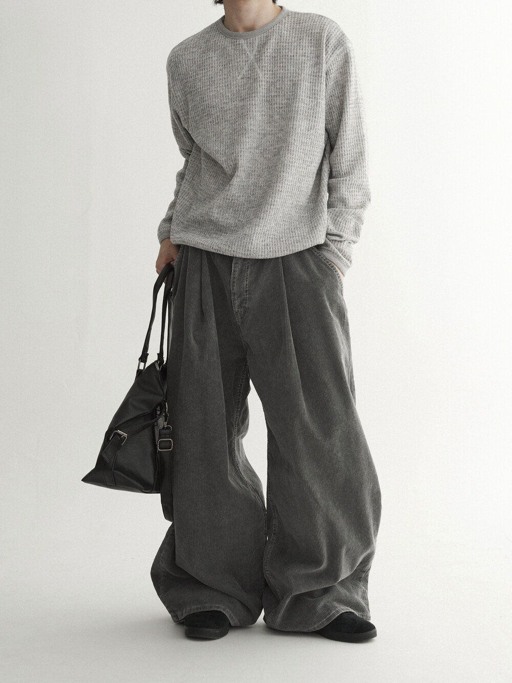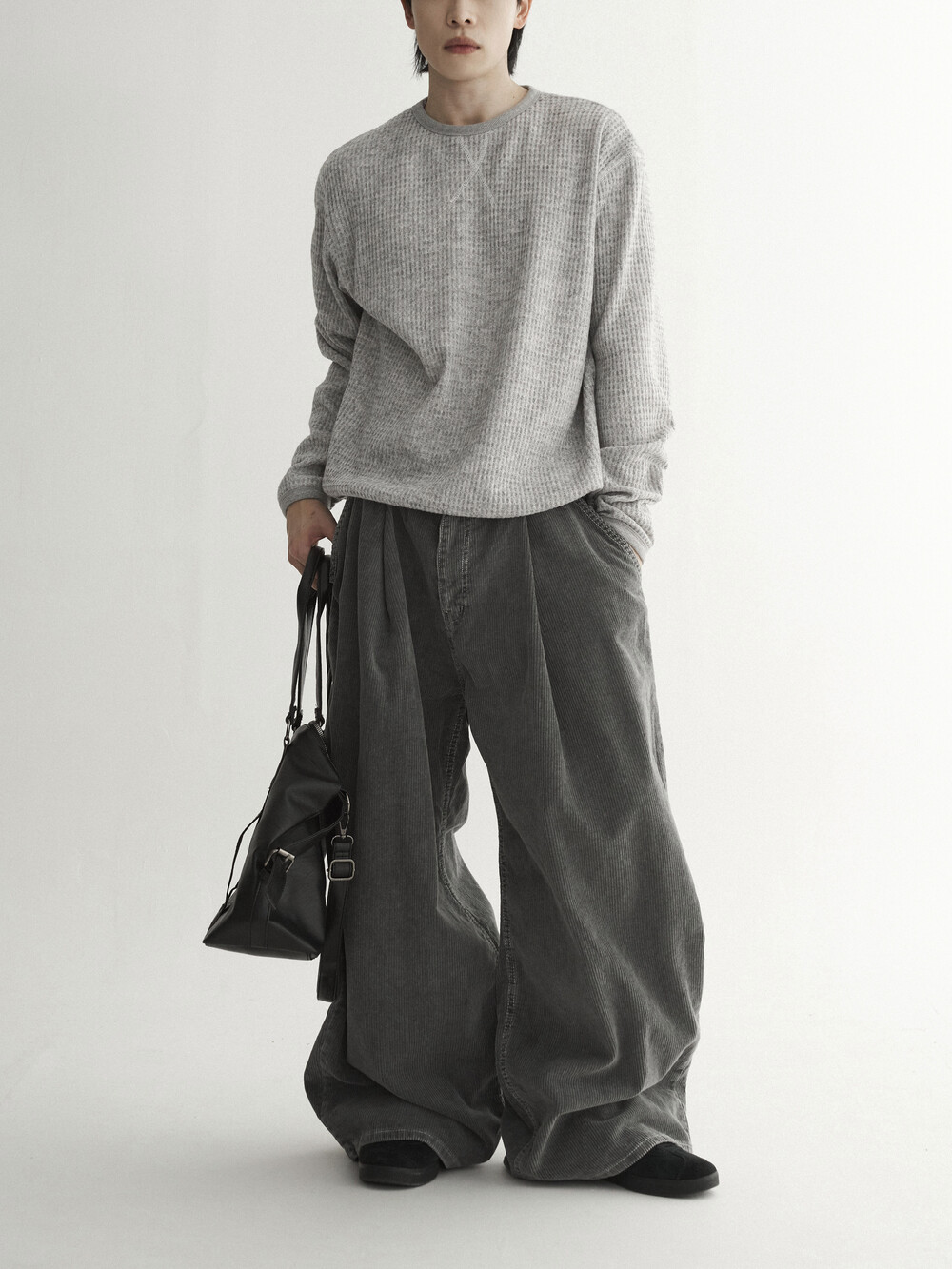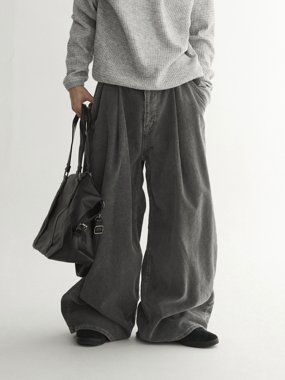 - 두꺼운 두게감과 딥 핀턱으로 활동시 무게감 있게끔 찰랑이는 아웃핏 연출