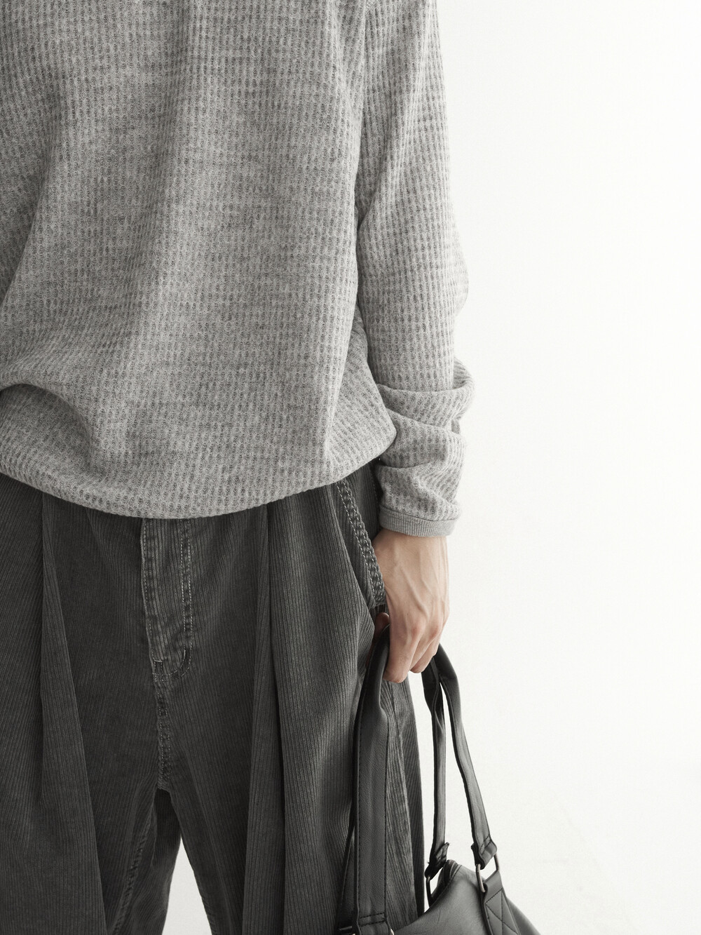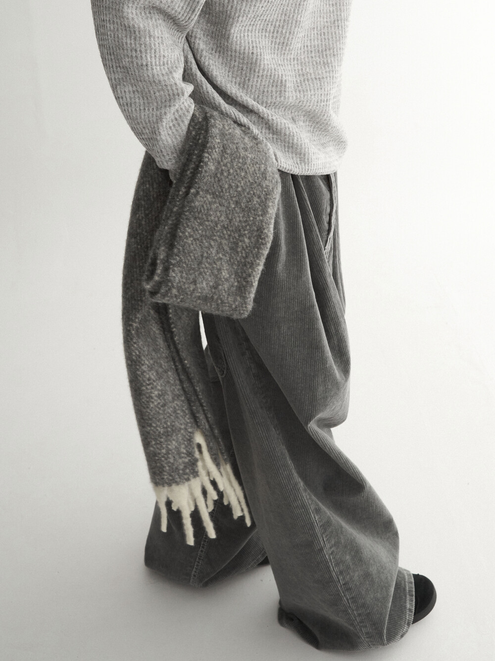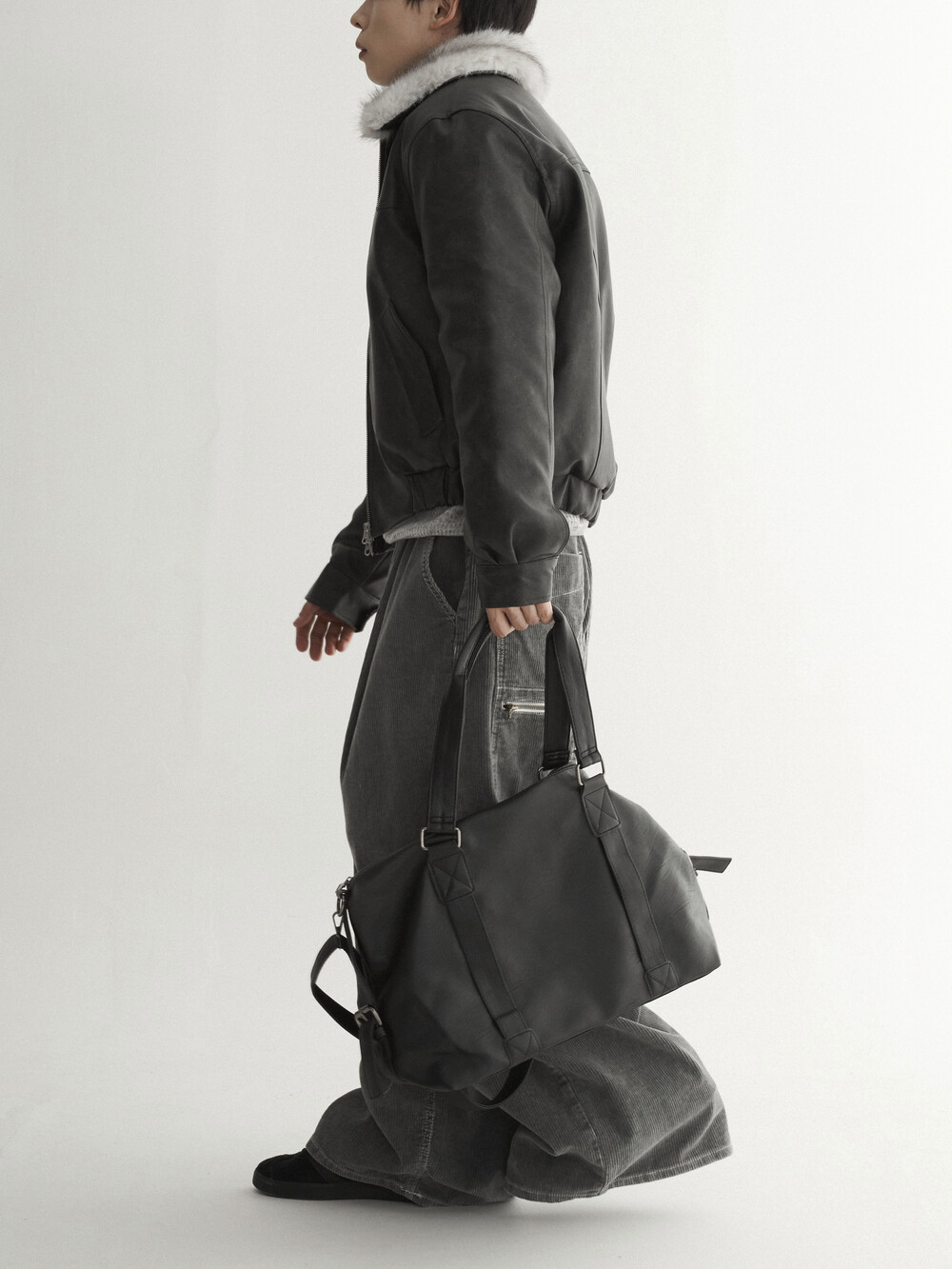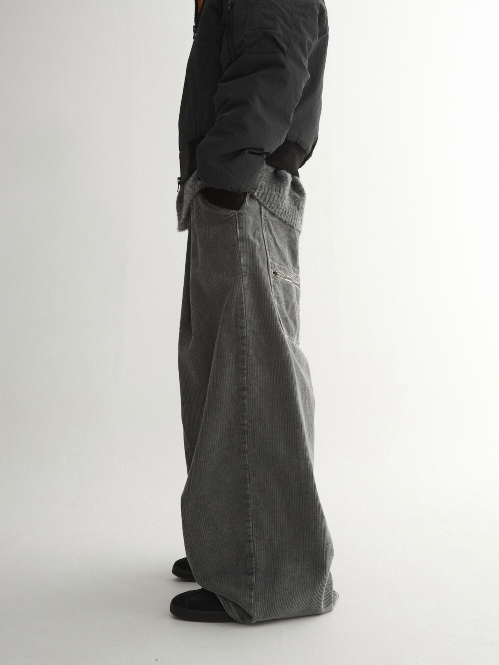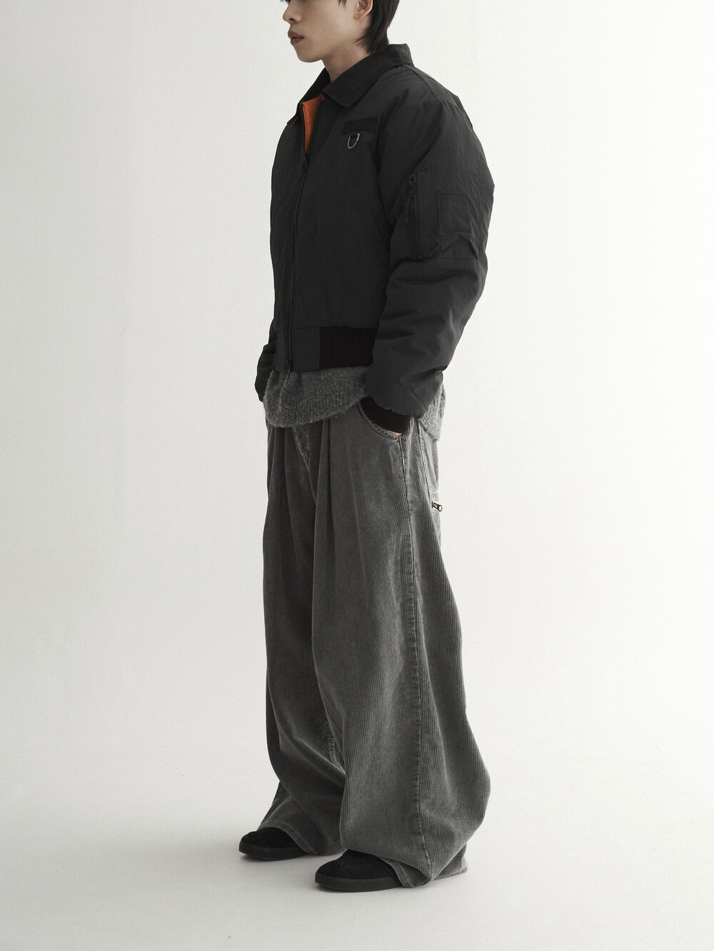 - 두꺼운 두게감과 딥 핀턱으로 활동시 무게감 있게끔 찰랑이는 아웃핏 연출