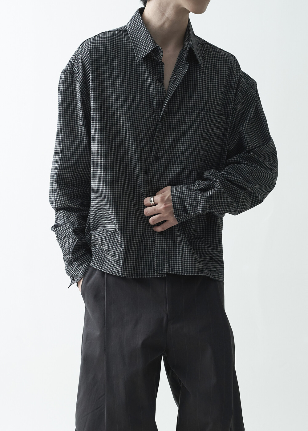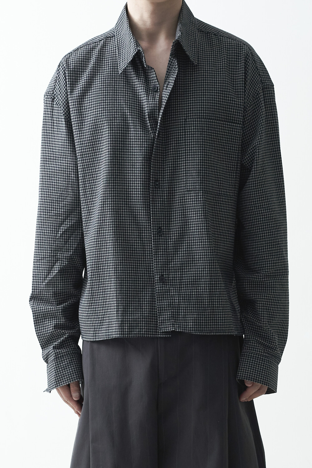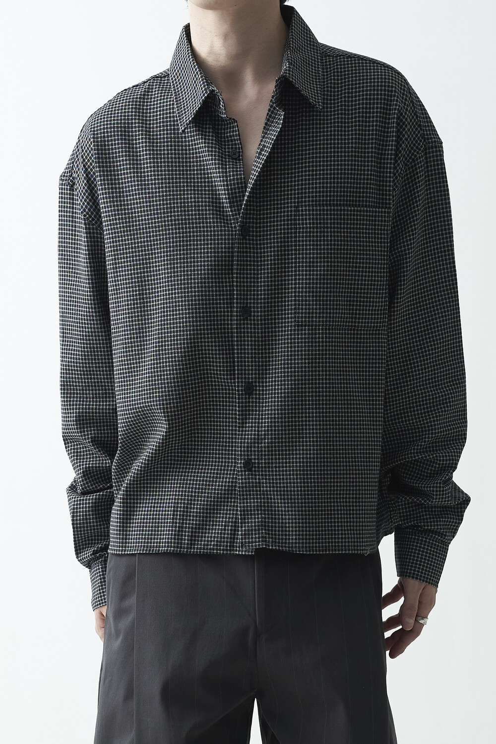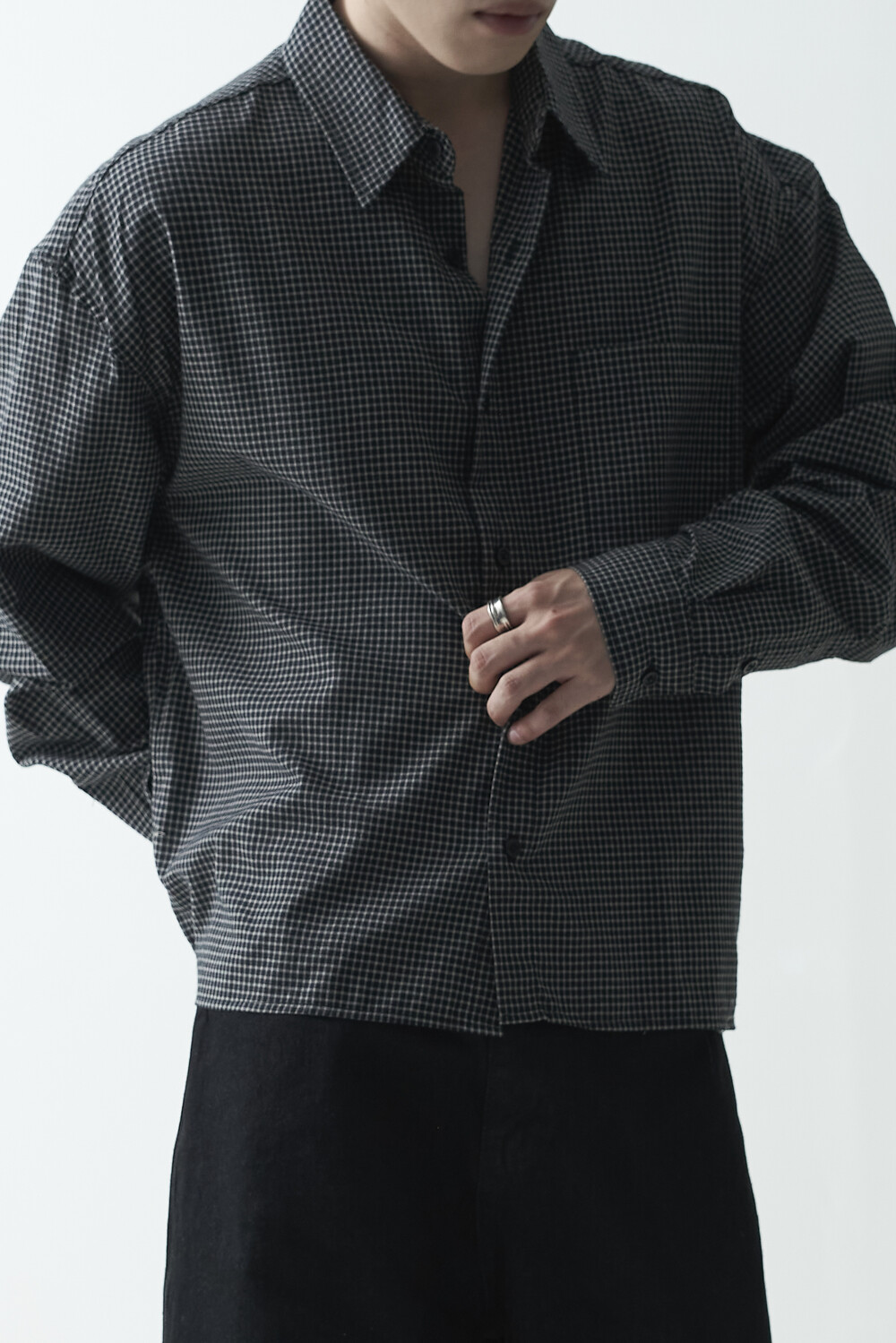 세밀한 체크 패턴으로 미니멀한 무드 연출에 효과적인 코튼 크롭 셔츠 제품입니다. 전면부 스퀘어 원포켓 디테일이 적용되어 더욱 깔끔한 아웃핏을 연출합니다.