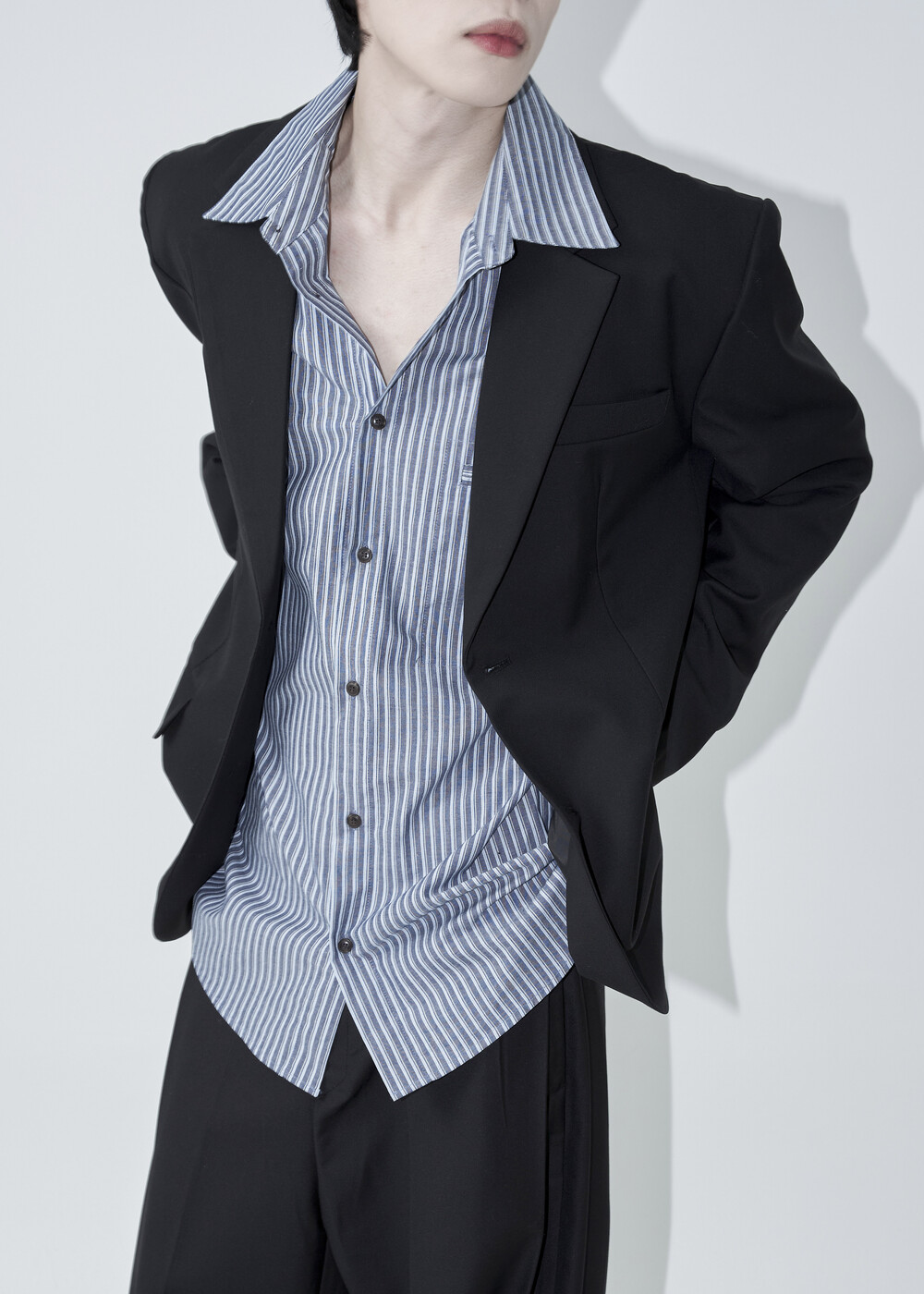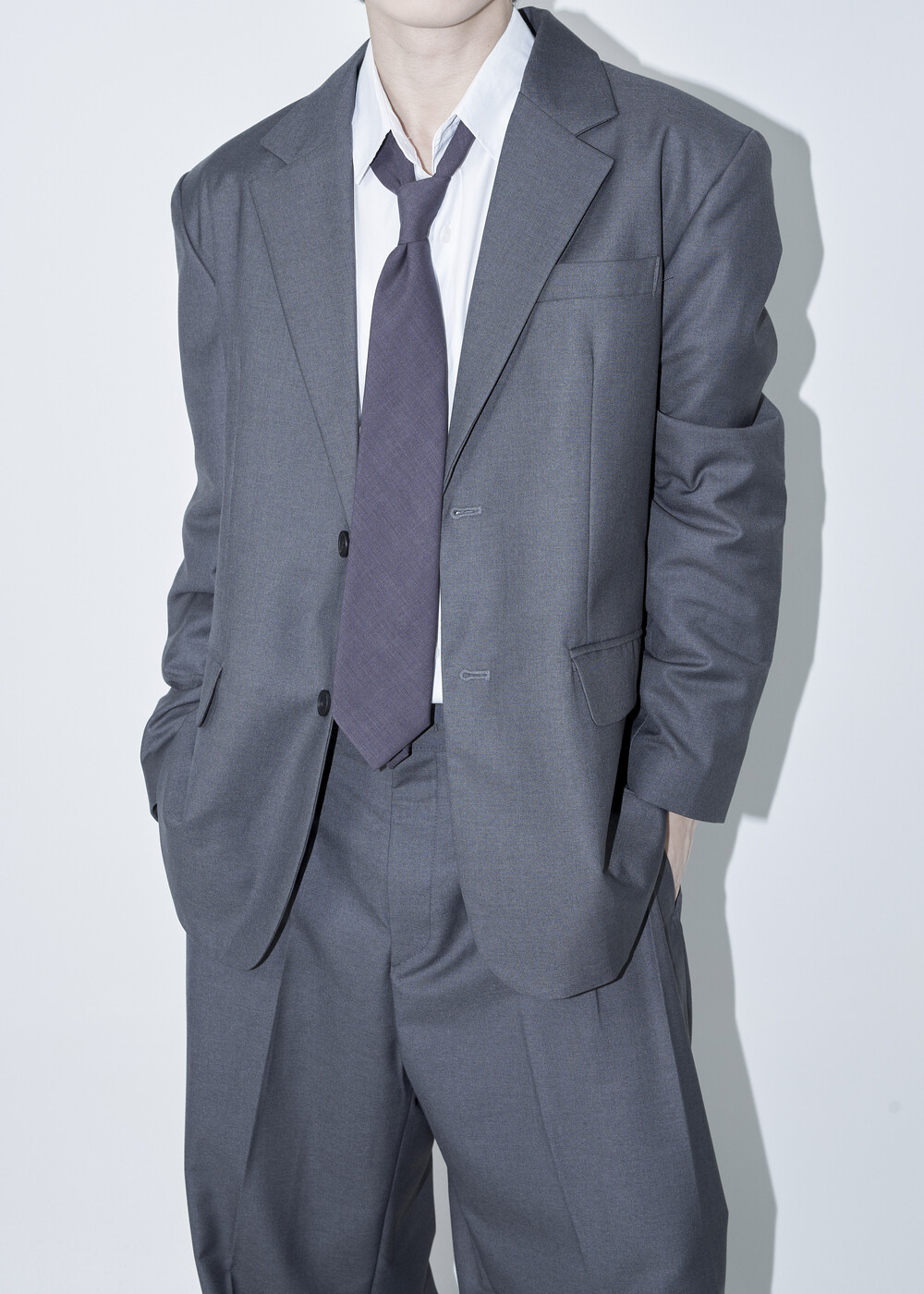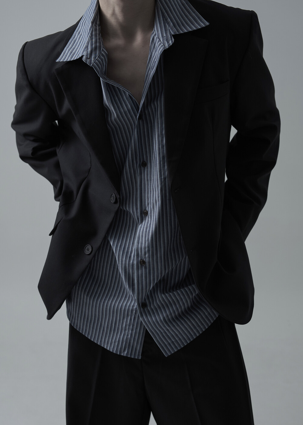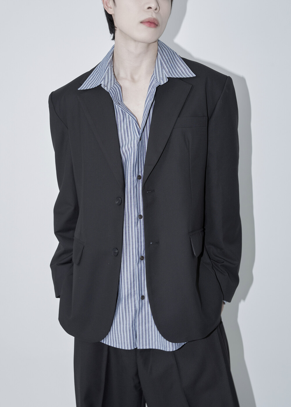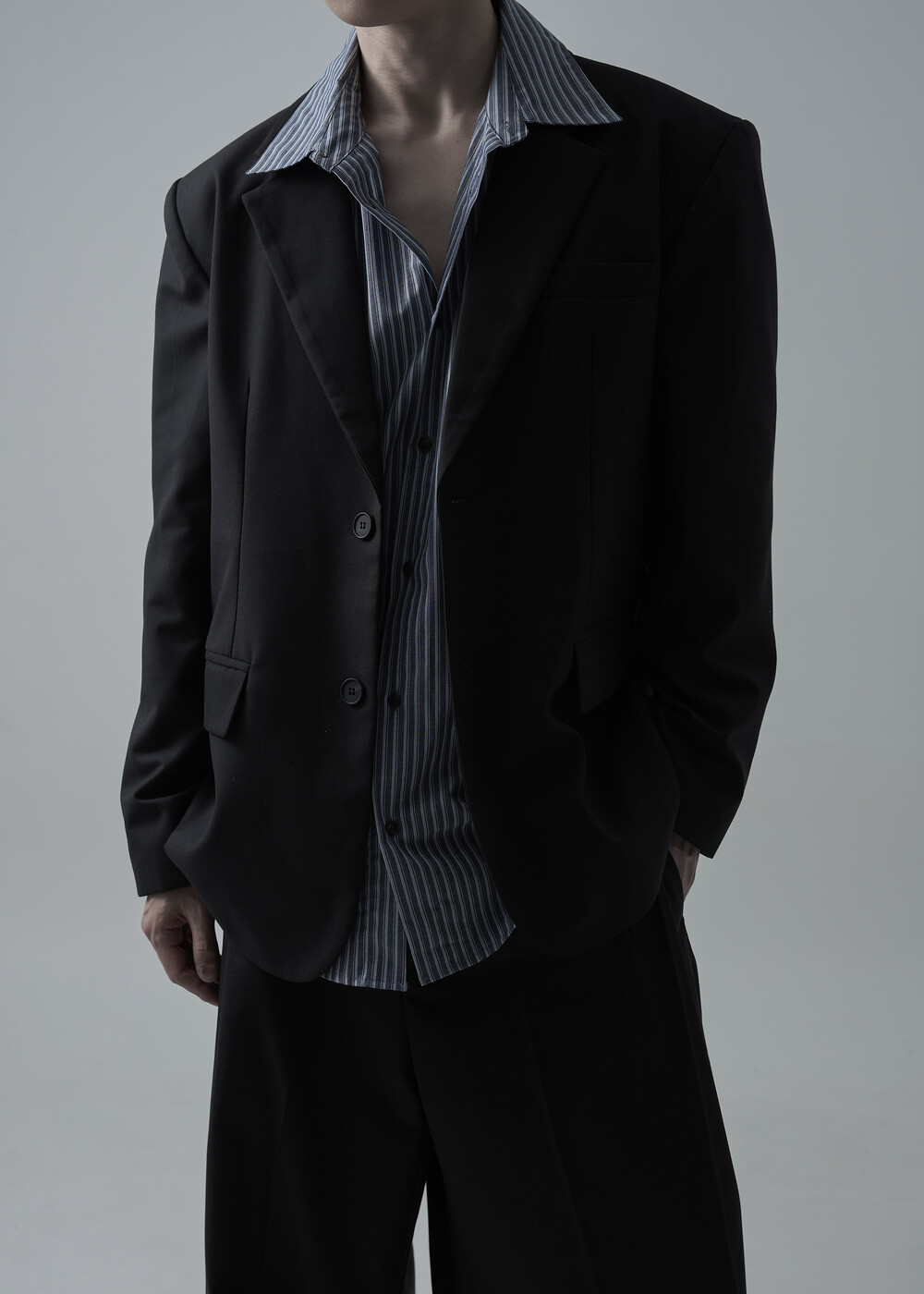 전면부 투버튼 형식으로 탄탄한 착용감을 보여주며 클래식한 카라보다는 짧게 상향된 라펠을 적용한 아우터 입니다. 기존의 클래식한 자켓제품들 보다는 짧은 소매 기장감으로 답답할 수 있는 기장감을 해소시켜주며, 전체적으로 루즈한 핏감을 나타내지만 숄더 패드를 통해 체형 보완에 이점을 나타냅니다. 정적인 무드를 보임과 동시에 찰랑이는 폴리레이온 소재의 사용으로 캐쥬얼한 무드 연출에도 용이합니다.