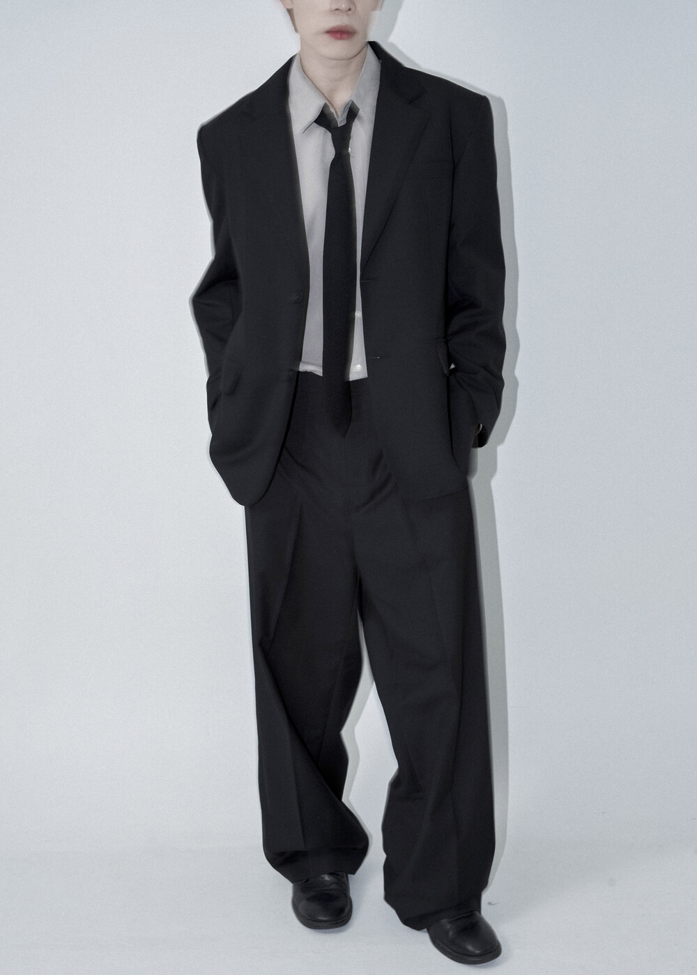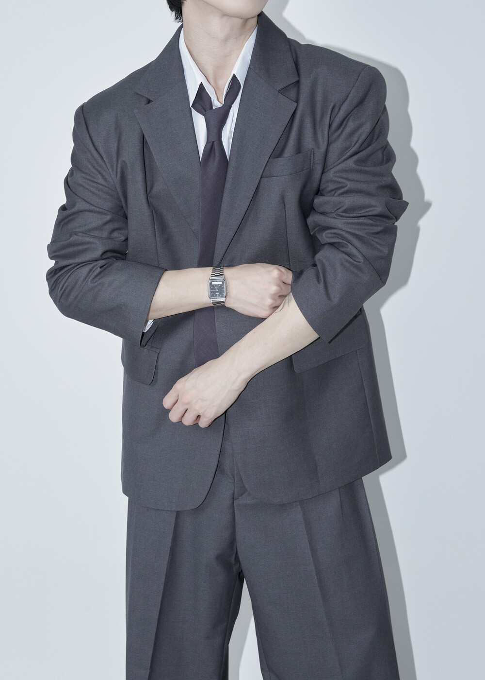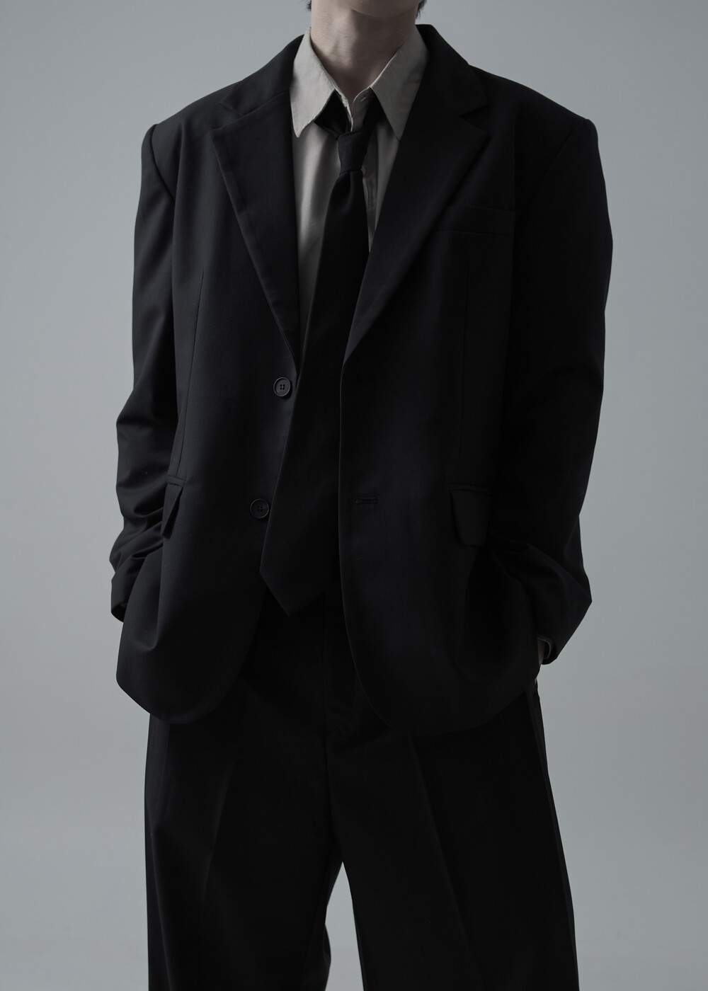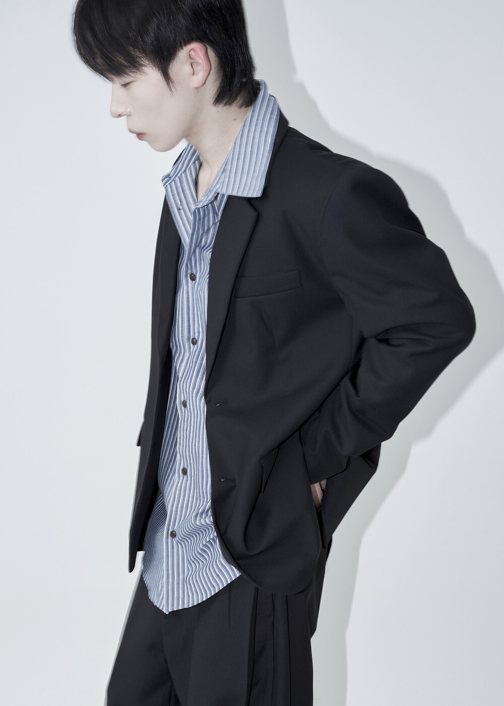 전면부 투버튼 형식으로 탄탄한 착용감을 보여주며 클래식한 카라보다는 짧게 상향된 라펠을 적용한 아우터 입니다. 기존의 클래식한 자켓제품들 보다는 짧은 소매 기장감으로 답답할 수 있는 기장감을 해소시켜주며, 전체적으로 루즈한 핏감을 나타내지만 숄더 패드를 통해 체형 보완에 이점을 나타냅니다. 정적인 무드를 보임과 동시에 찰랑이는 폴리레이온 소재의 사용으로 캐쥬얼한 무드 연출에도 용이합니다.