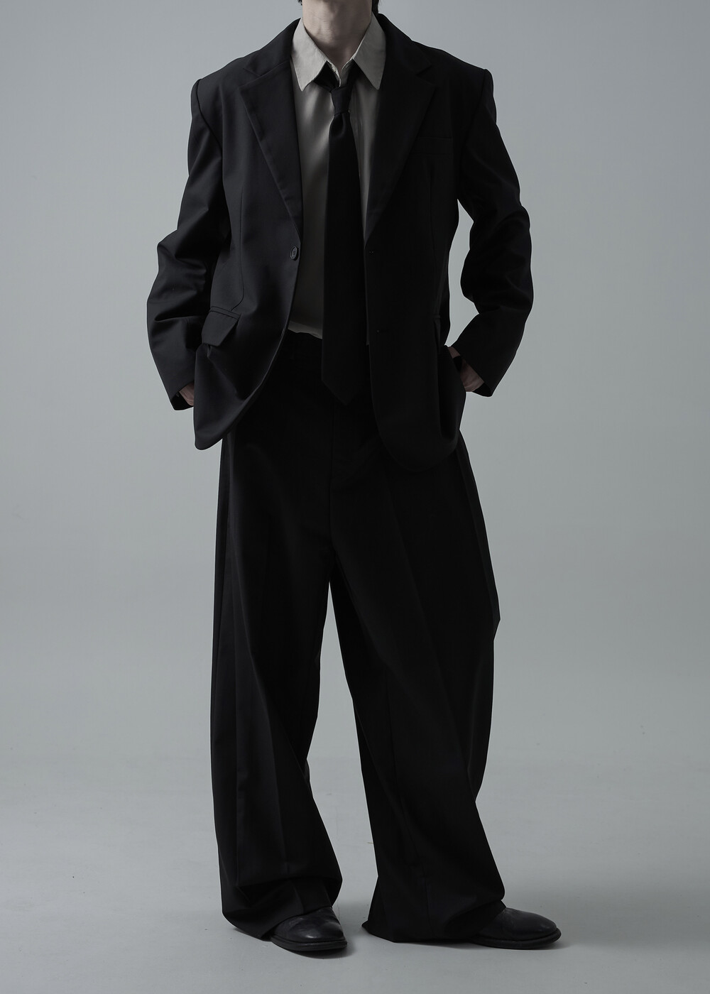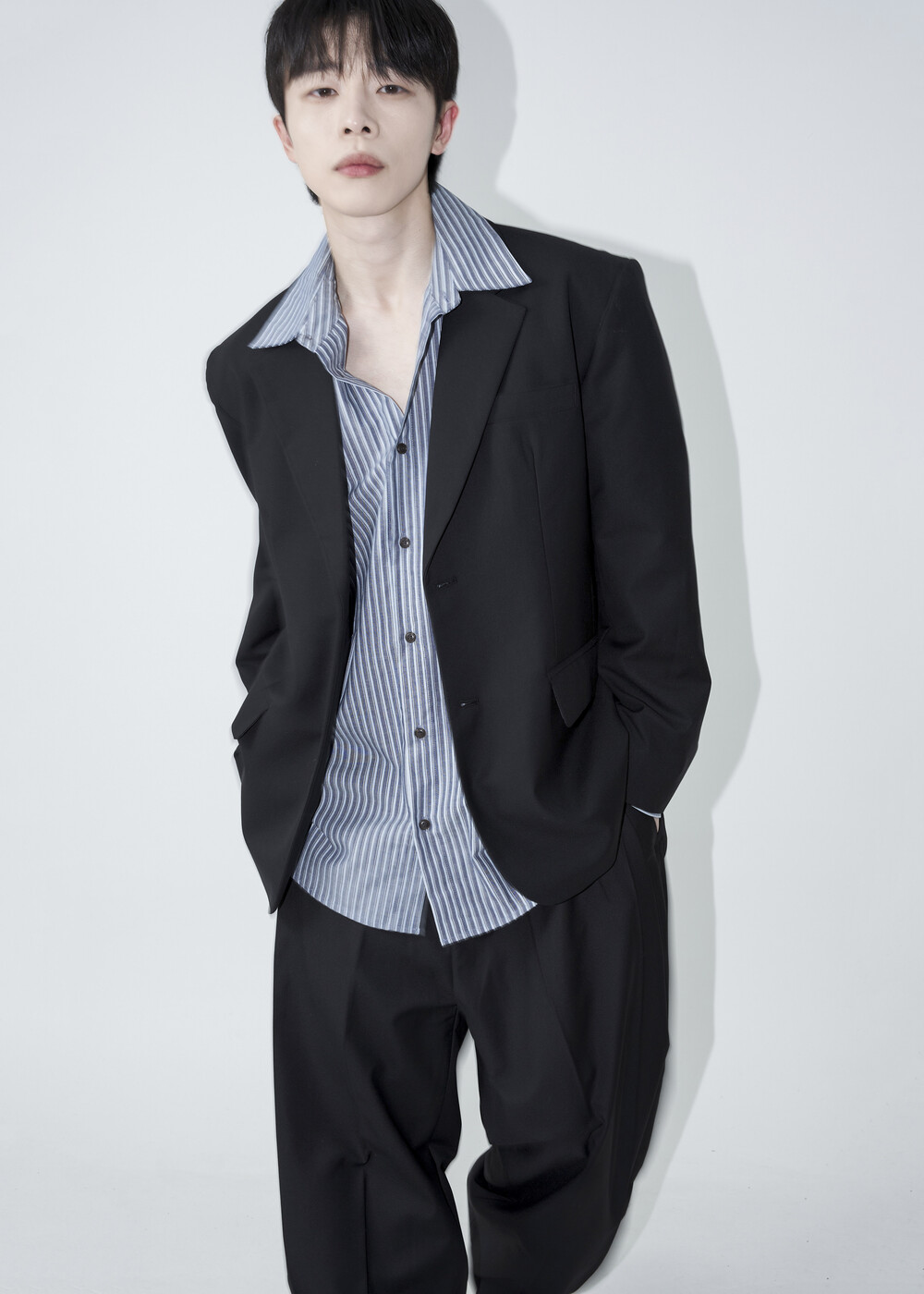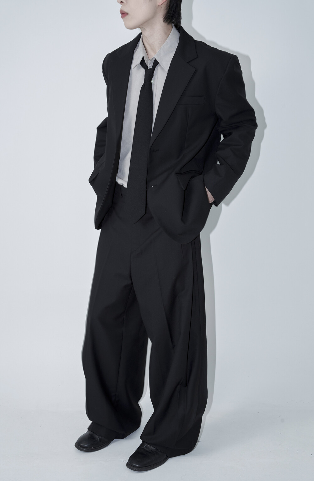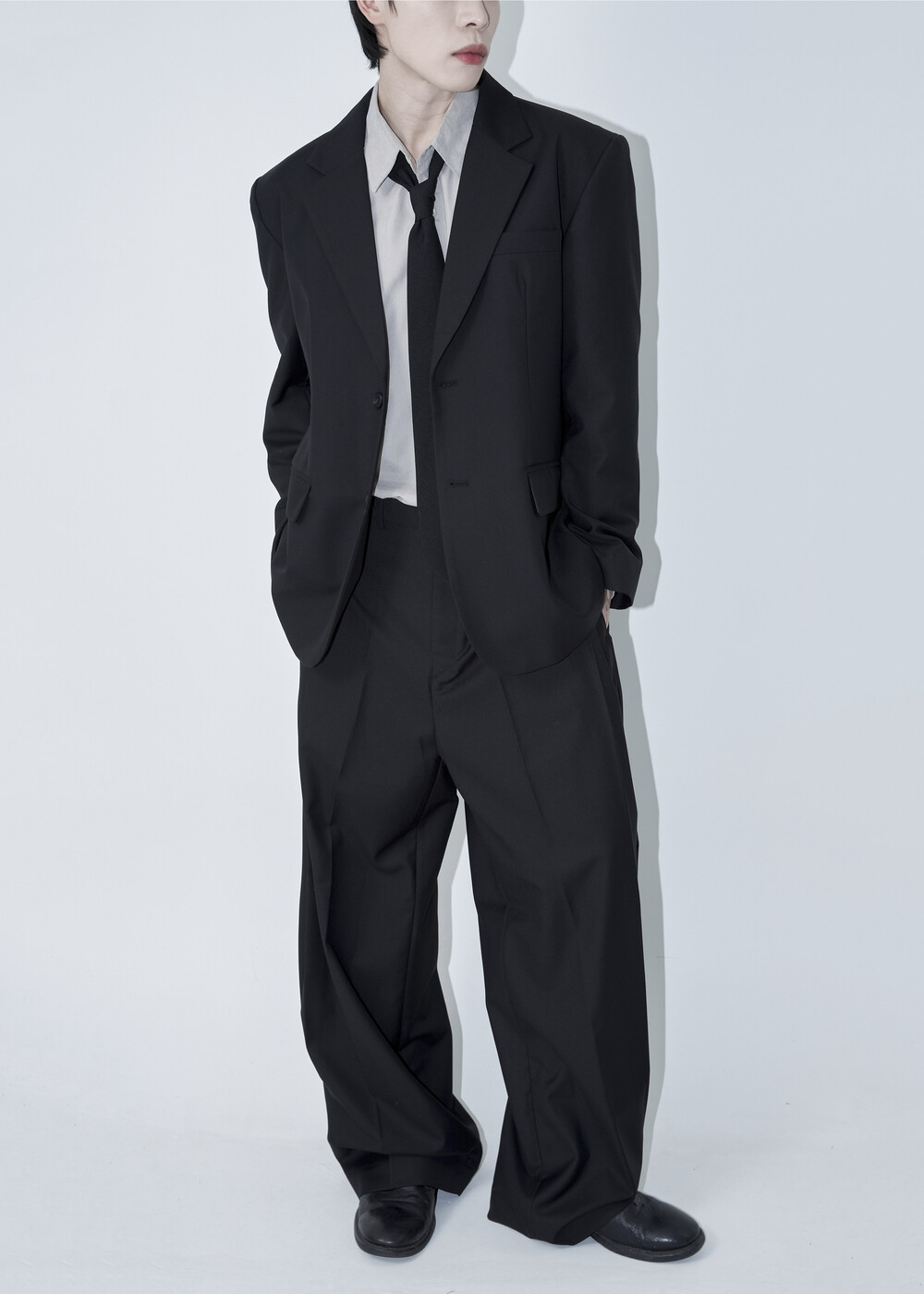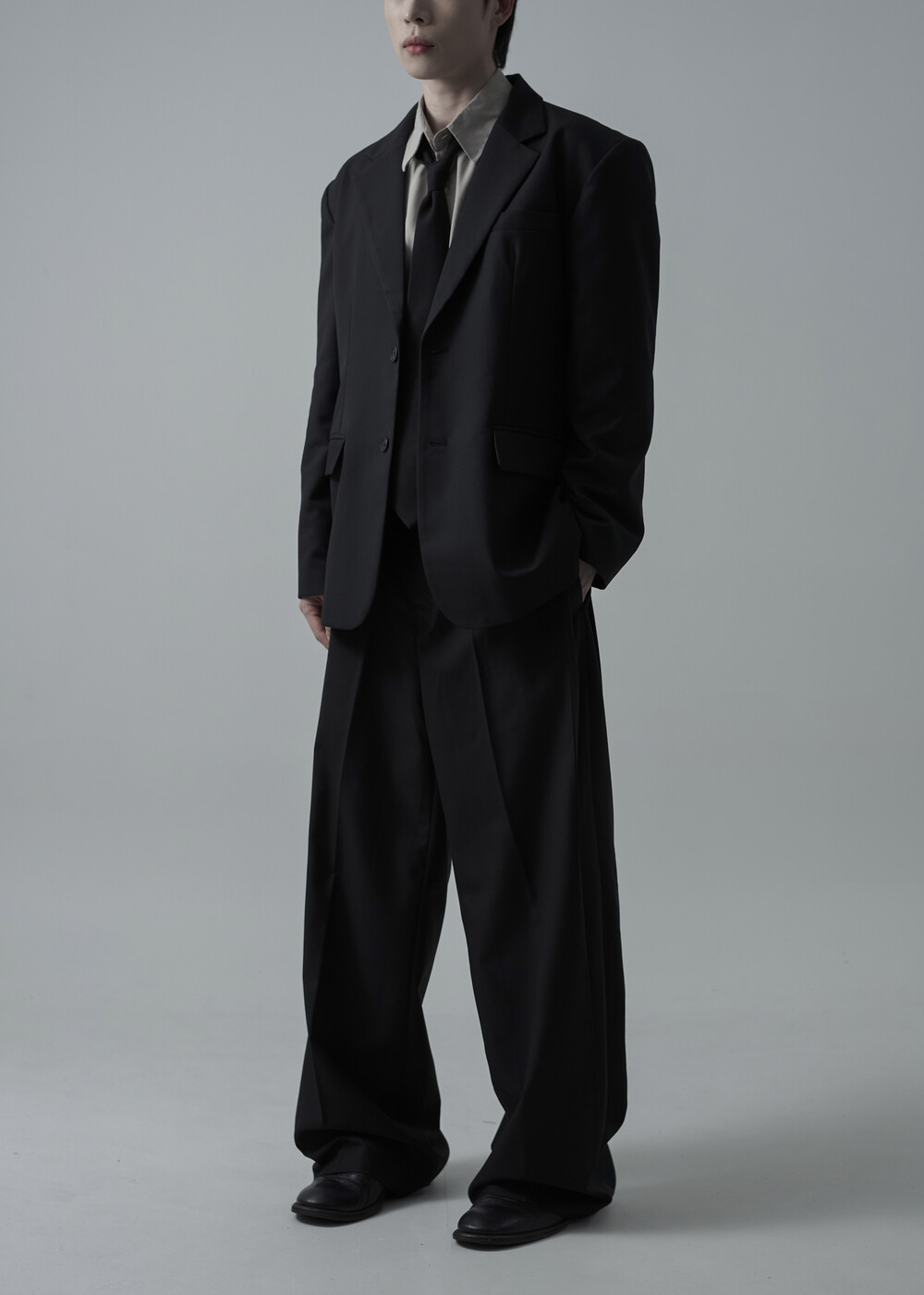 전면부 투버튼 형식으로 탄탄한 착용감을 보여주며 클래식한 카라보다는 짧게 상향된 라펠을 적용한 아우터 입니다. 기존의 클래식한 자켓제품들 보다는 짧은 소매 기장감으로 답답할 수 있는 기장감을 해소시켜주며, 전체적으로 루즈한 핏감을 나타내지만 숄더 패드를 통해 체형 보완에 이점을 나타냅니다. 정적인 무드를 보임과 동시에 찰랑이는 폴리레이온 소재의 사용으로 캐쥬얼한 무드 연출에도 용이합니다.
