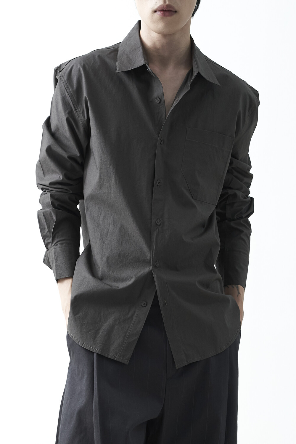 클래식한 무드가 돋보이는 싱글 코튼 셔츠 제품입니다. 미니멀한 칼라라인과 기본에 충실한 원포켓 디자인으로 컬러리스에서 가장 중요시 하는 컬러매치업 단추가 적용되었습니다.