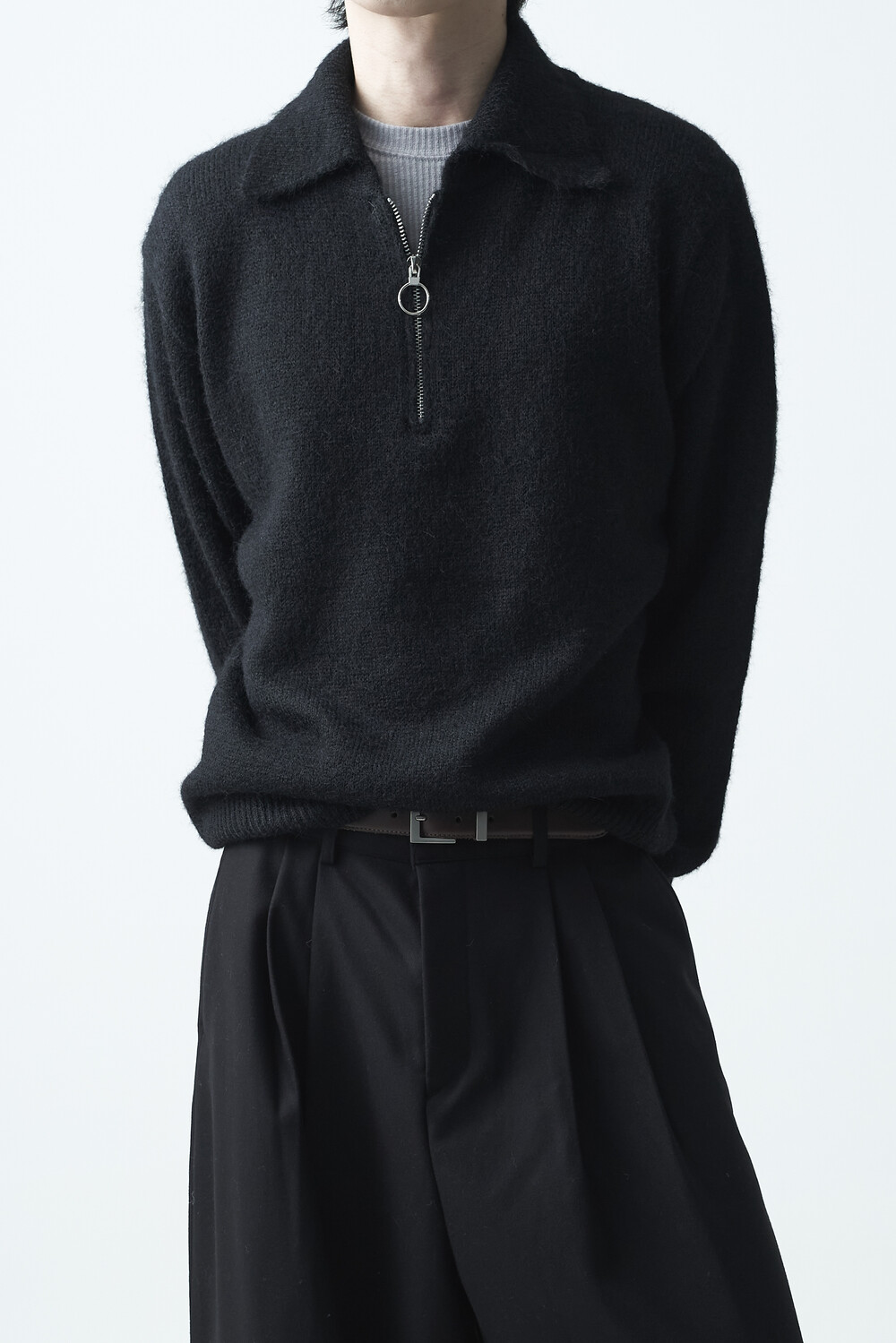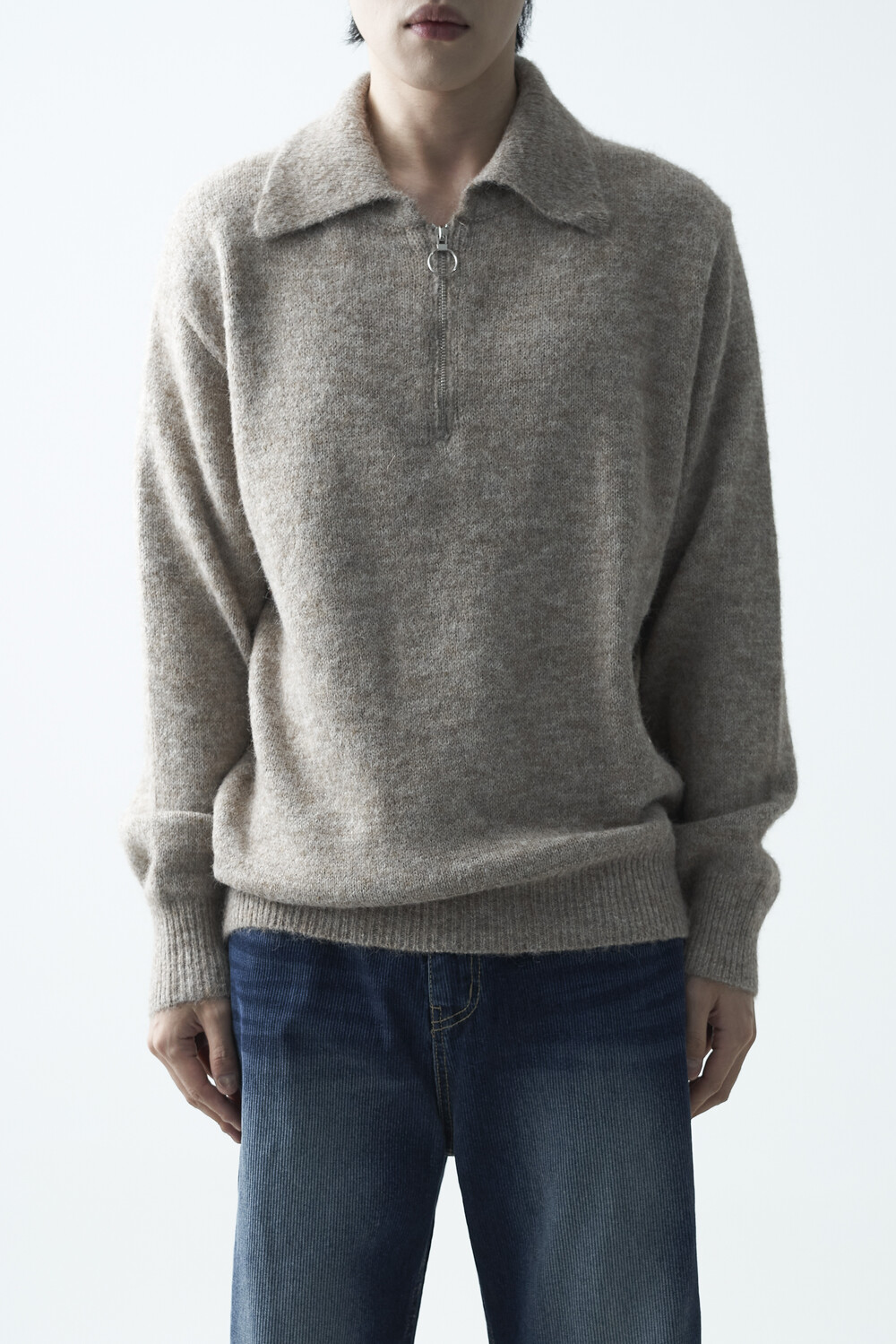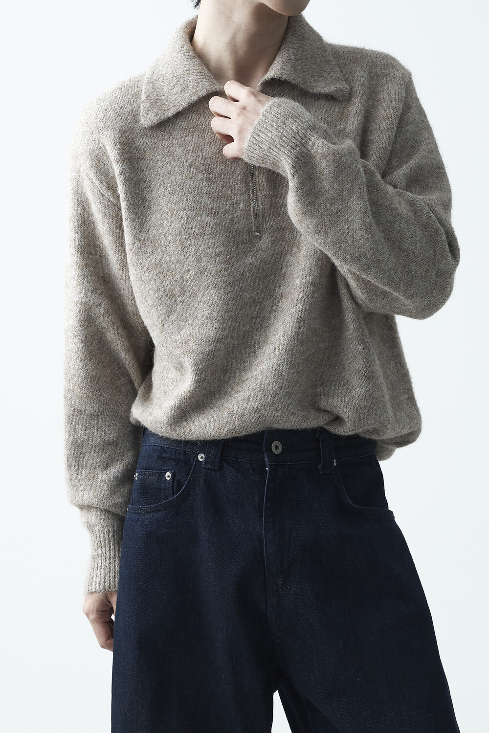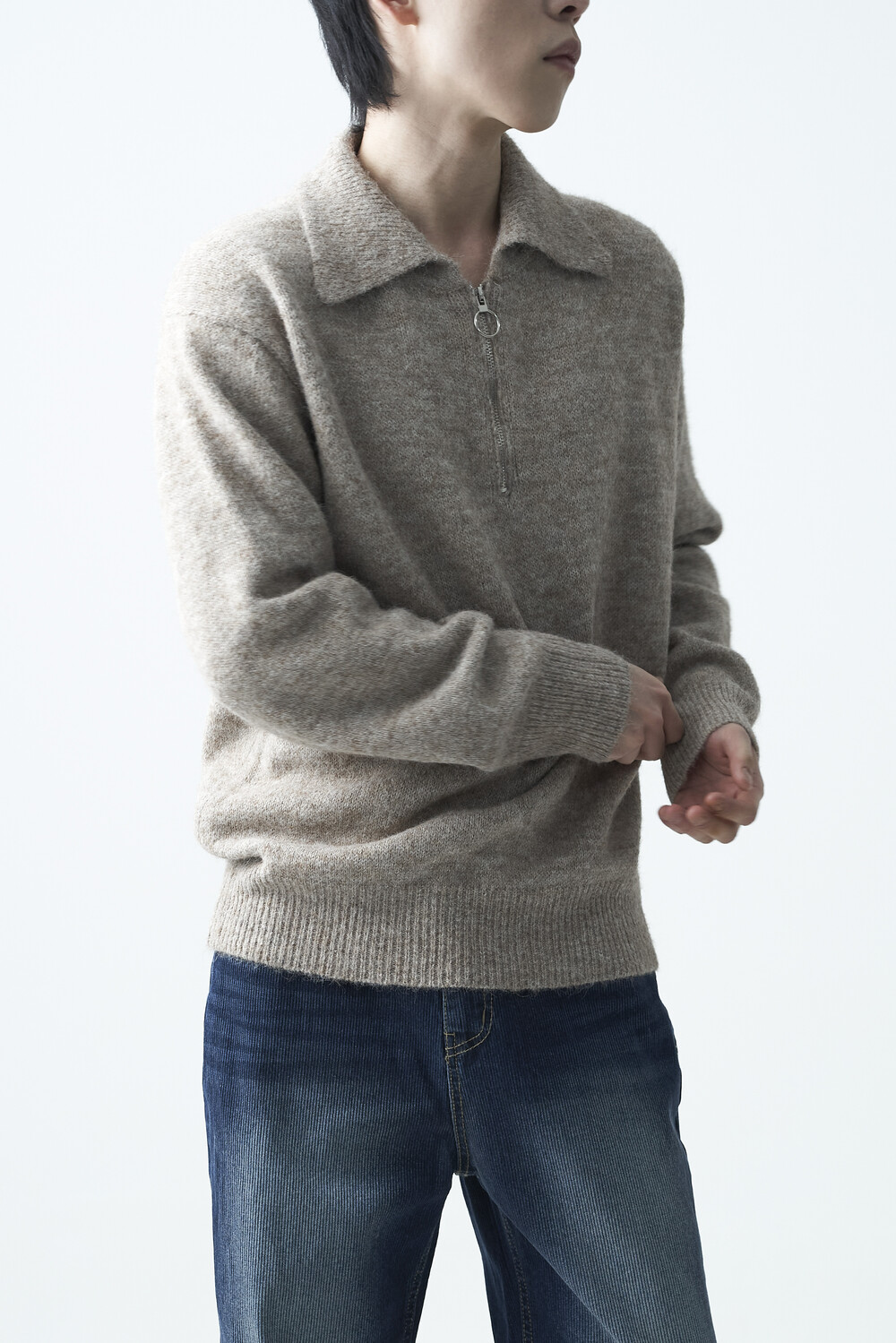 - 보카시 반집업 카라 니트 제품으로 오버한 카라라인이 유니크하게 적용되었습니다. 스판 소재 탄력감과 울/모 소재감의 따뜻한 보온성으로 겨울철 다양한 레이어드 코디가 가능하며 단품으로도 충분히 매력적인 아웃핏을 연출하실 수 있습니다.