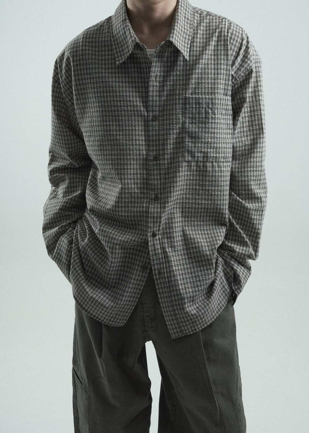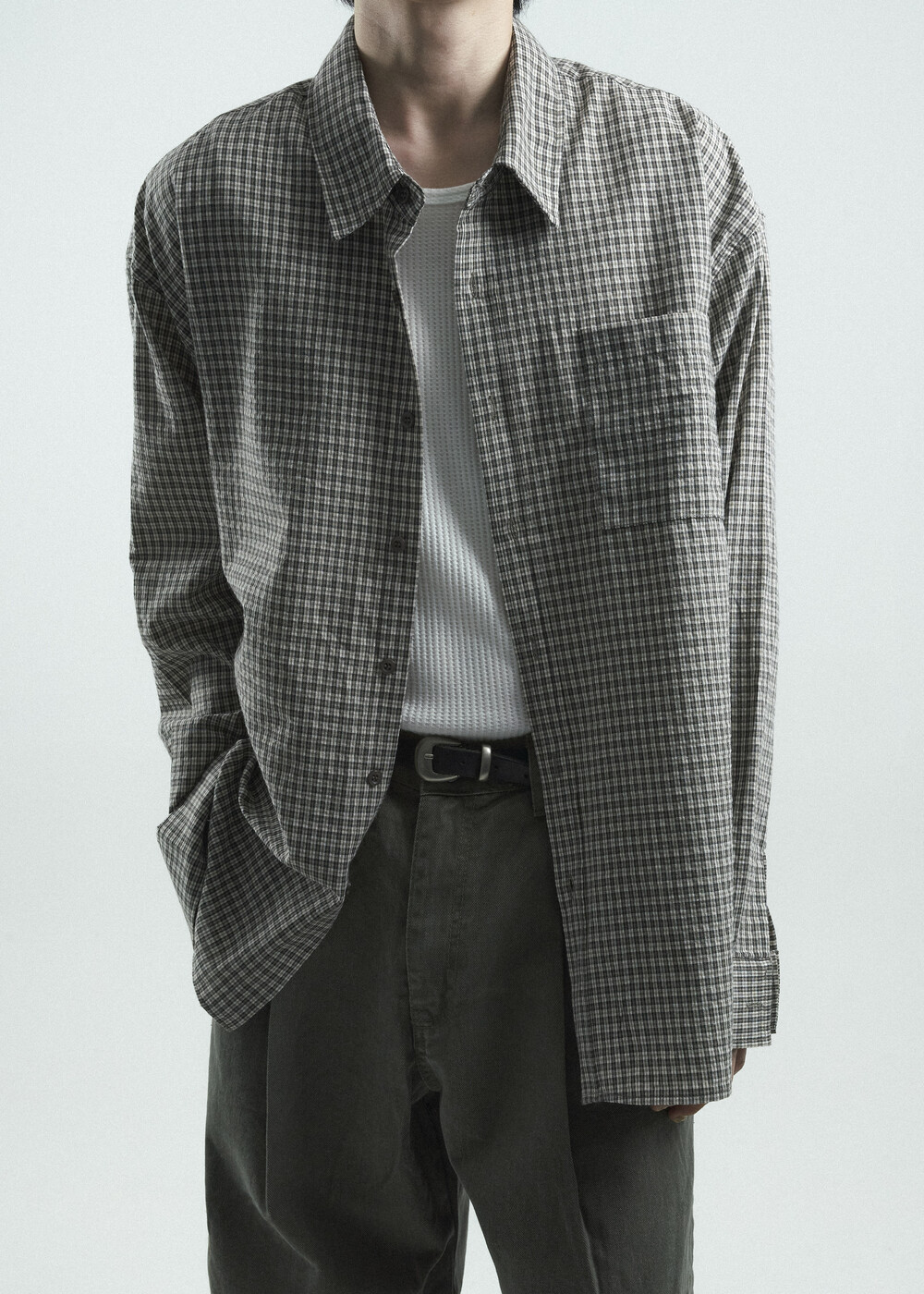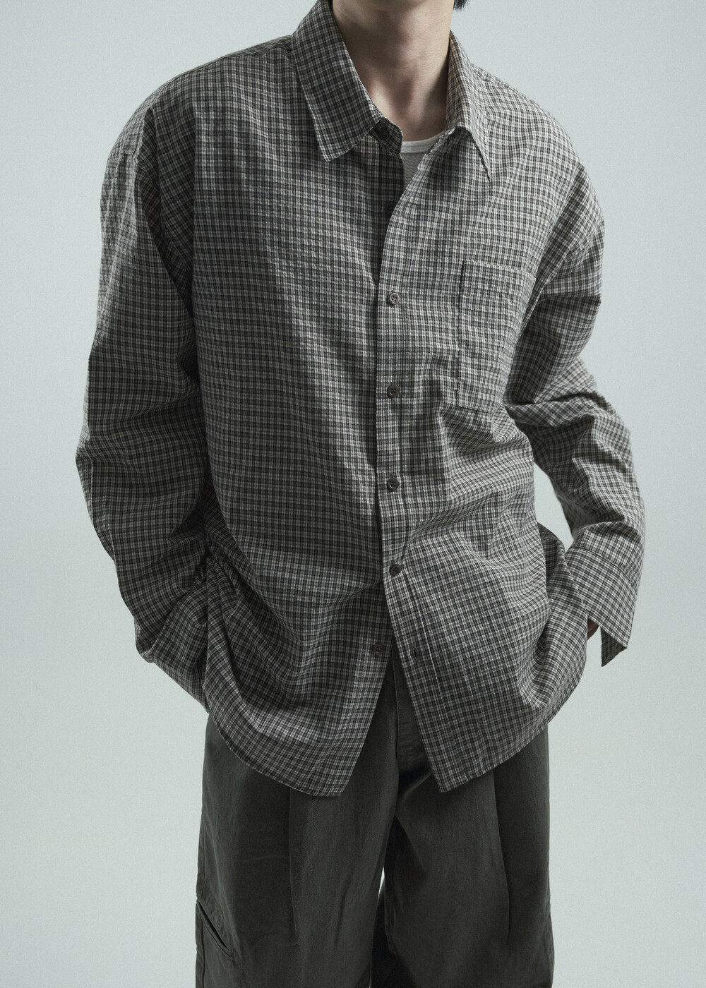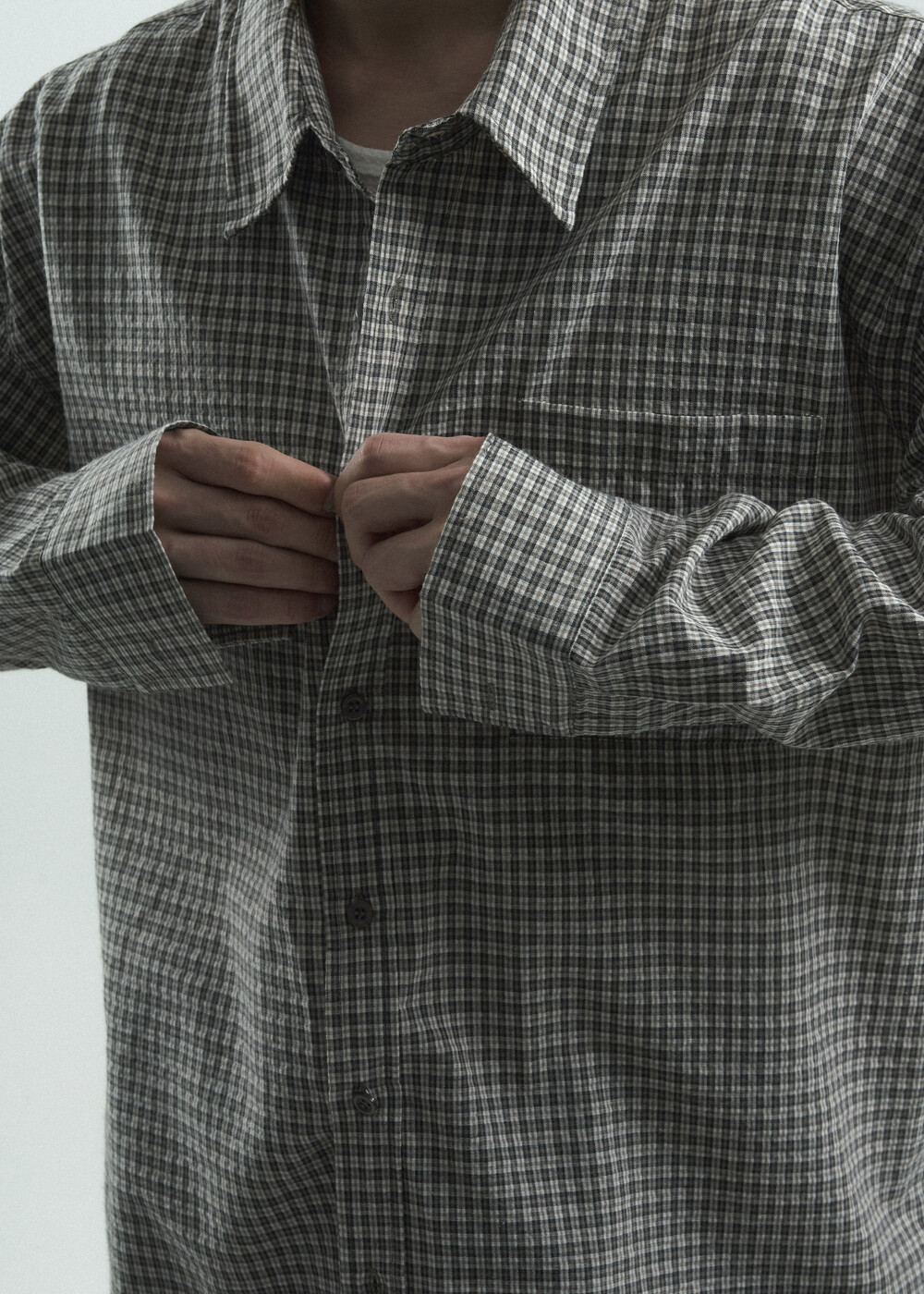 - 다운톤 컬러감의 그레이브라운 느낌을 무채색느낌으로 잘 담아낸 체크 패턴 셔츠 제품
