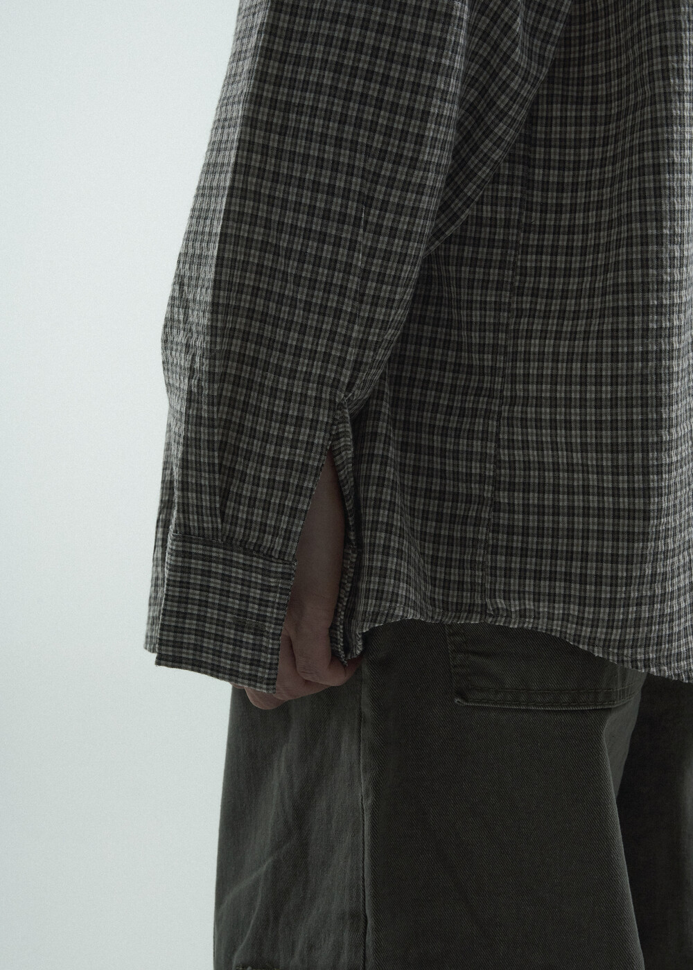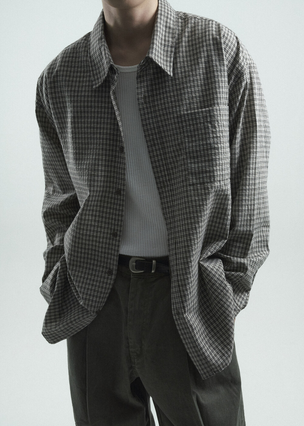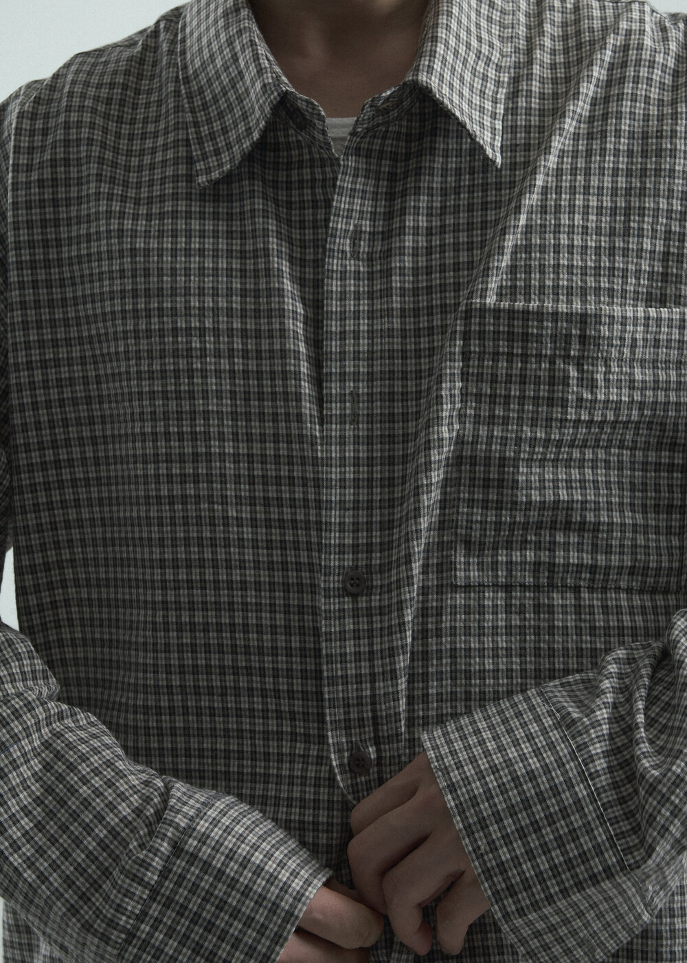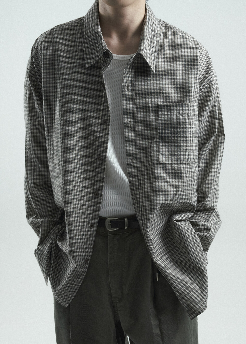- 다운톤 컬러감의 그레이브라운 느낌을 무채색느낌으로 잘 담아낸 체크 패턴 셔츠 제품