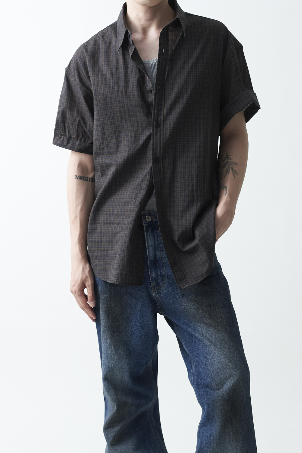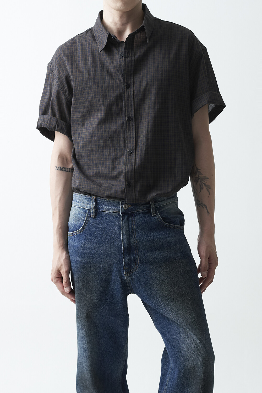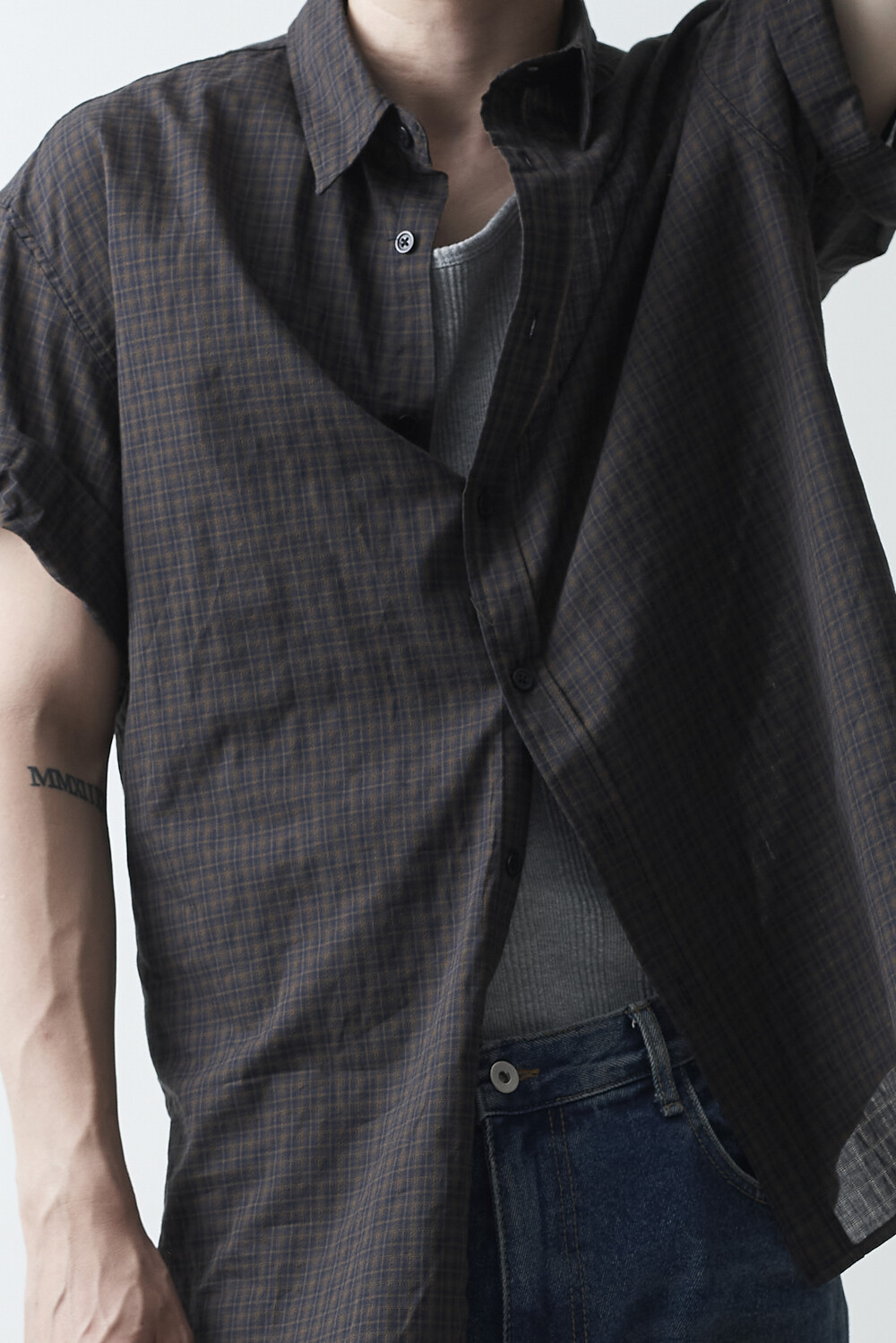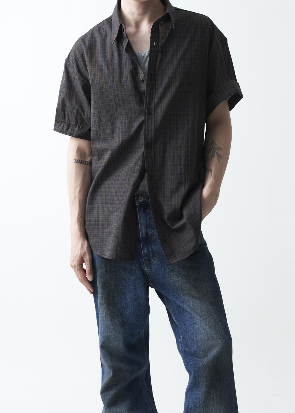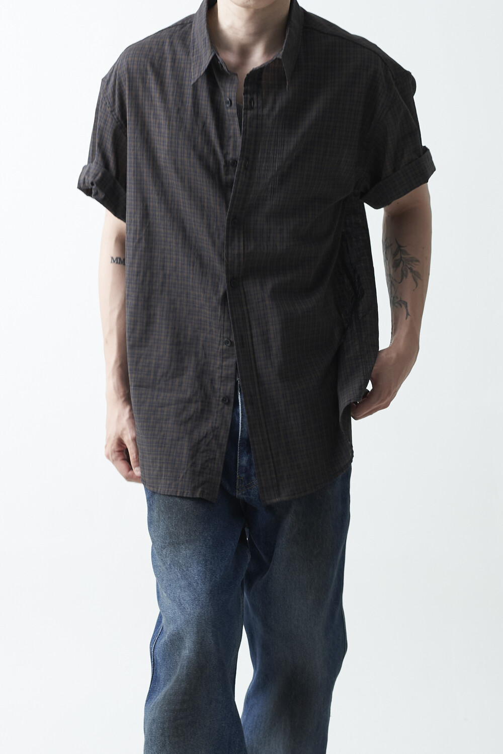 워시드 블랙 컬러감의 잔체크 패턴 하프 셔츠 제품입니다. 컬러매치 버튼과 전체적으로 미니멀한 디테일들이 매력적이며, 데일리한 코디에 포인트주기 좋은 셔츠 제품입니다.