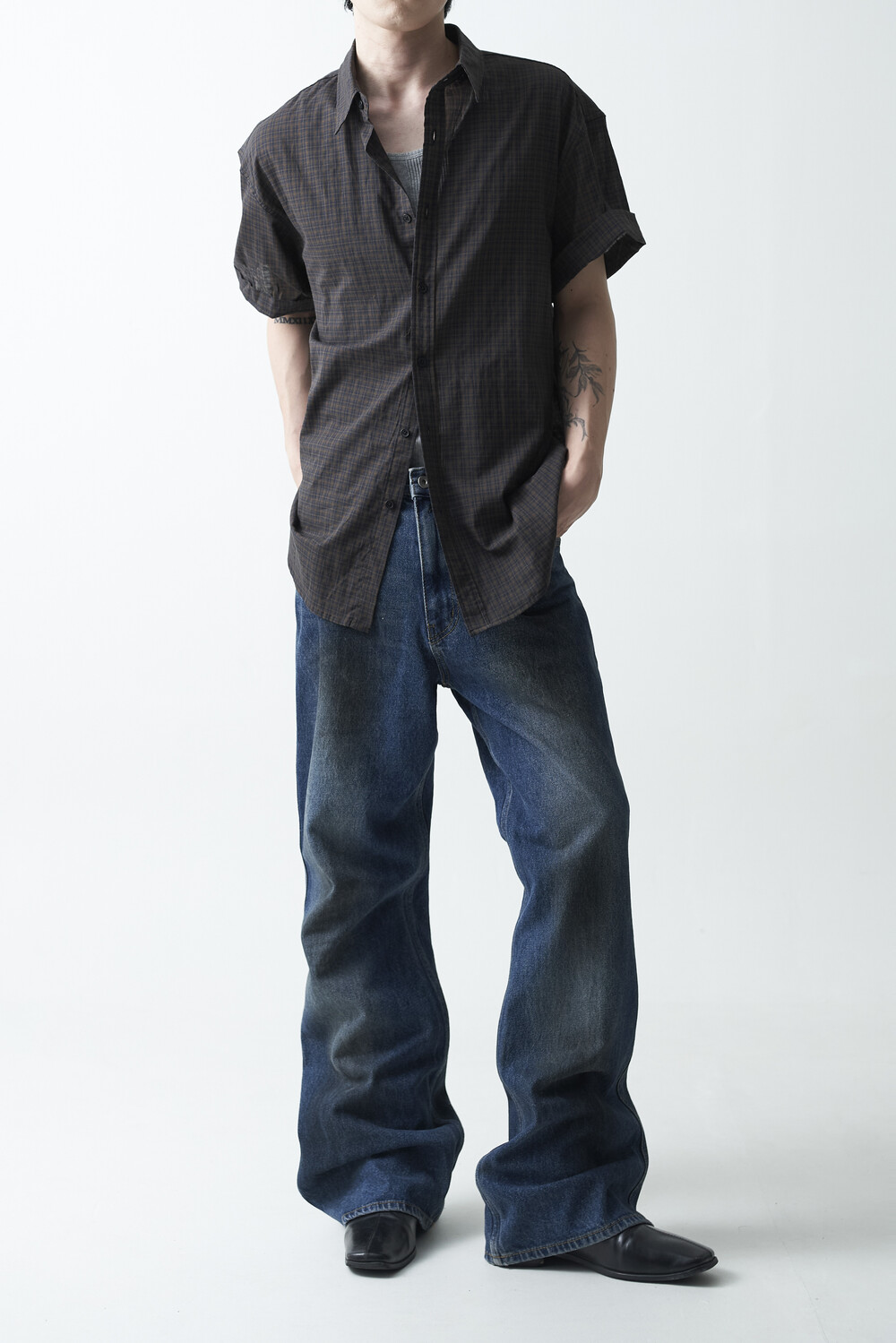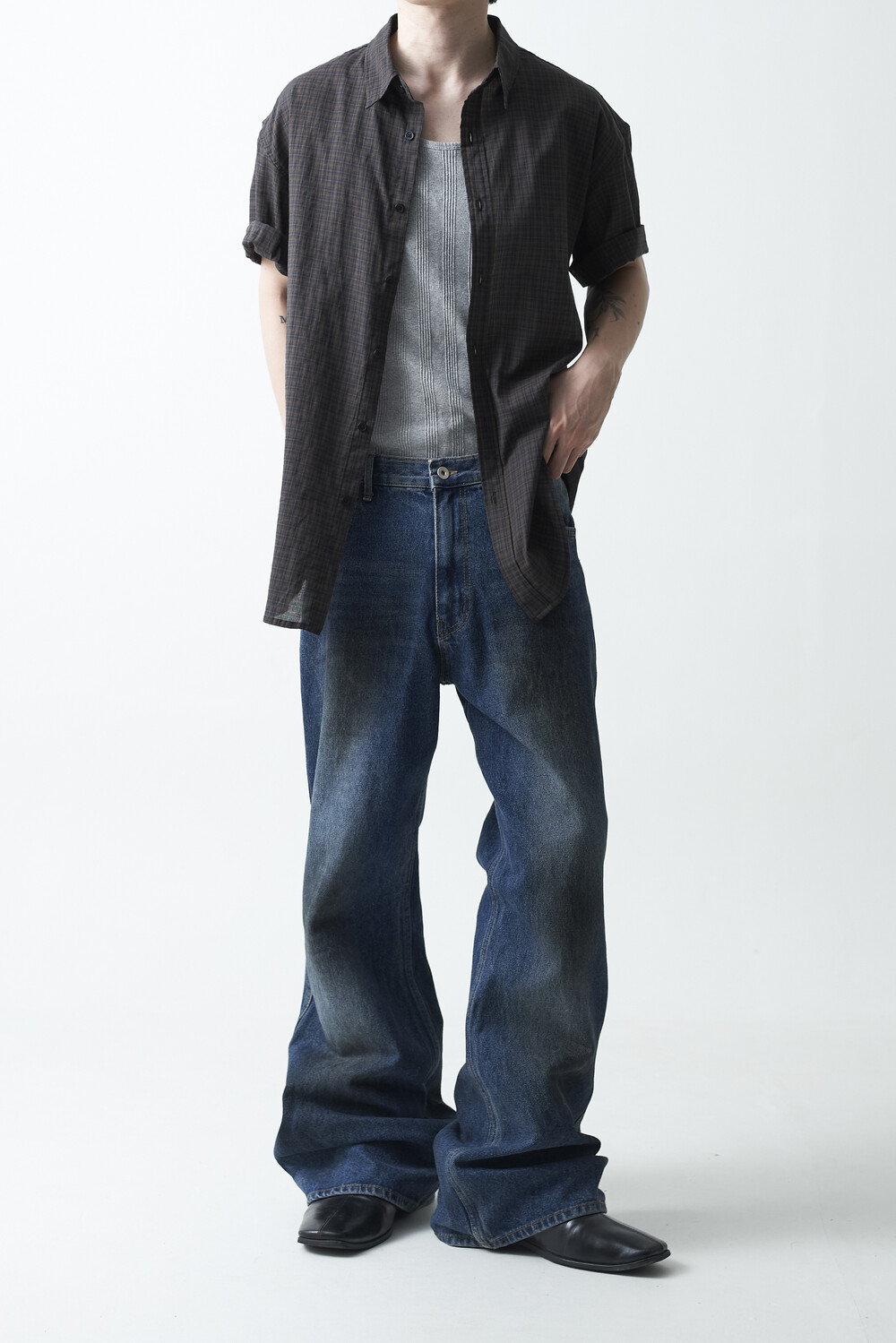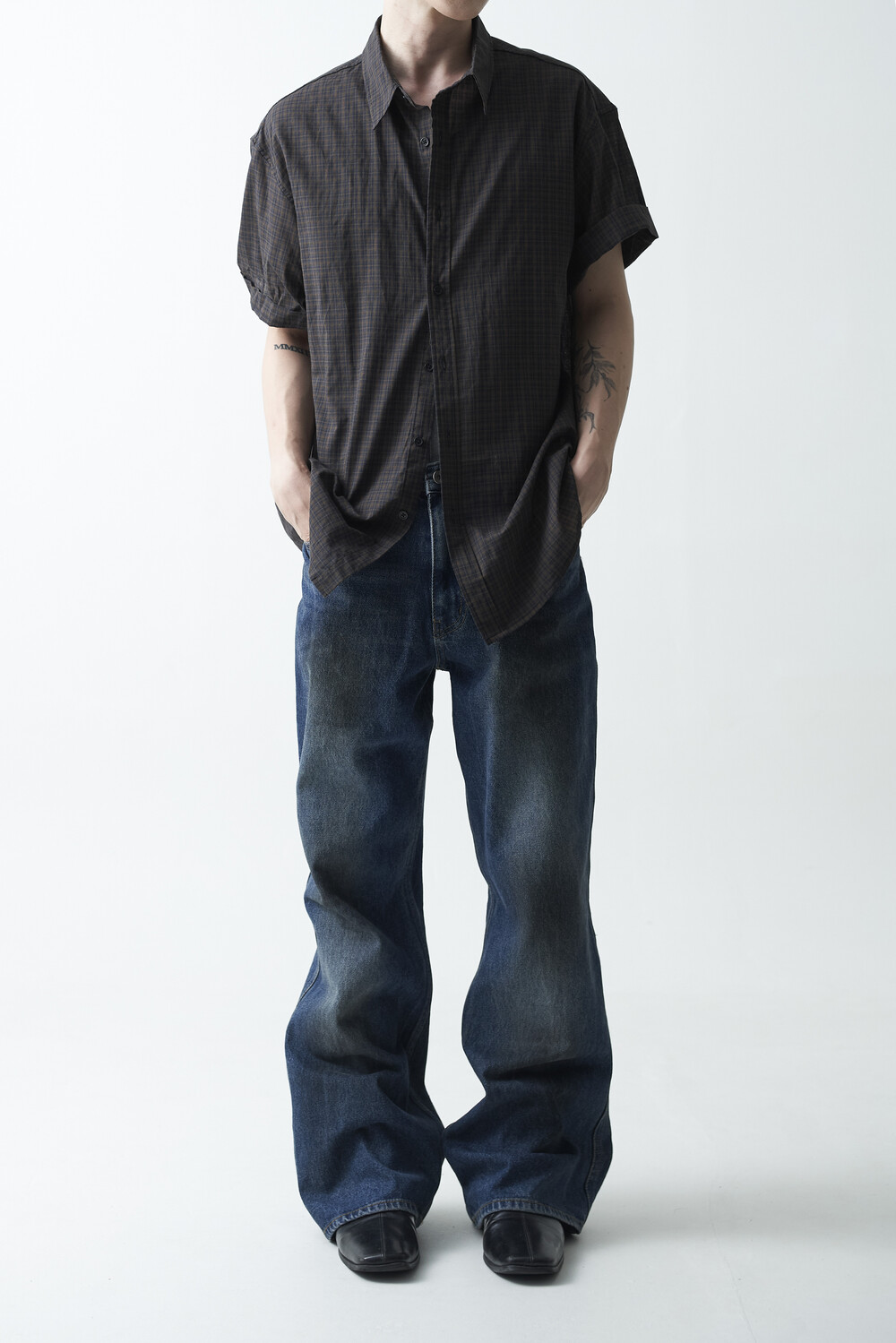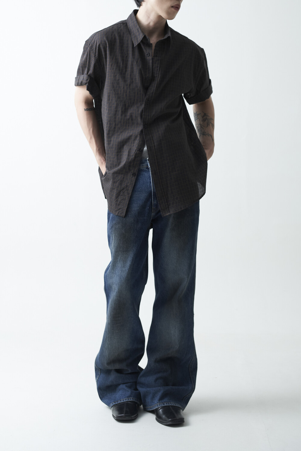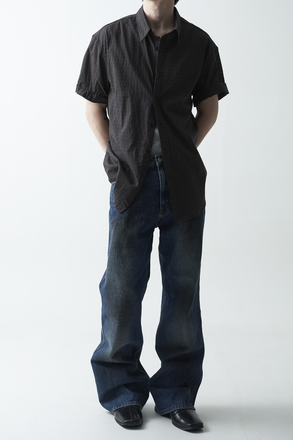 워시드 블랙 컬러감의 잔체크 패턴 하프 셔츠 제품입니다. 컬러매치 버튼과 전체적으로 미니멀한 디테일들이 매력적이며, 데일리한 코디에 포인트주기 좋은 셔츠 제품입니다.