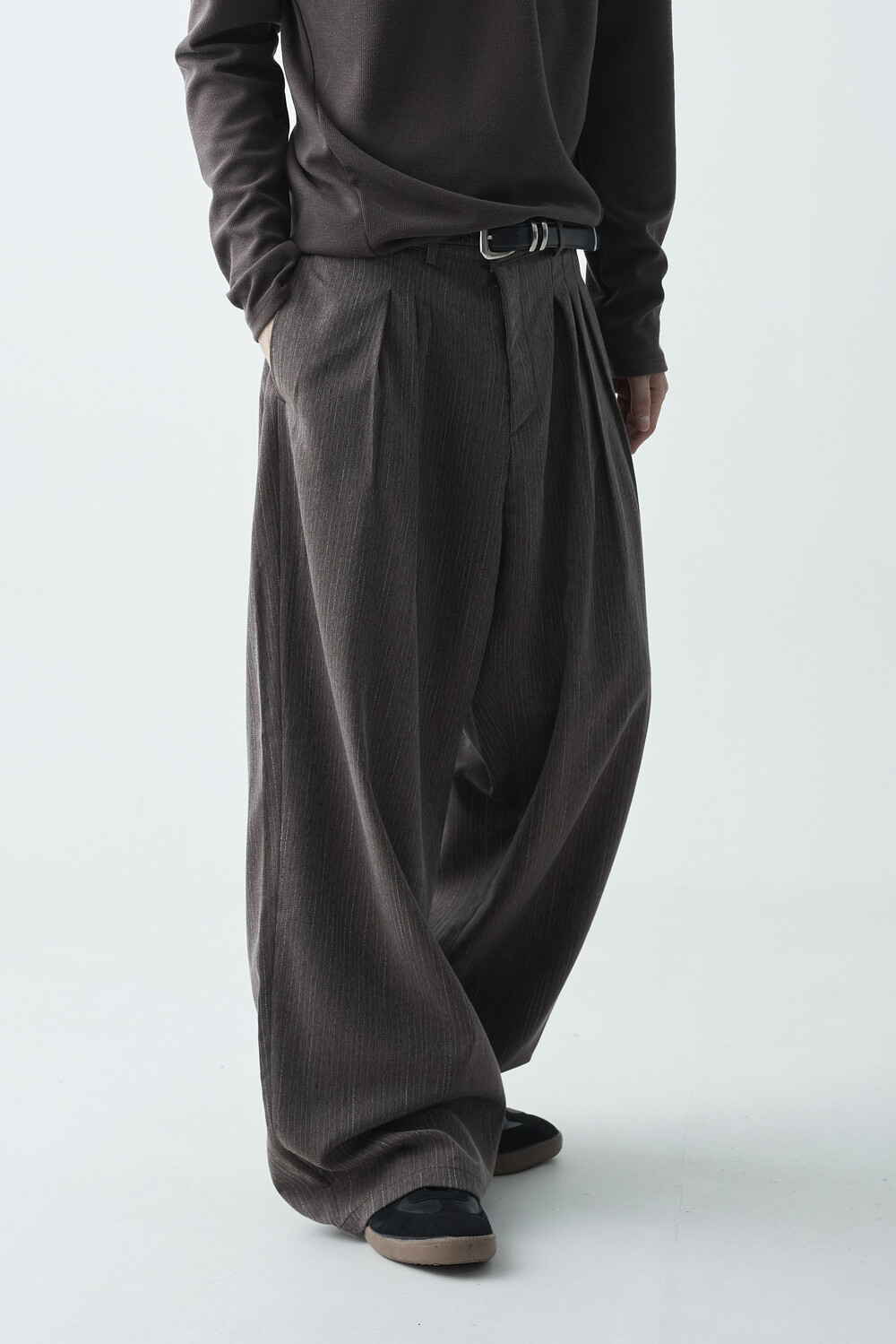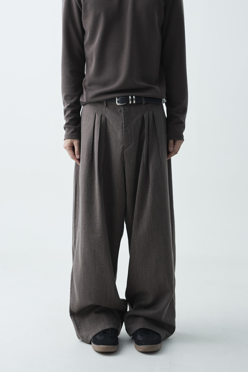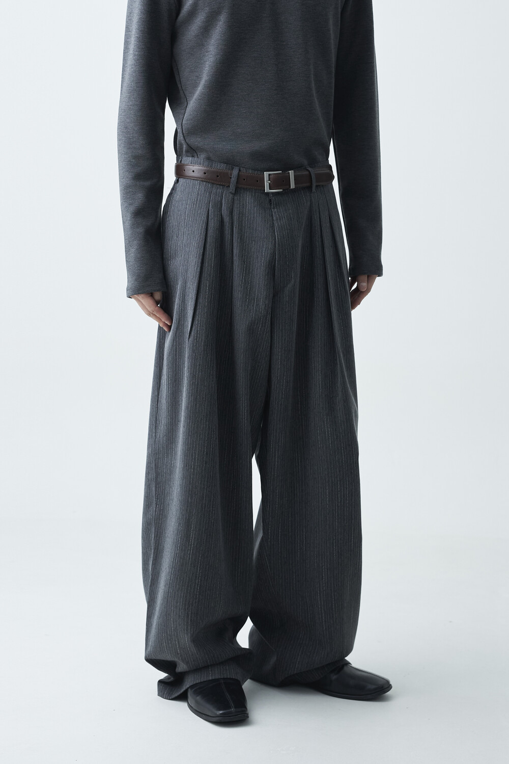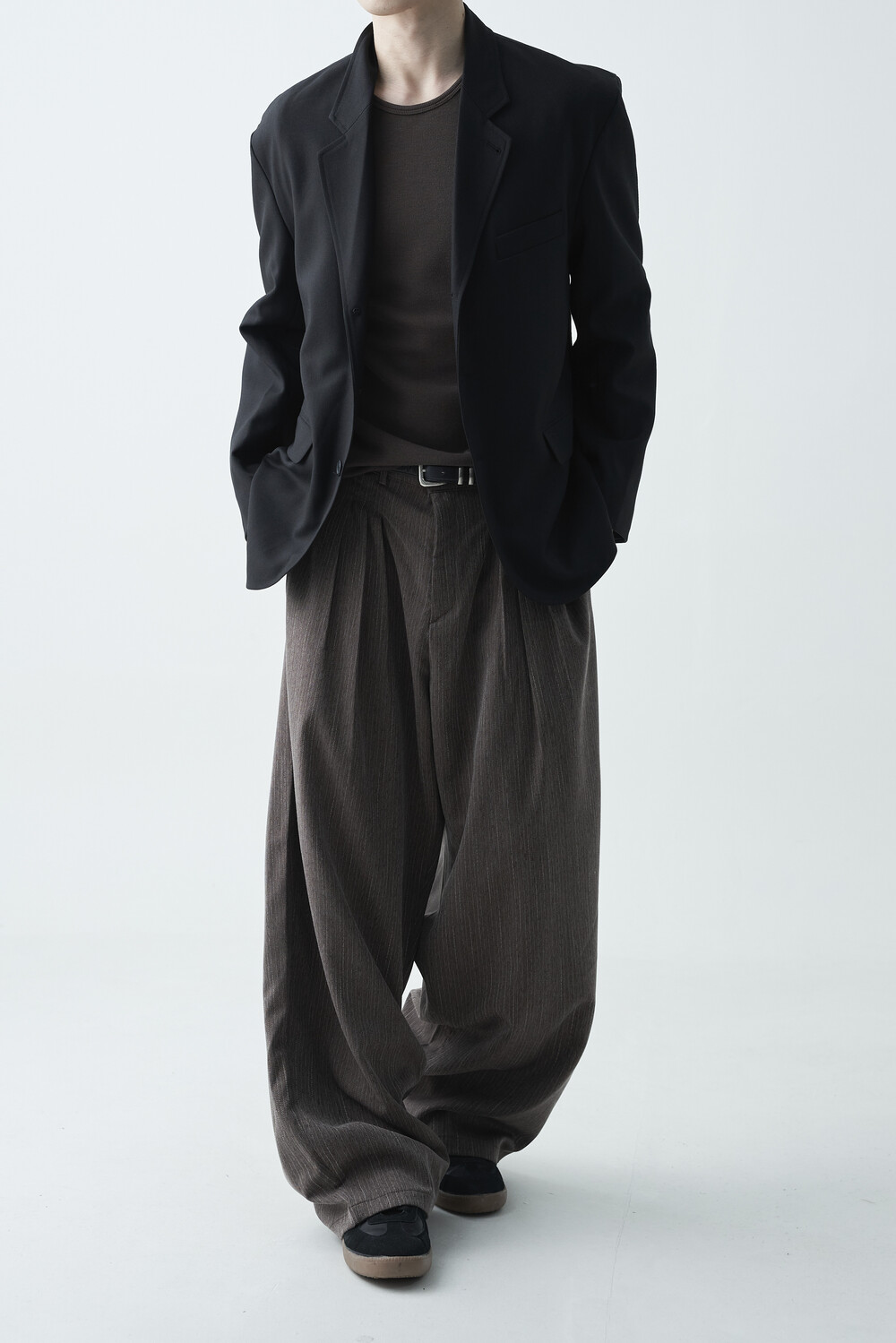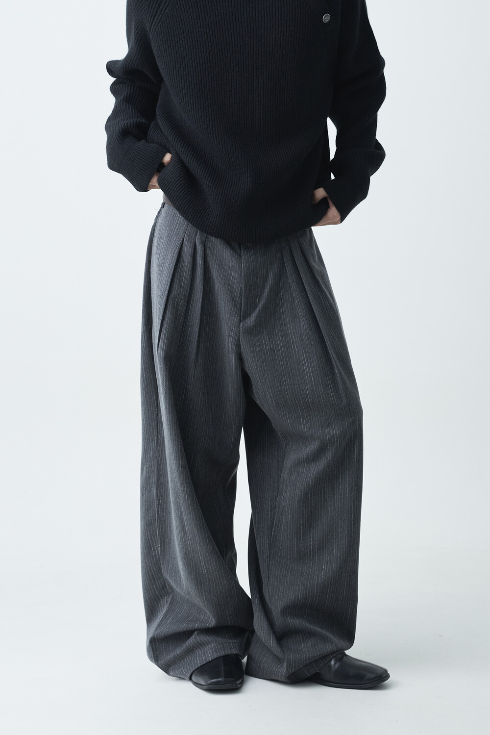- 스트라이프 헤링본 패턴과 3핀턱 디테일이 적용된 오버와이드 울 슬렉스 제품입니다.