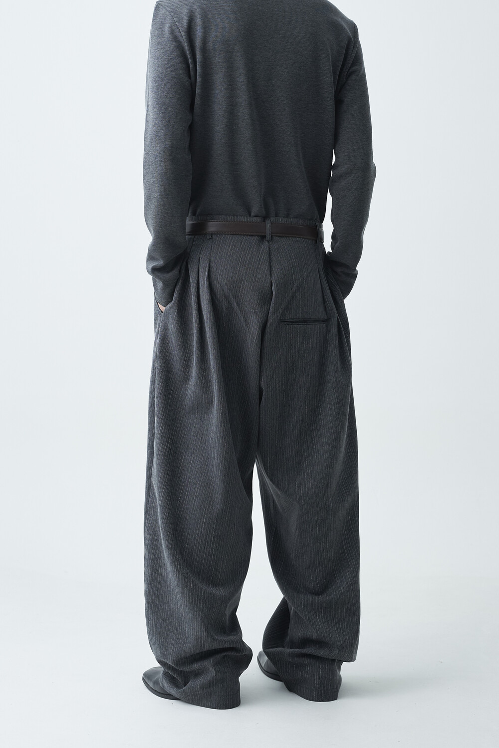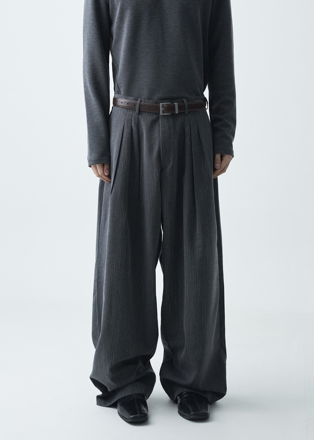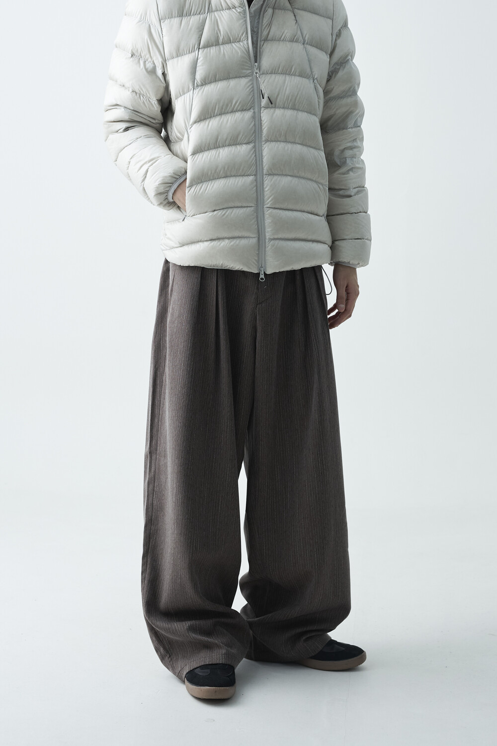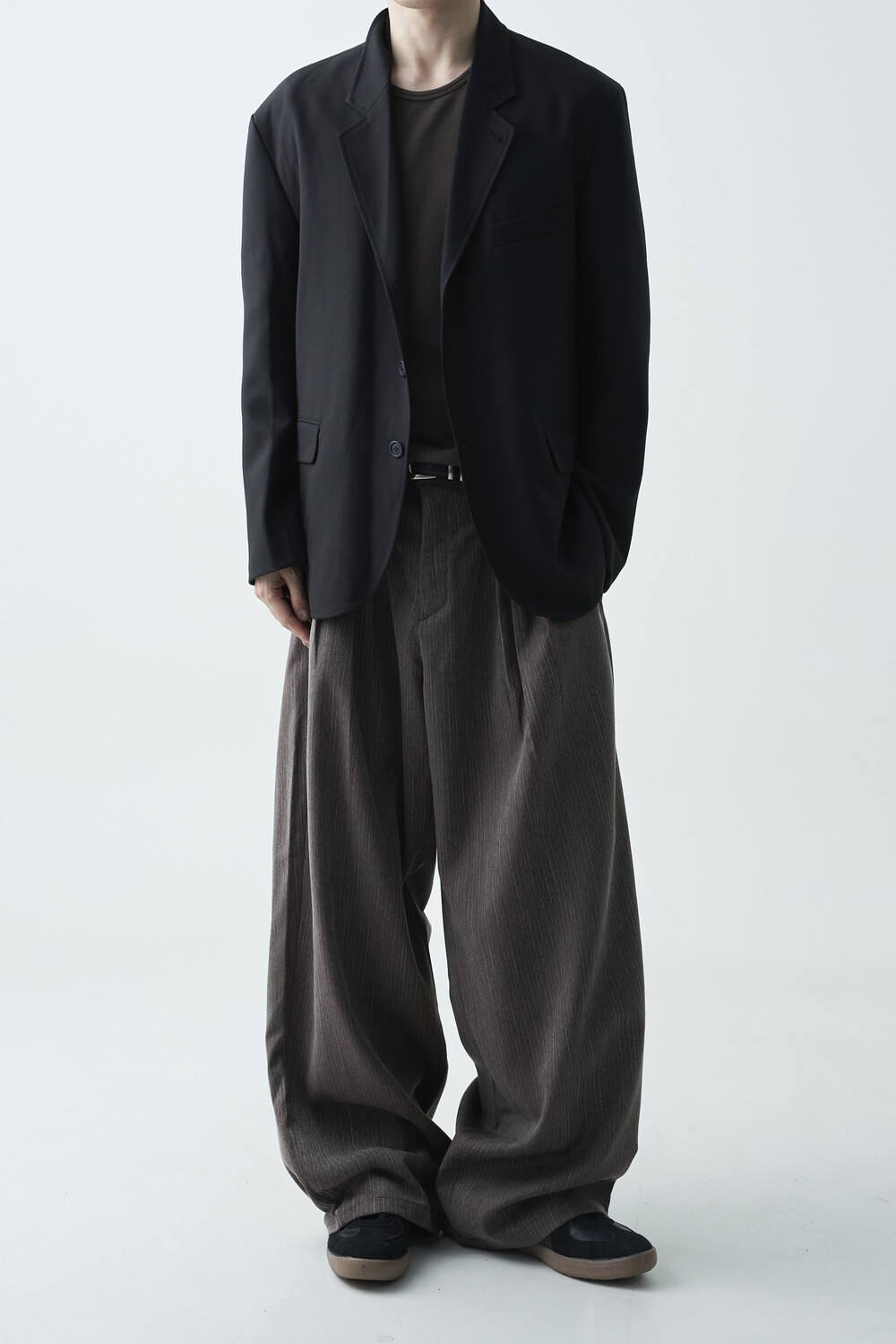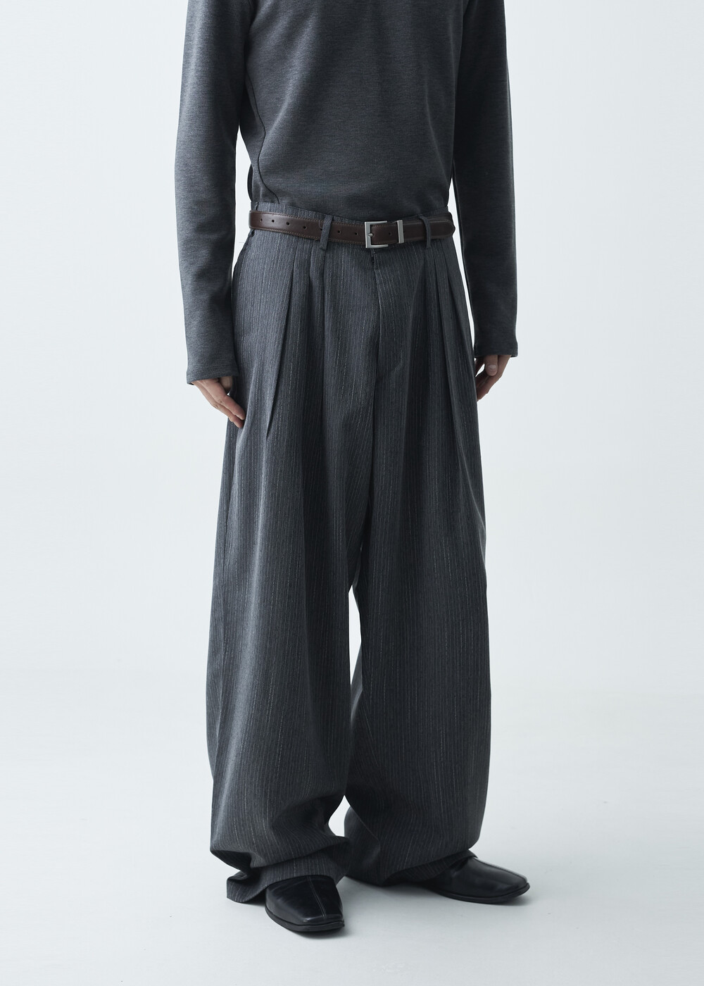 - 스트라이프 헤링본 패턴과 3핀턱 디테일이 적용된 오버와이드 울 슬렉스 제품입니다.