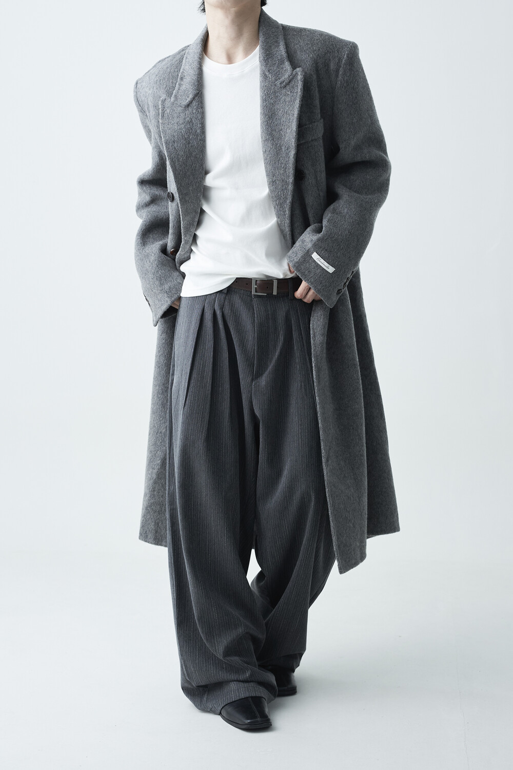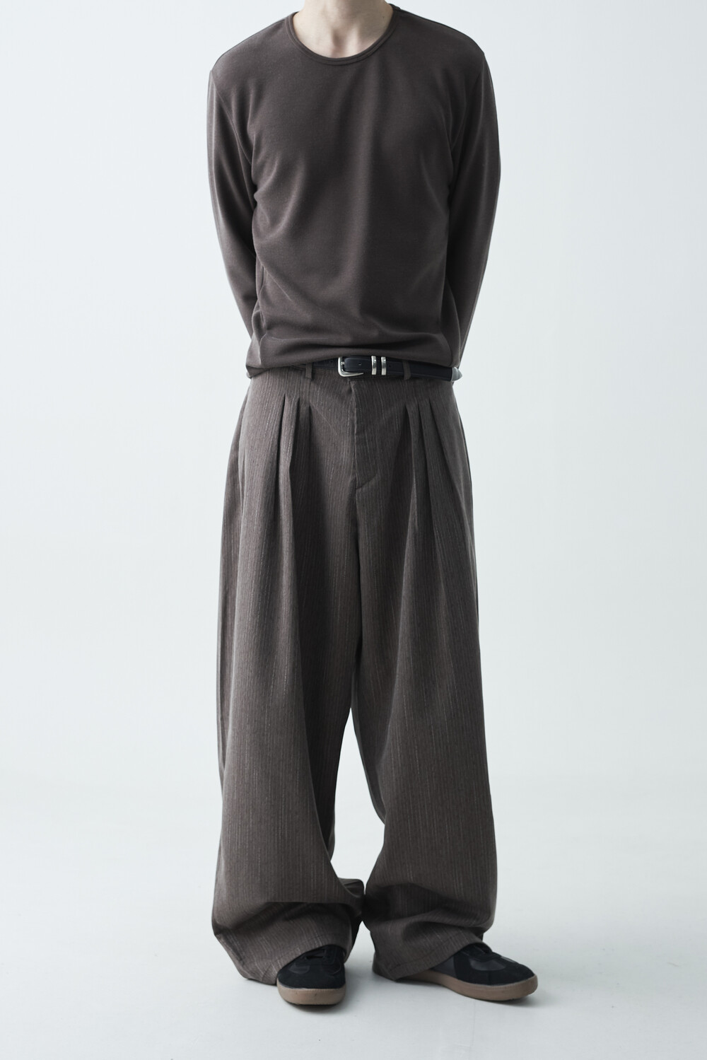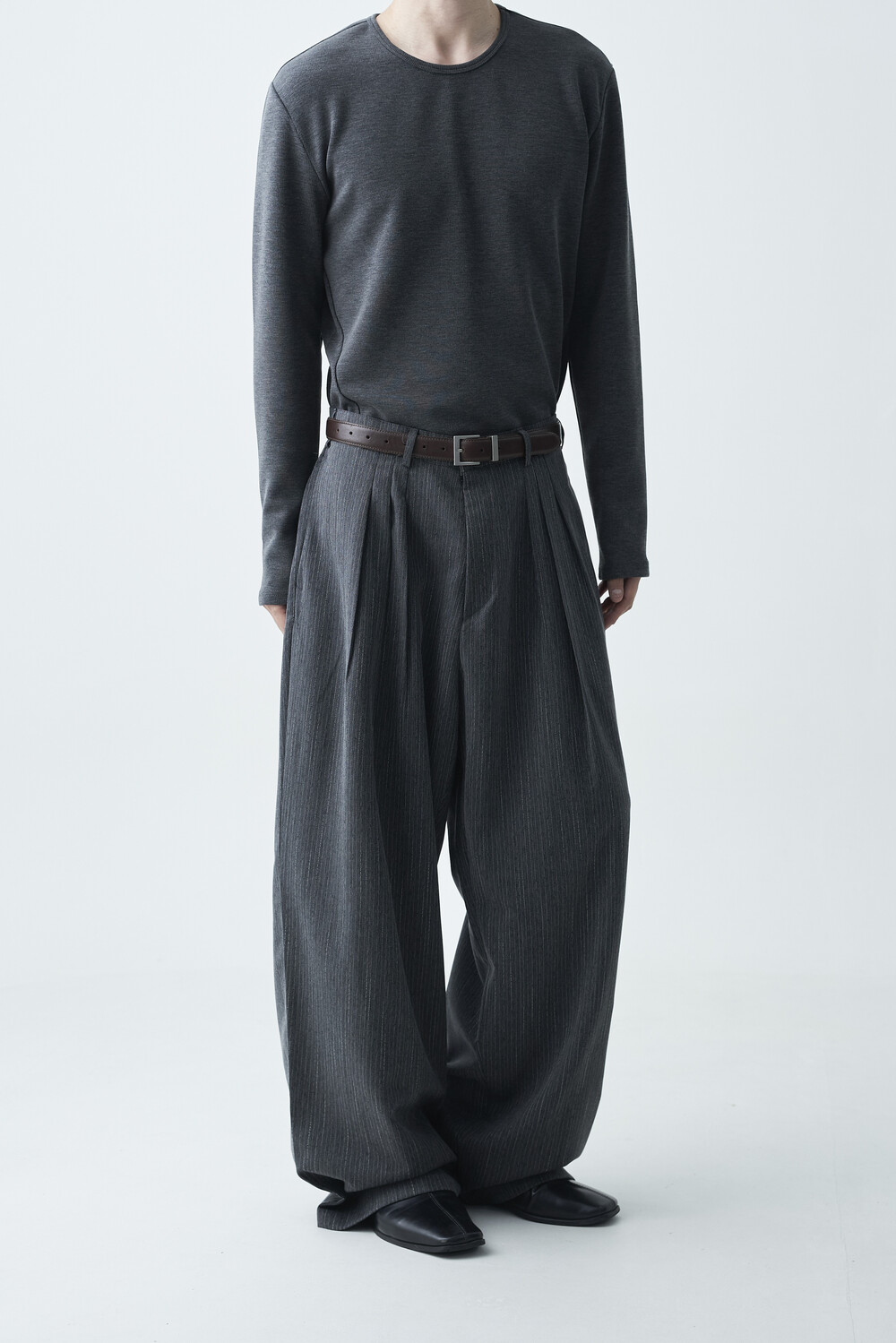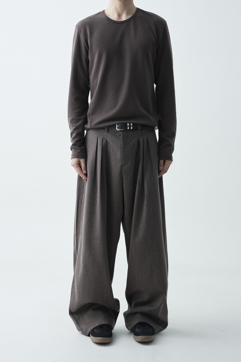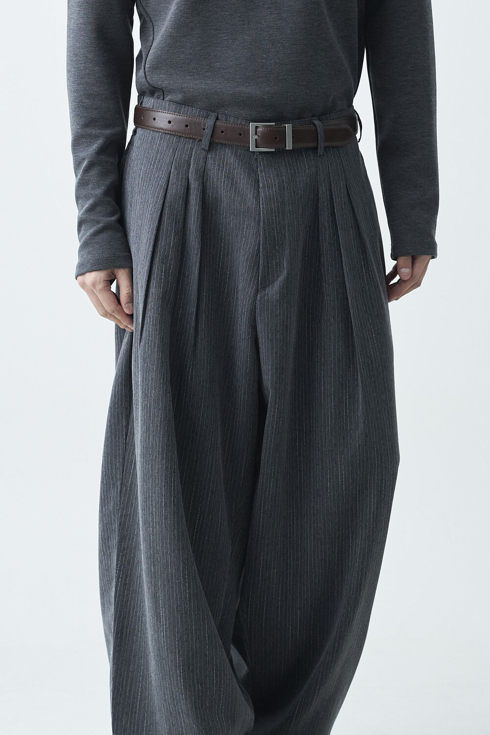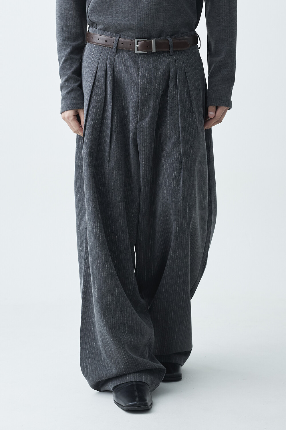 - 스트라이프 헤링본 패턴과 3핀턱 디테일이 적용된 오버와이드 울 슬렉스 제품입니다.