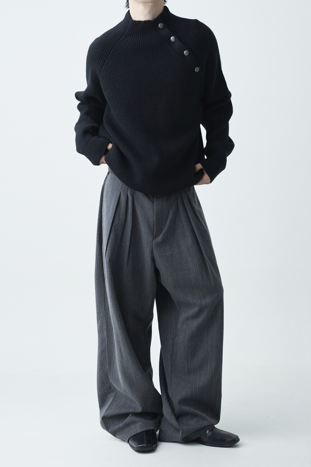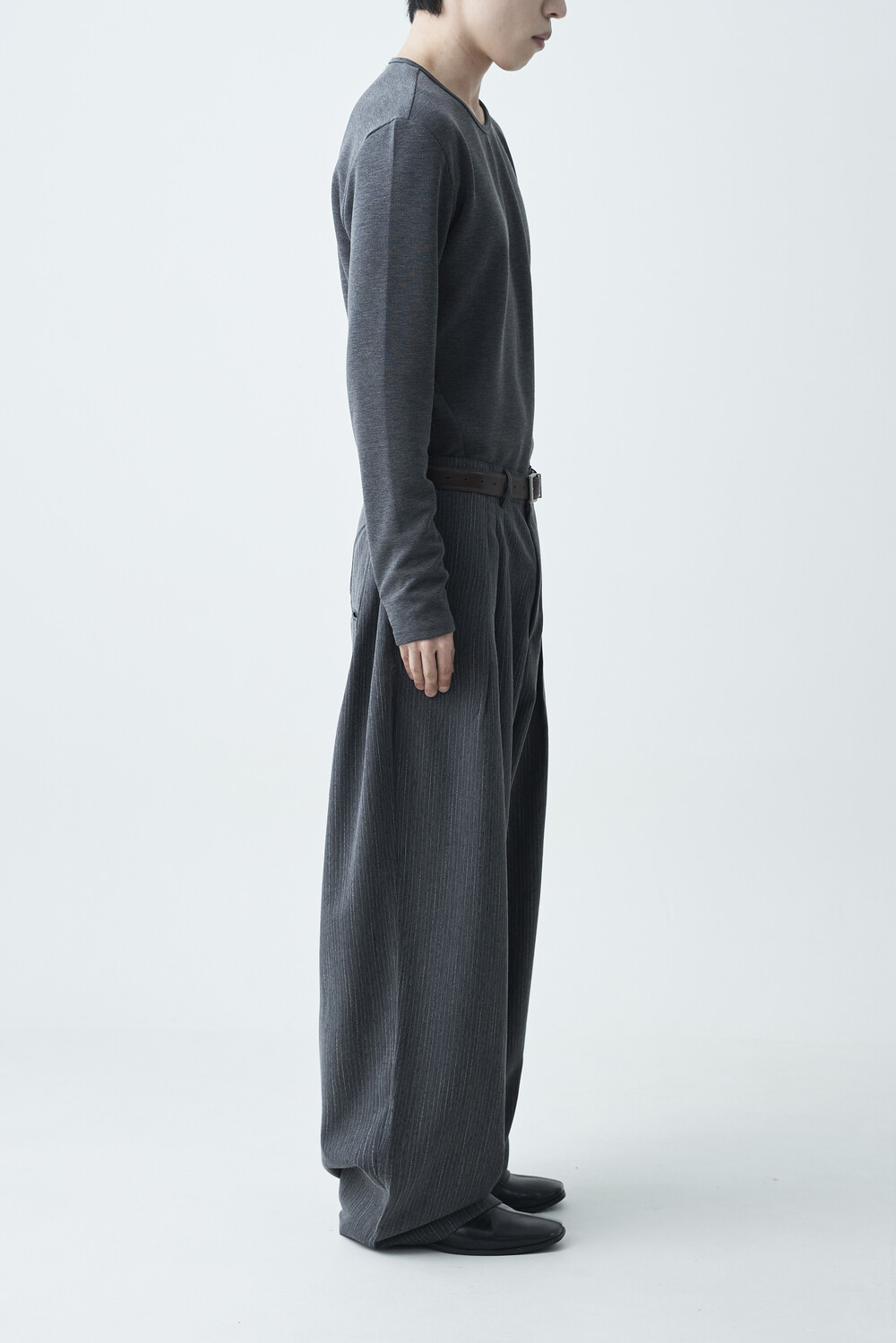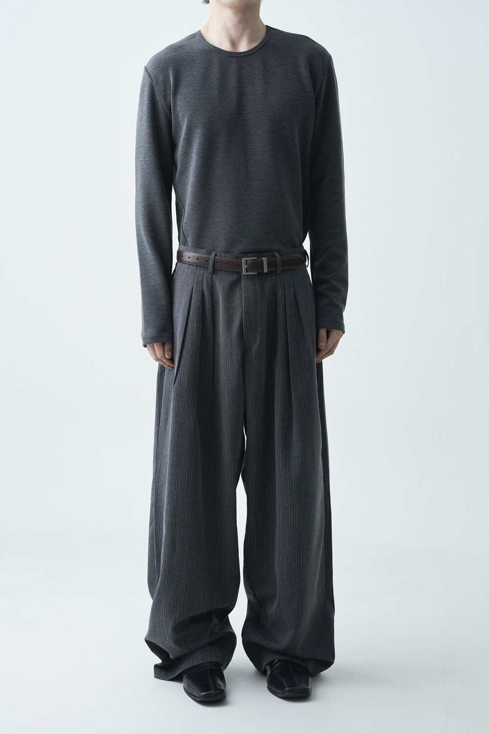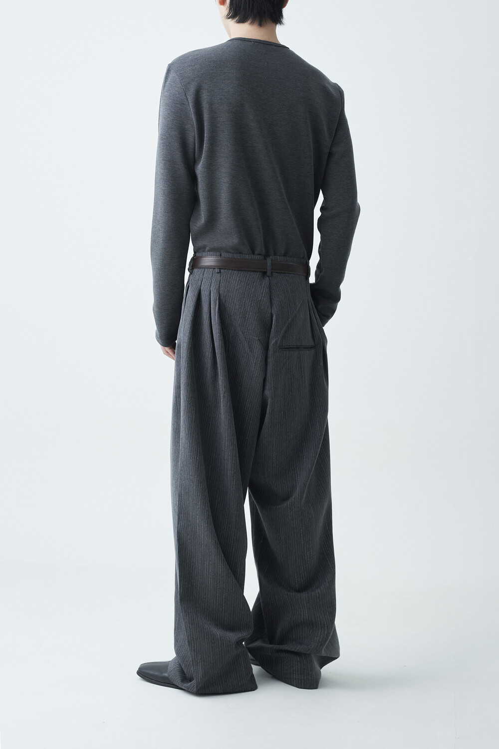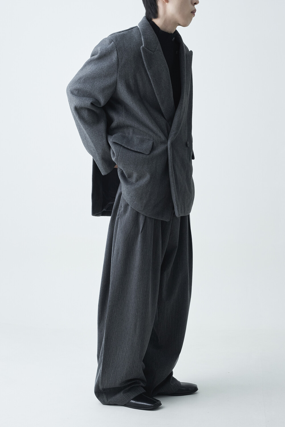 - 스트라이프 헤링본 패턴과 3핀턱 디테일이 적용된 오버와이드 울 슬렉스 제품입니다.