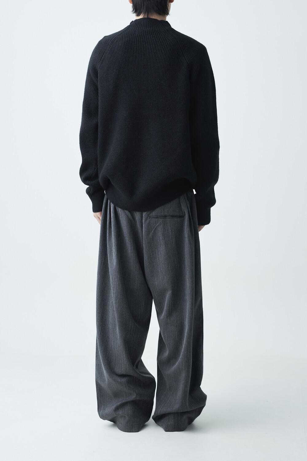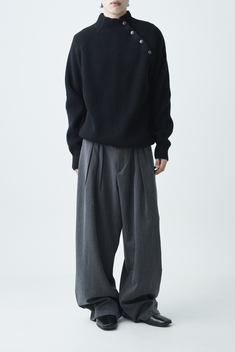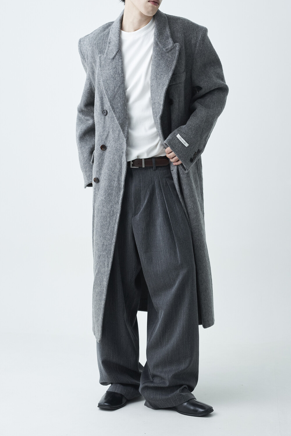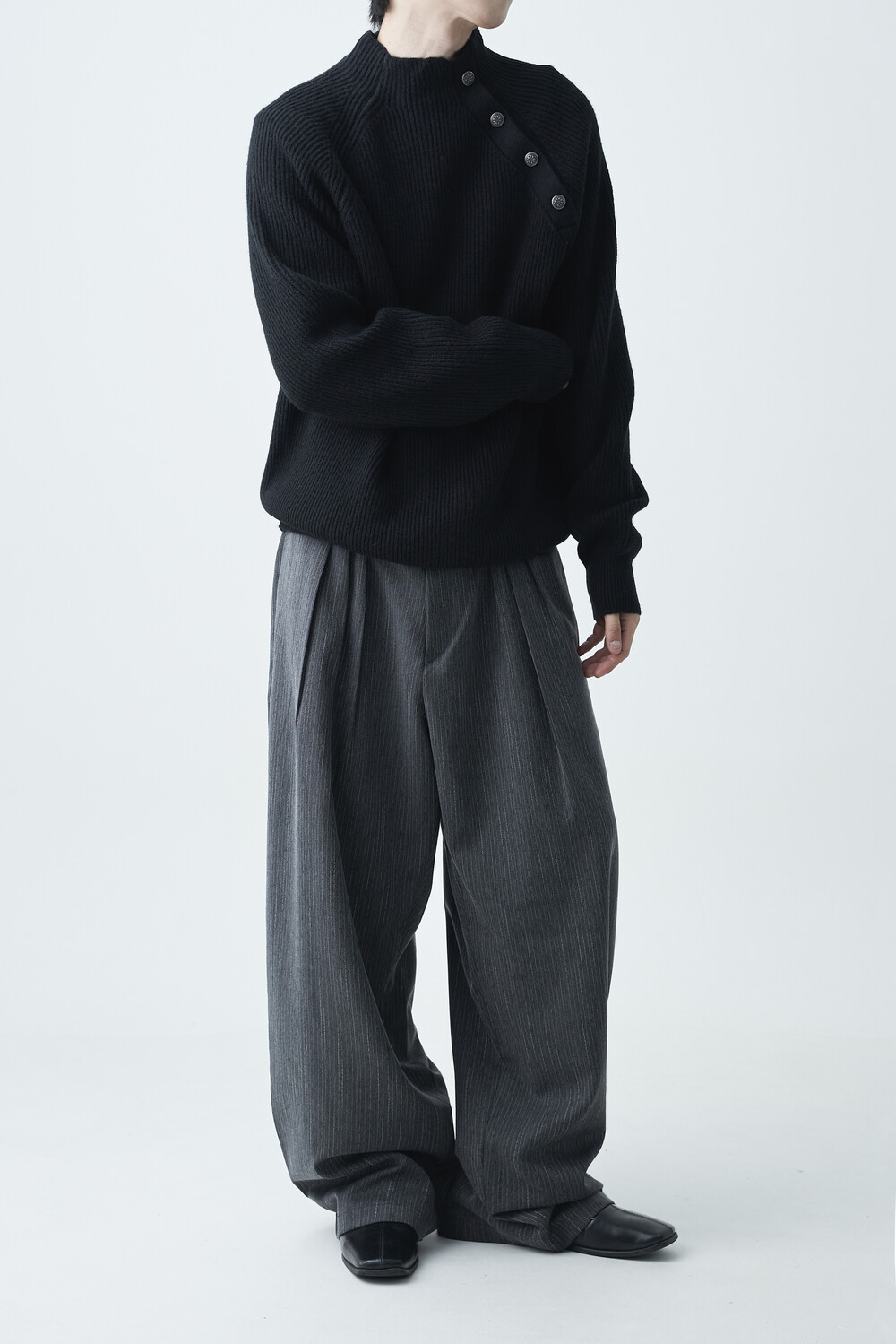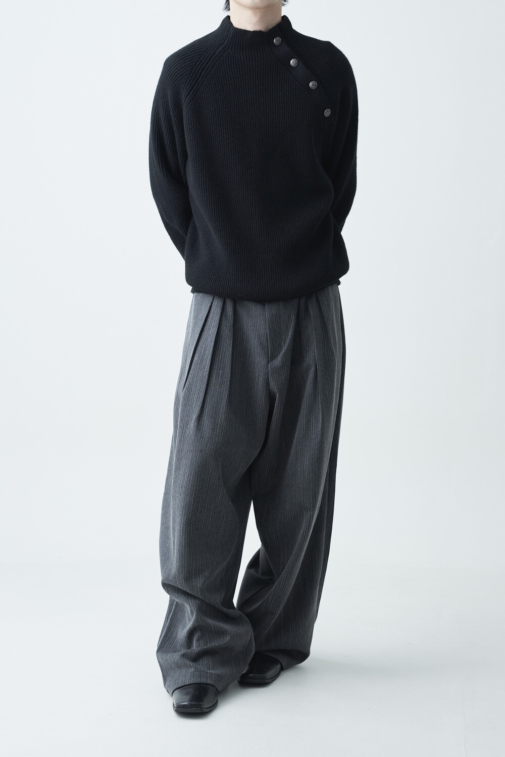 - 스트라이프 헤링본 패턴과 3핀턱 디테일이 적용된 오버와이드 울 슬렉스 제품입니다.