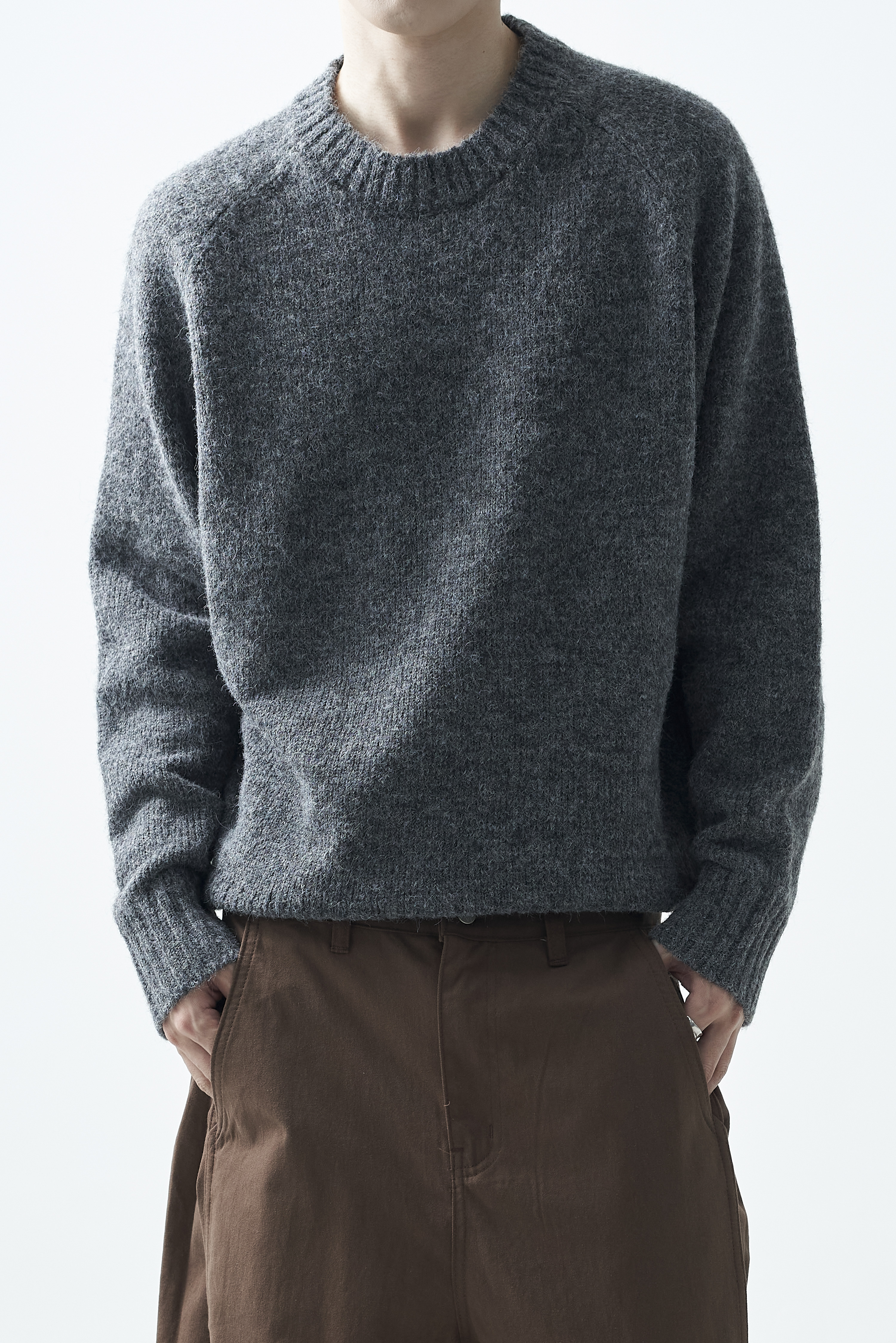 - 헤비한 울 소재의 래글런 니트 제품으로 여러개의 실이 믹스된 듯한 보카시 니트 제품입니다. 세미 크롭한 기장감과 두꺼운 5게이지 니트로서 한겨울 까지 착용하실 수 있습니다.