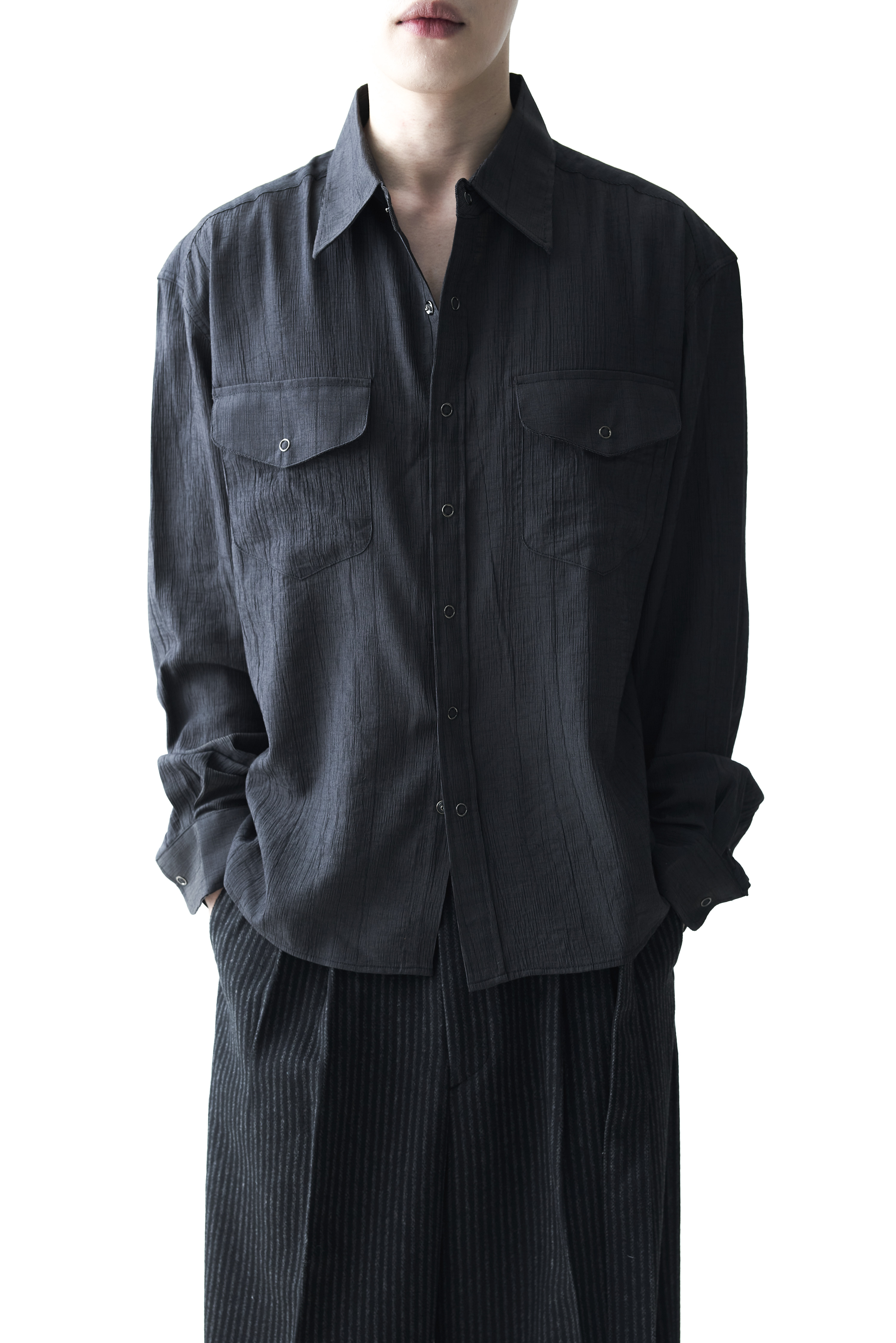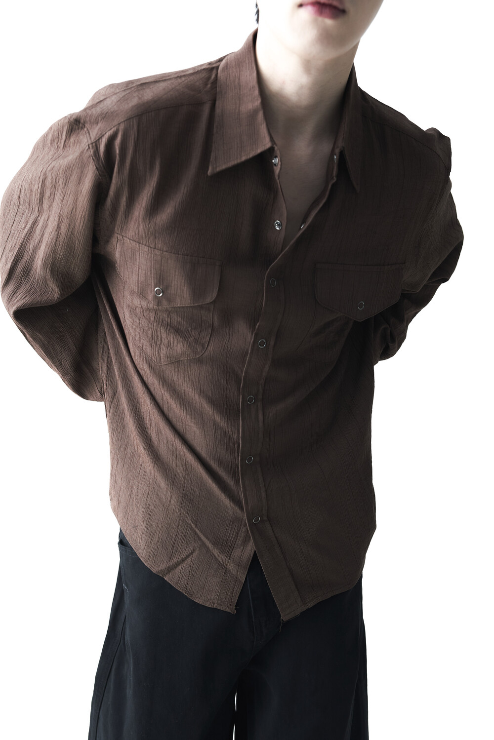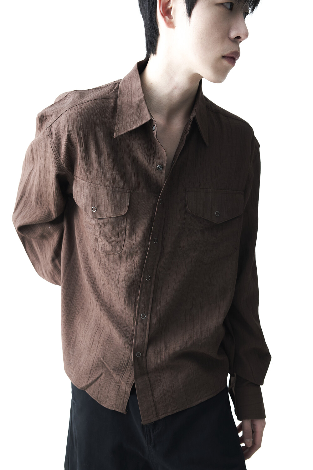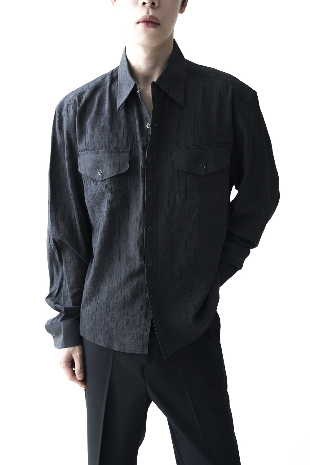 - 고급스러운 터치감을 자아내는 레이온 소재감으로 구성된 실키한 투포켓 셔츠 제품입니다.