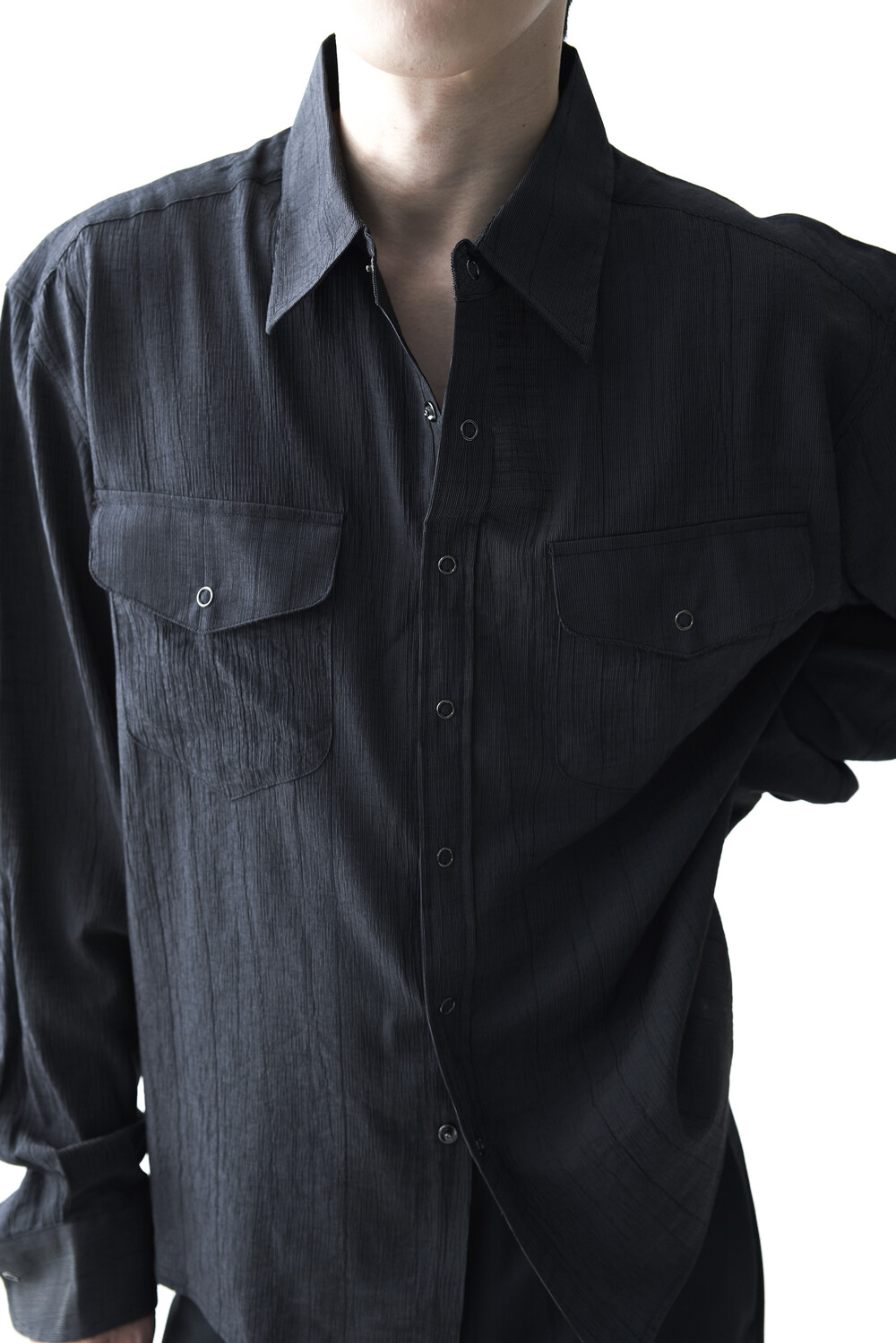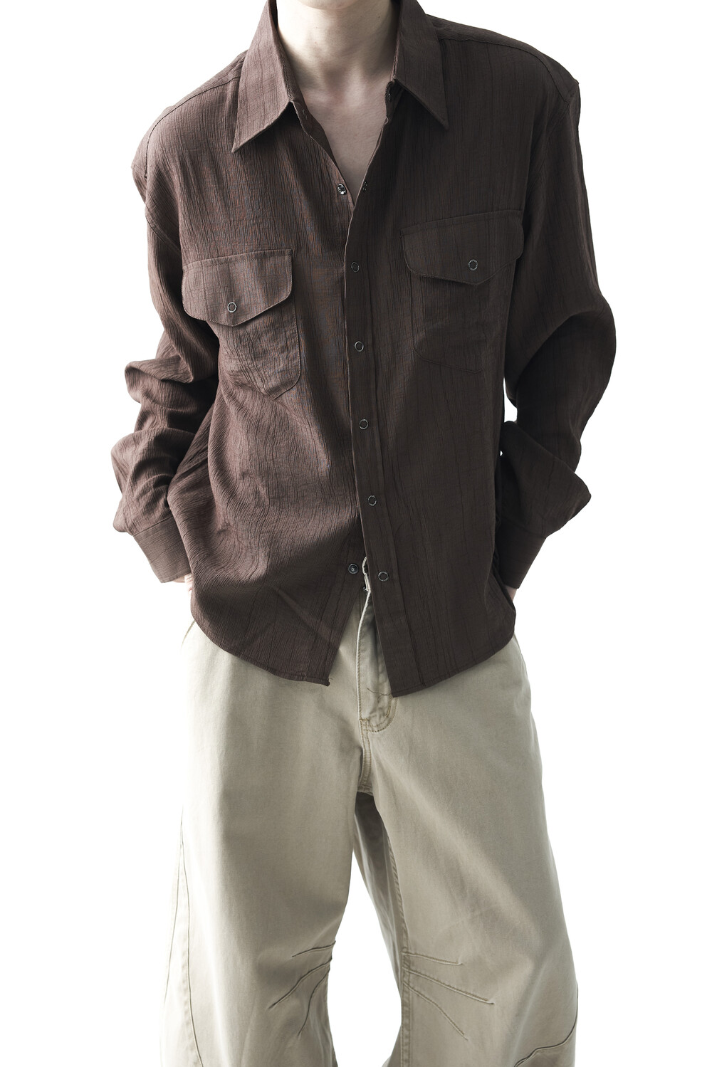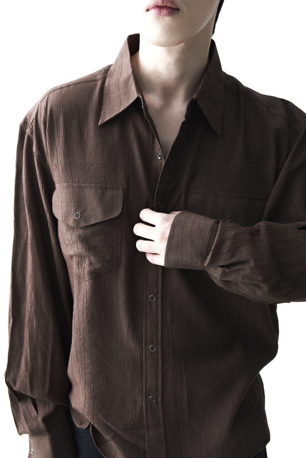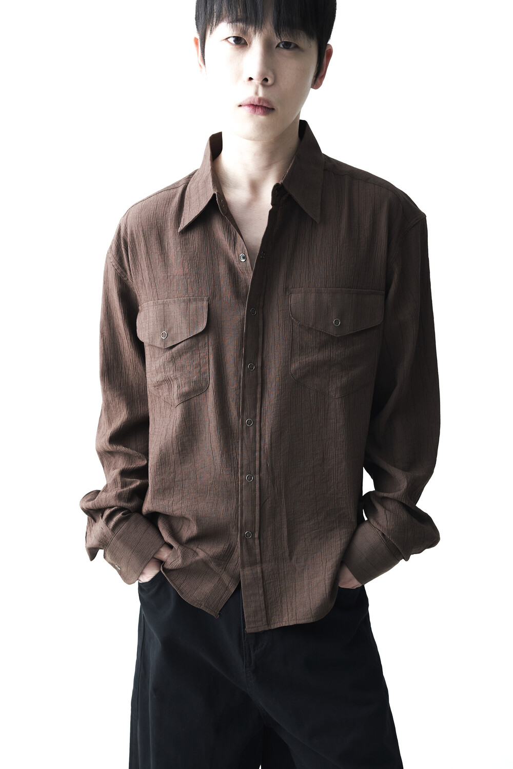 - 고급스러운 터치감을 자아내는 레이온 소재감으로 구성된 실키한 투포켓 셔츠 제품입니다.