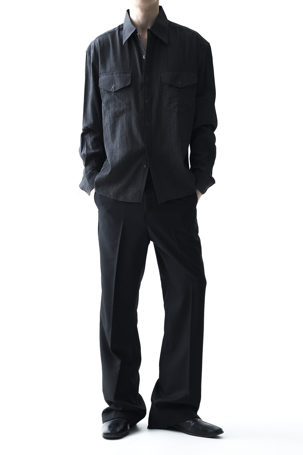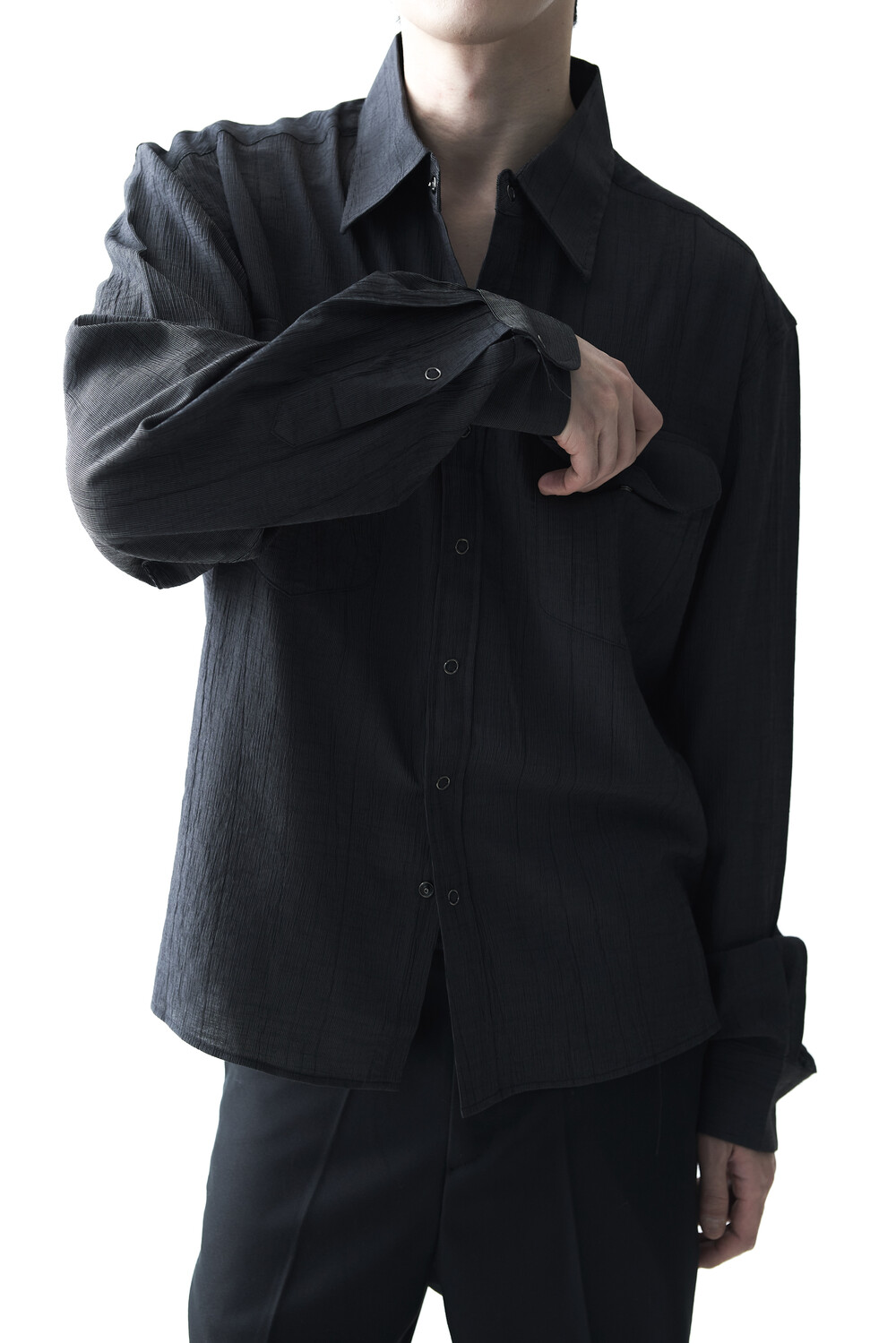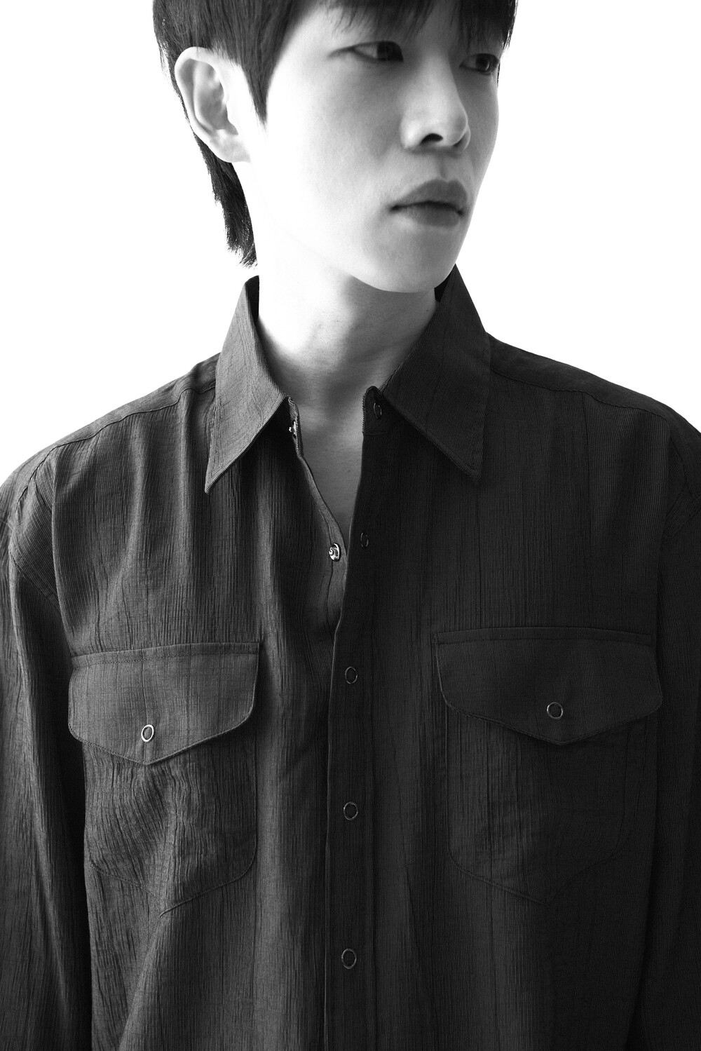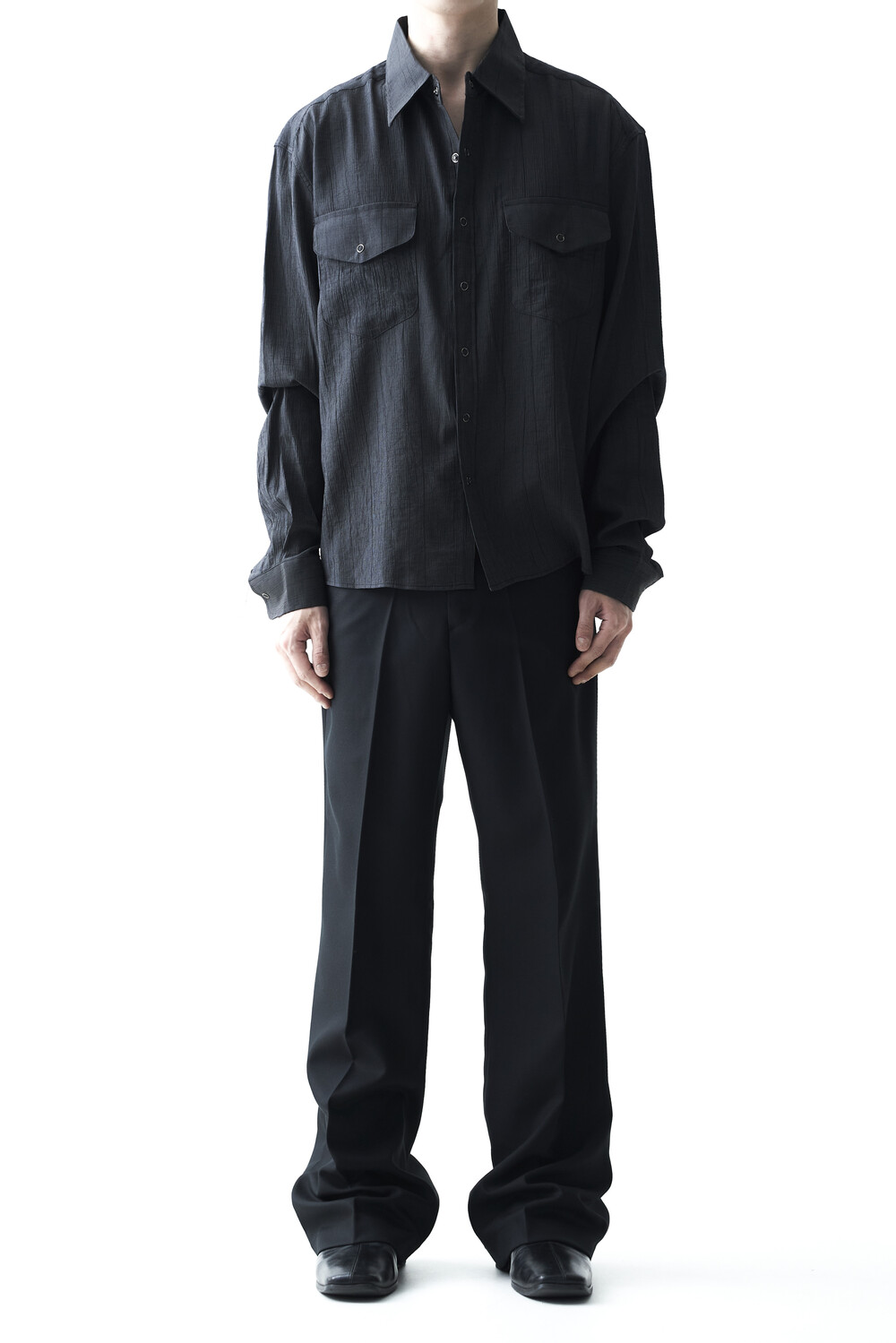 - 고급스러운 터치감을 자아내는 레이온 소재감으로 구성된 실키한 투포켓 셔츠 제품입니다.