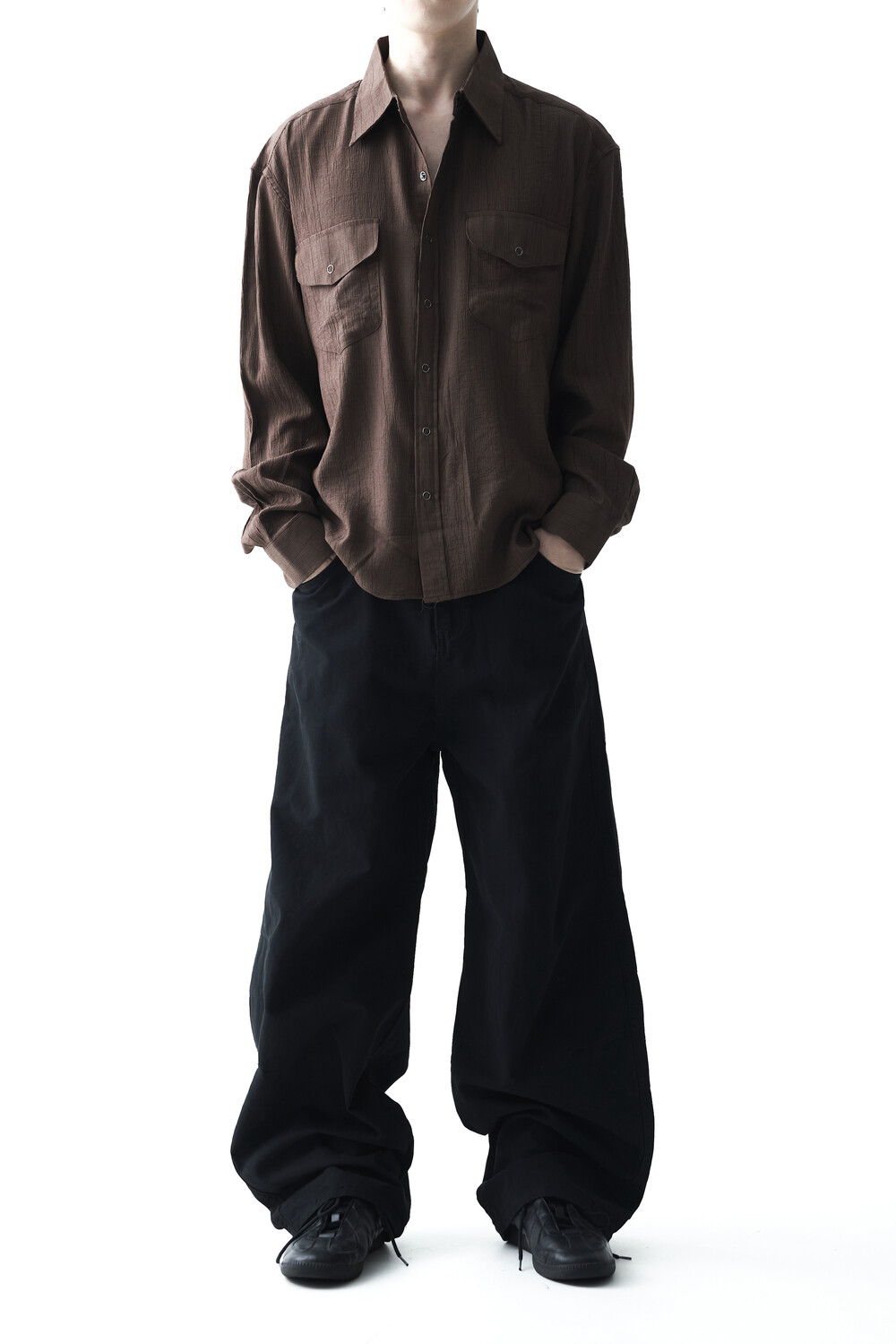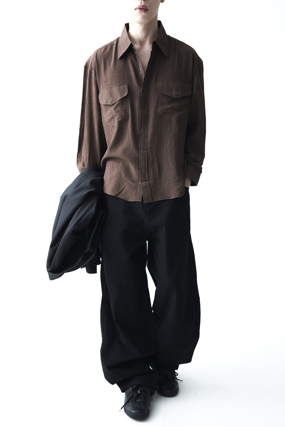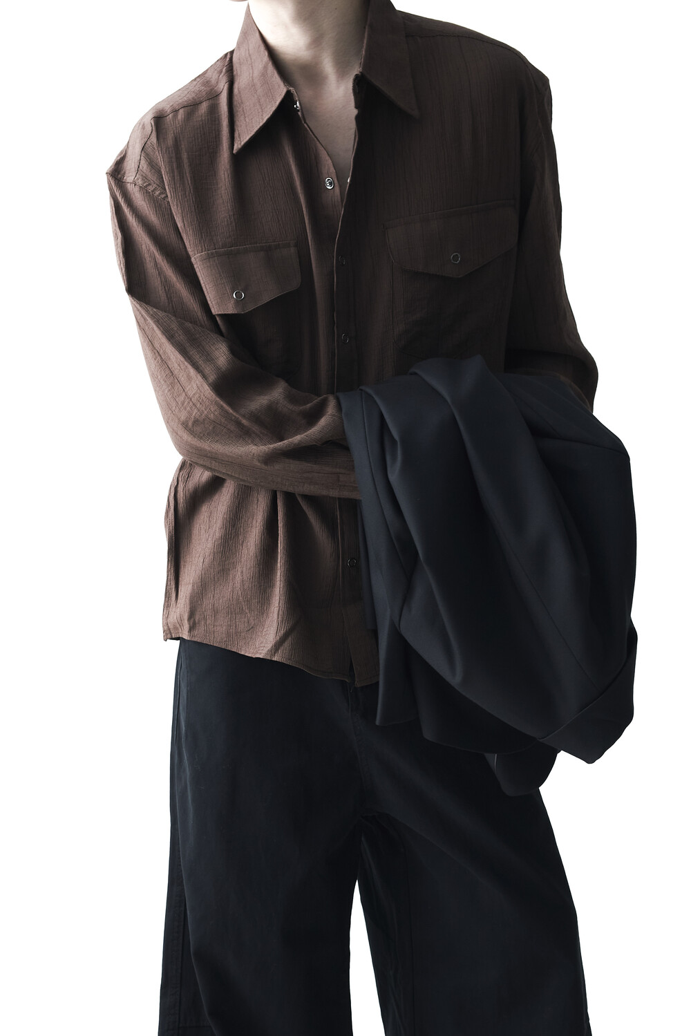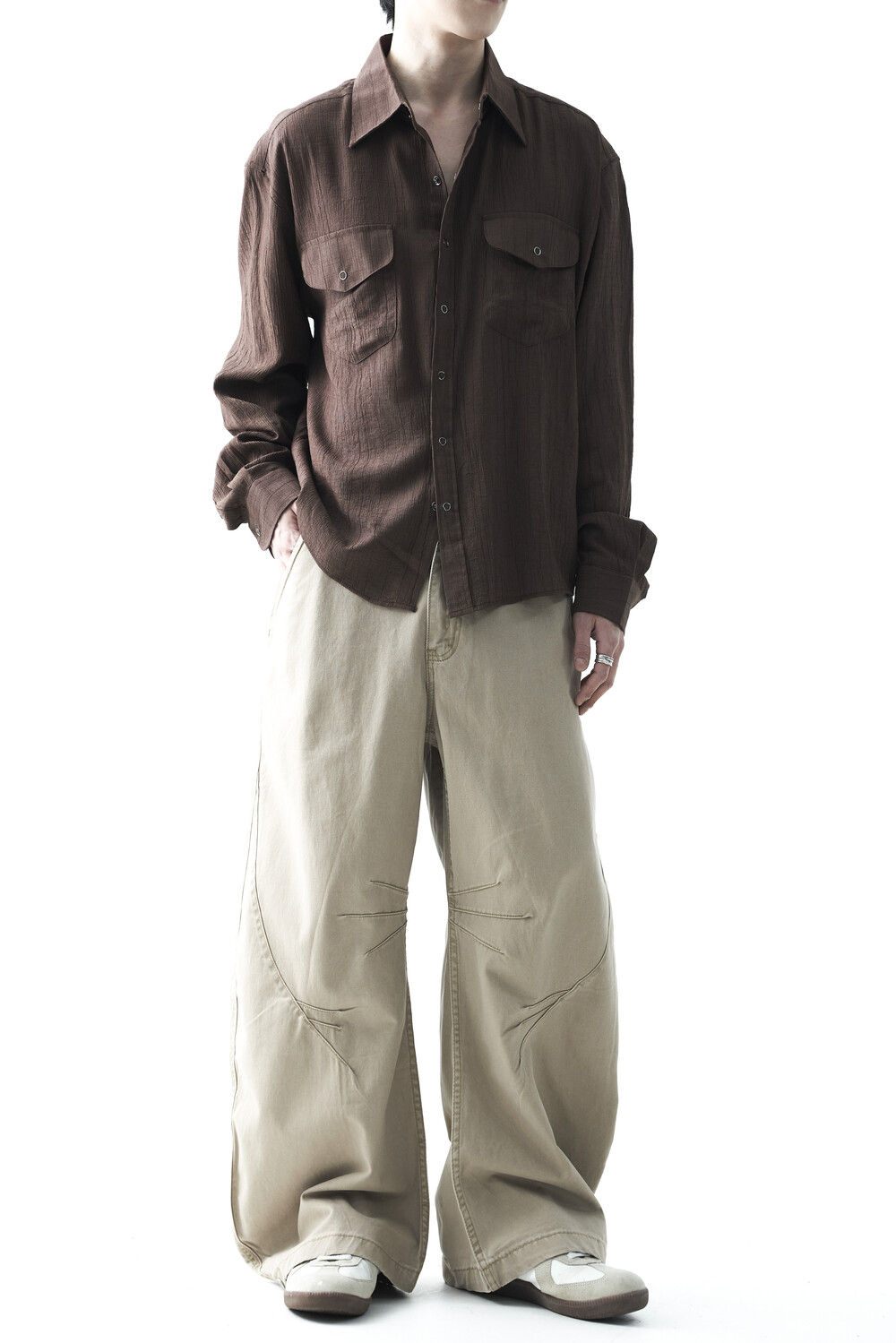 - 고급스러운 터치감을 자아내는 레이온 소재감으로 구성된 실키한 투포켓 셔츠 제품입니다.