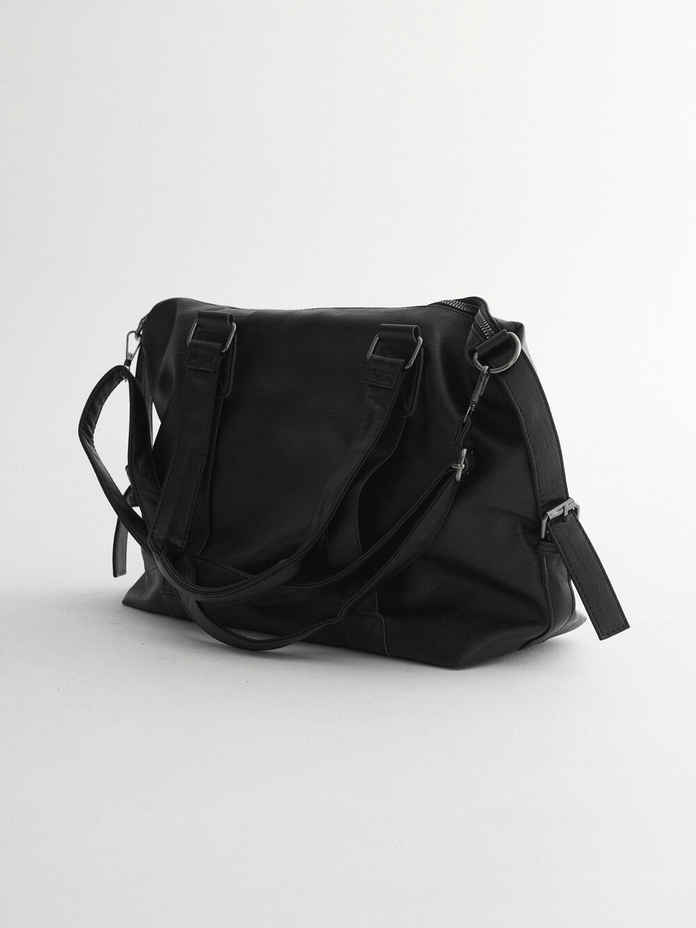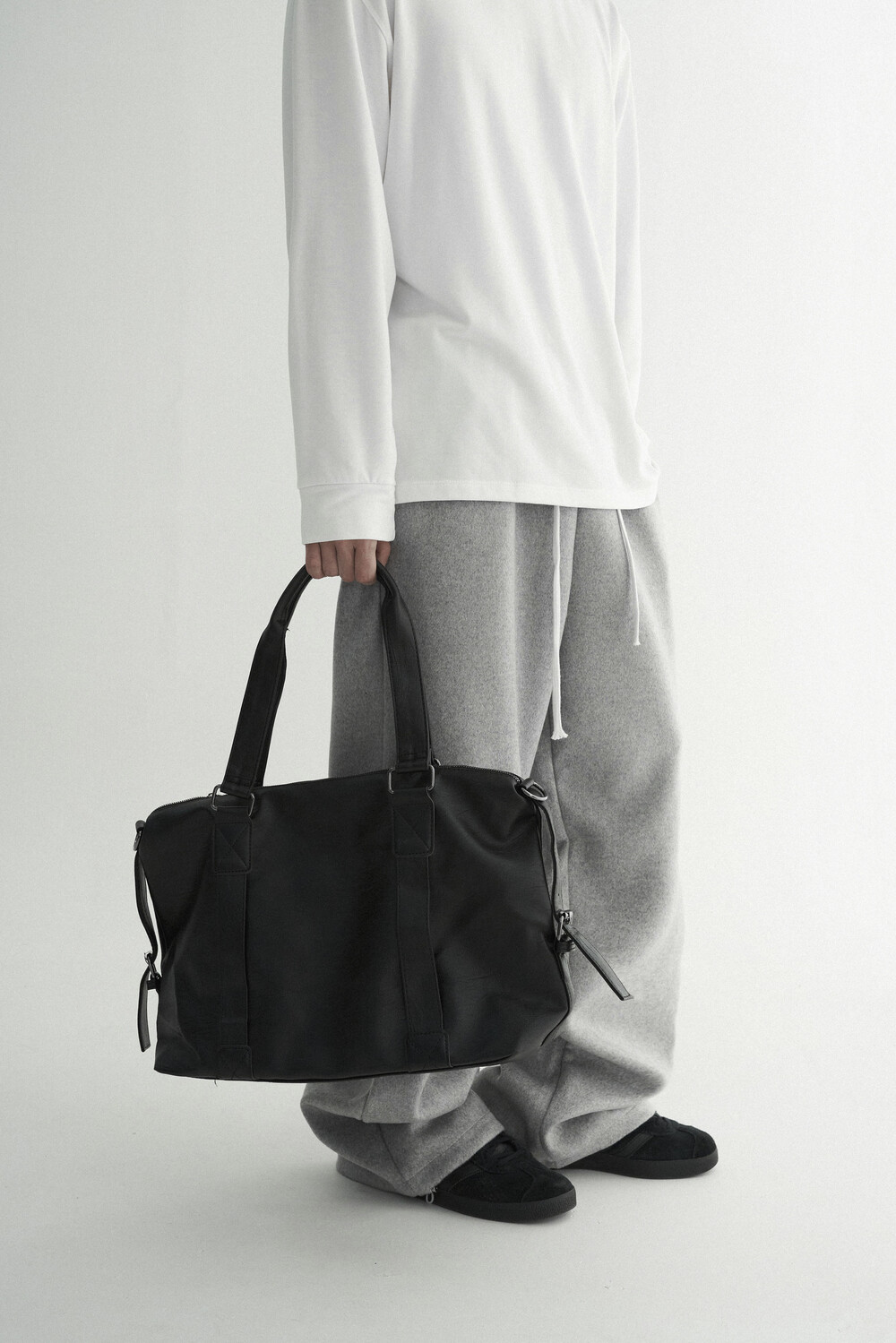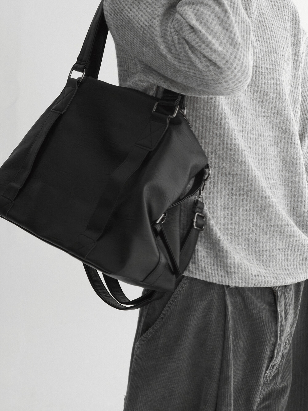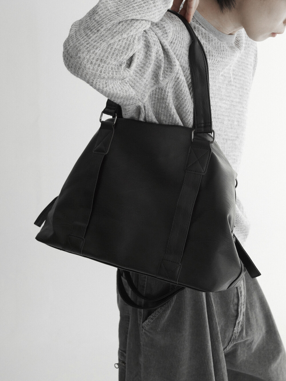 Detail point - 포멀한 숄더백 사이즈감의 캐쥬얼한 투웨이 크로스백 제품입니다. 평소 가볍게 손에 잡고 다닐 수 있는 행잉 방식과 어깨에 걸칠 수 있는 숄더 크로스 방식이 모두 가능 할 수 있도록 손잡이 부분 외 사이드 측의 숄더 스트링이 추가되어 있는 가방 제품입니다. 부드러운 합성 비건레더 소재를 통해 방오성이 뛰어나며 측면과 내부 포켓을 통해 다양한 수납이 수월합니다. 또한 블랙 원컬러로 제작되어 어떠한 코디에도 폭넓은 코디가 가능합니다. (* 소재 특성상 습도가 높은 곳에서의 보관을 피하시는 것을 추천드리며, 날카로운 기물들로 인한 외부 스크래치에 주의 부탁드립니다.)