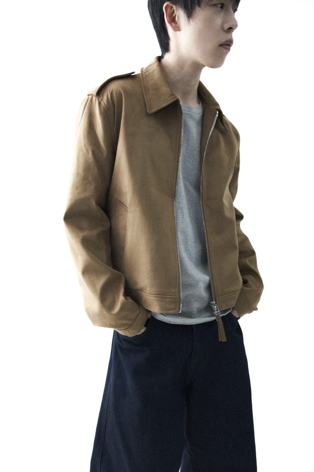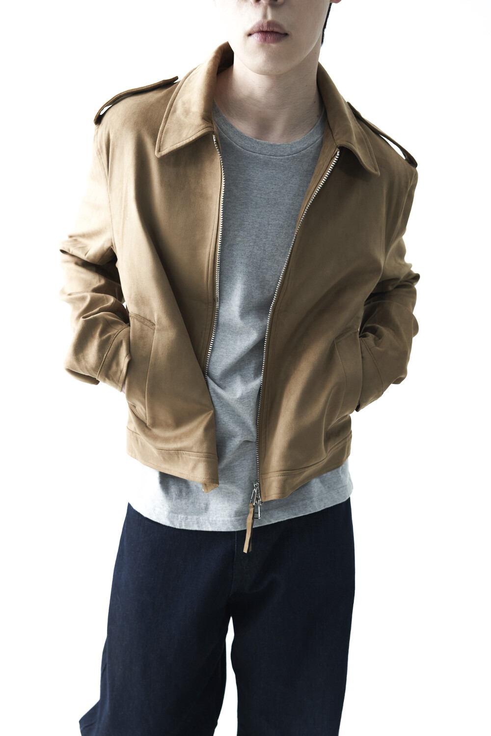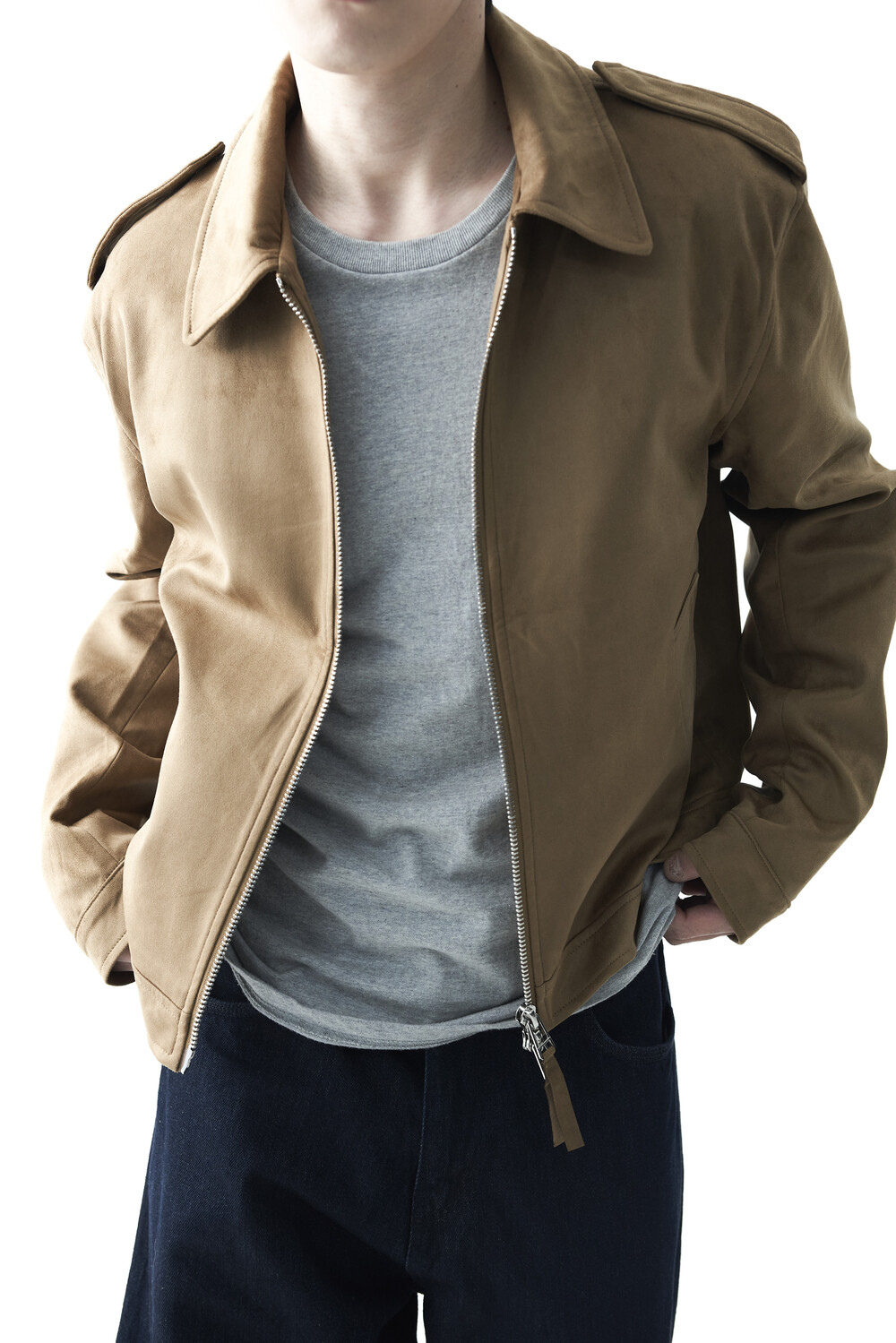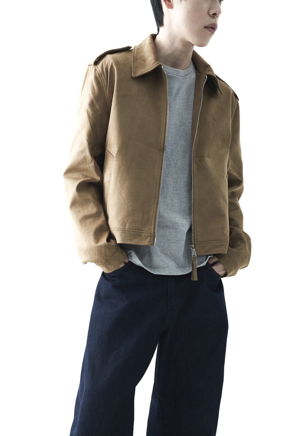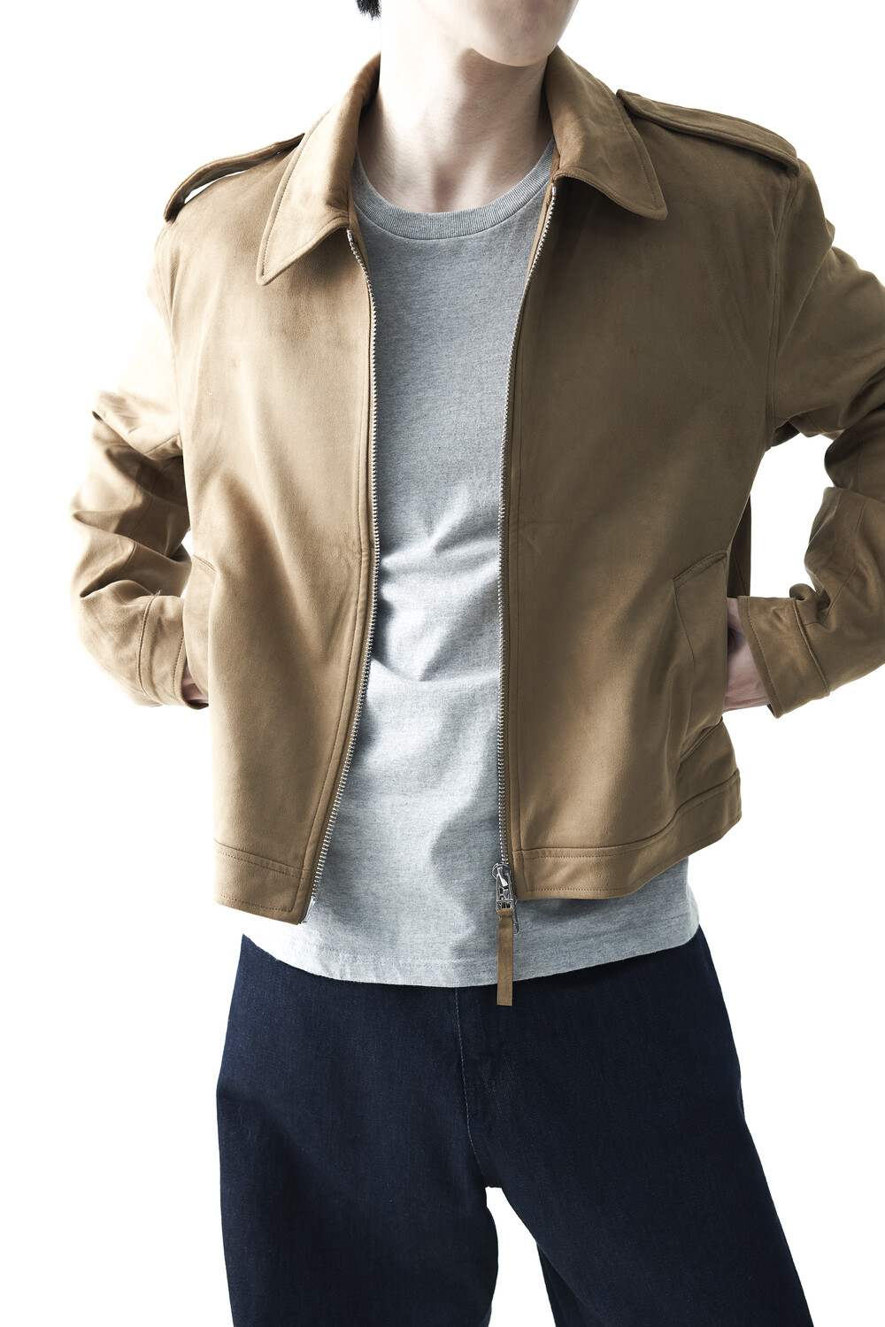 - 견장(epaulet) 디테일이 적용된 부드러운 터치감의 스웨이드 자켓 제품입니다. 간절기에 알맞은 두께감으로 구성되었으며, 크롭한 기장감으로 다양한 이너제품들과 높은 코디력을 갖춘 제품입니다. 디테일 투웨이 지퍼를 통해 두가지 스타일로 착용해보시는 것을 권장해드립니다.