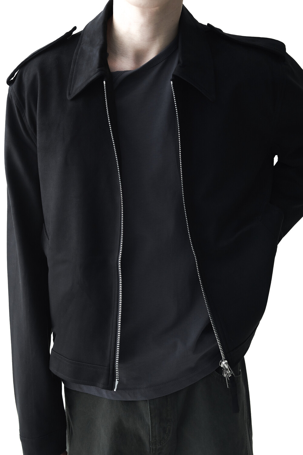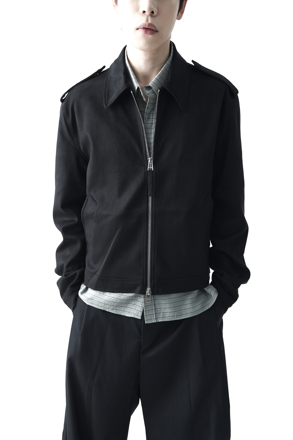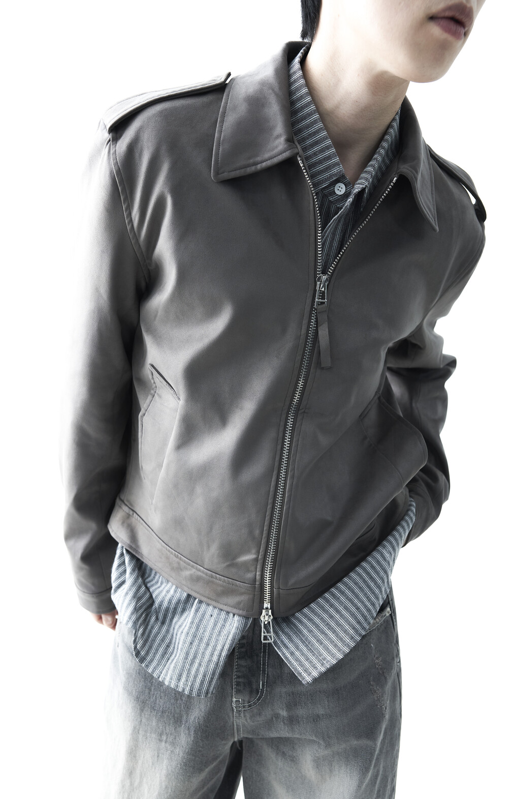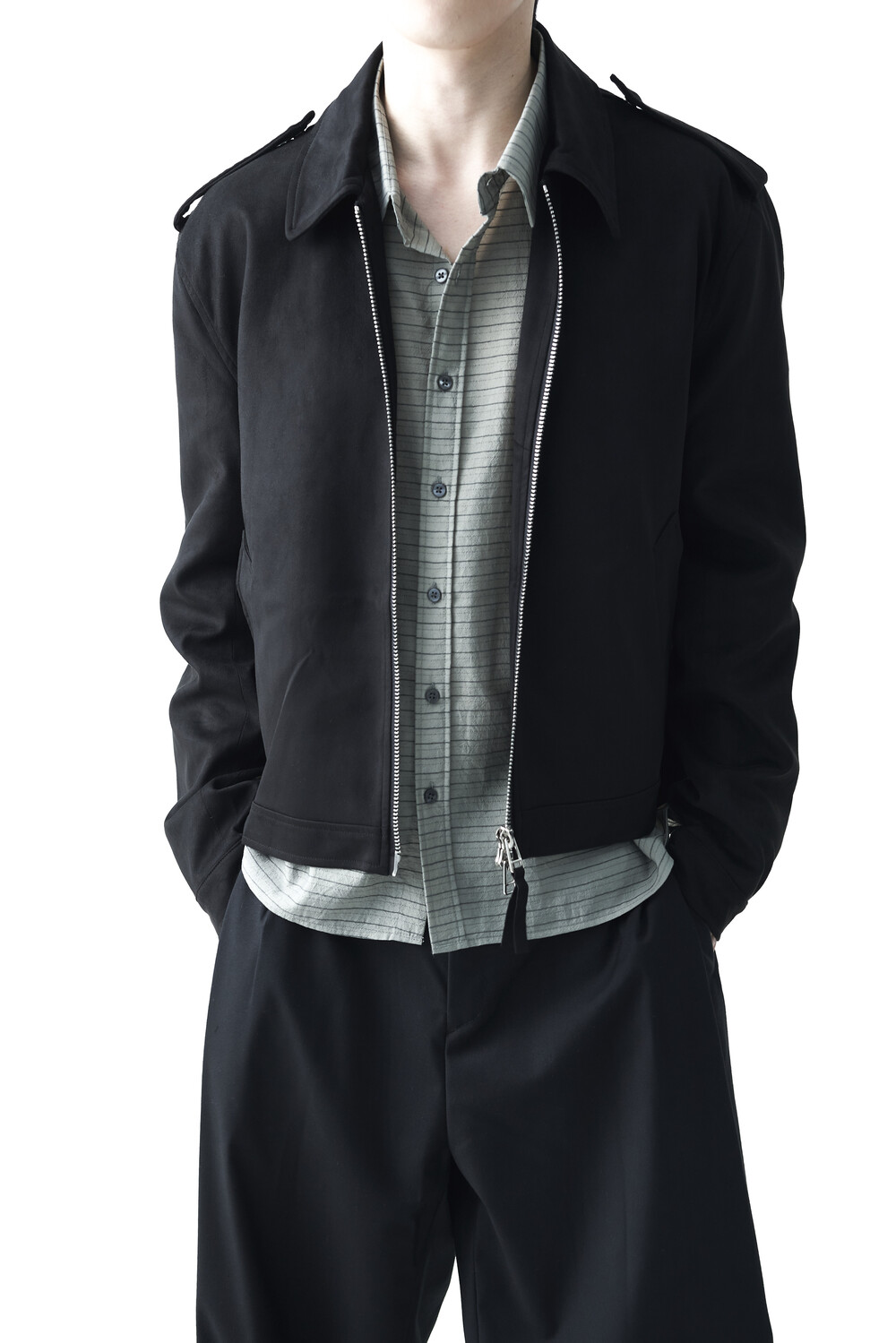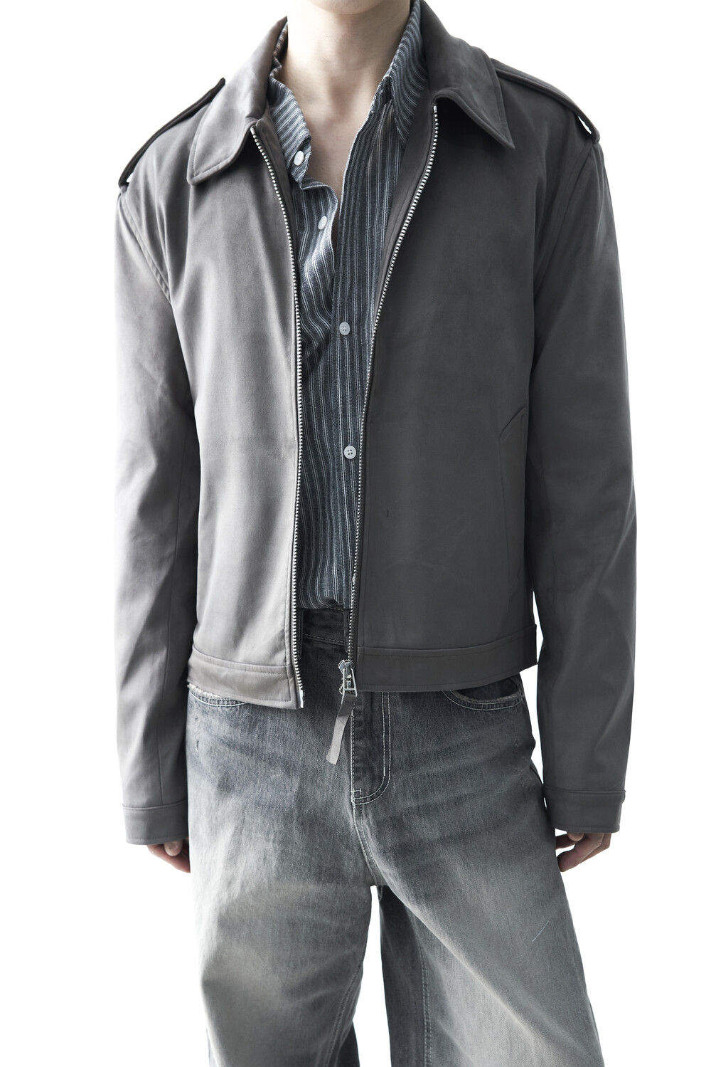 - 견장(epaulet) 디테일이 적용된 부드러운 터치감의 스웨이드 자켓 제품입니다. 간절기에 알맞은 두께감으로 구성되었으며, 크롭한 기장감으로 다양한 이너제품들과 높은 코디력을 갖춘 제품입니다. 디테일 투웨이 지퍼를 통해 두가지 스타일로 착용해보시는 것을 권장해드립니다.