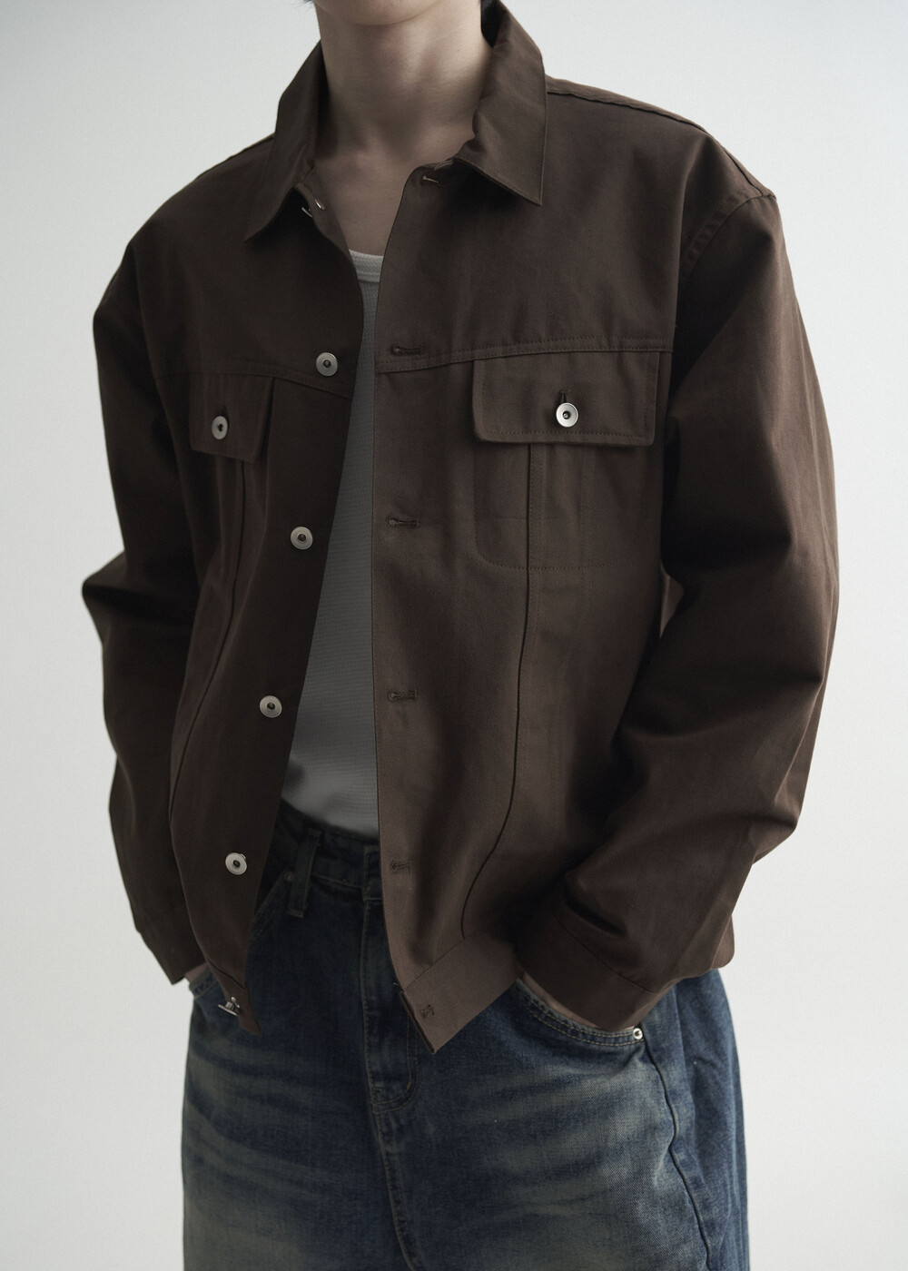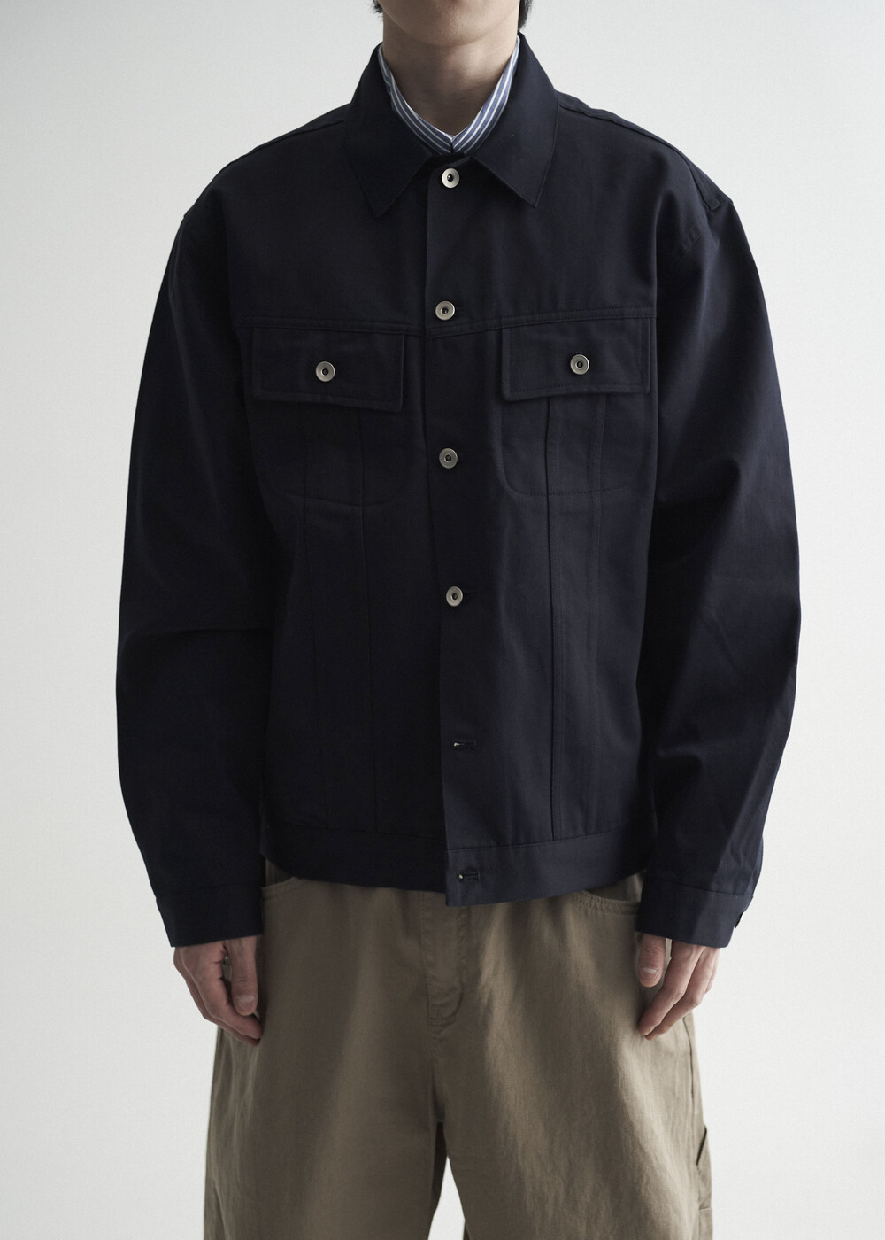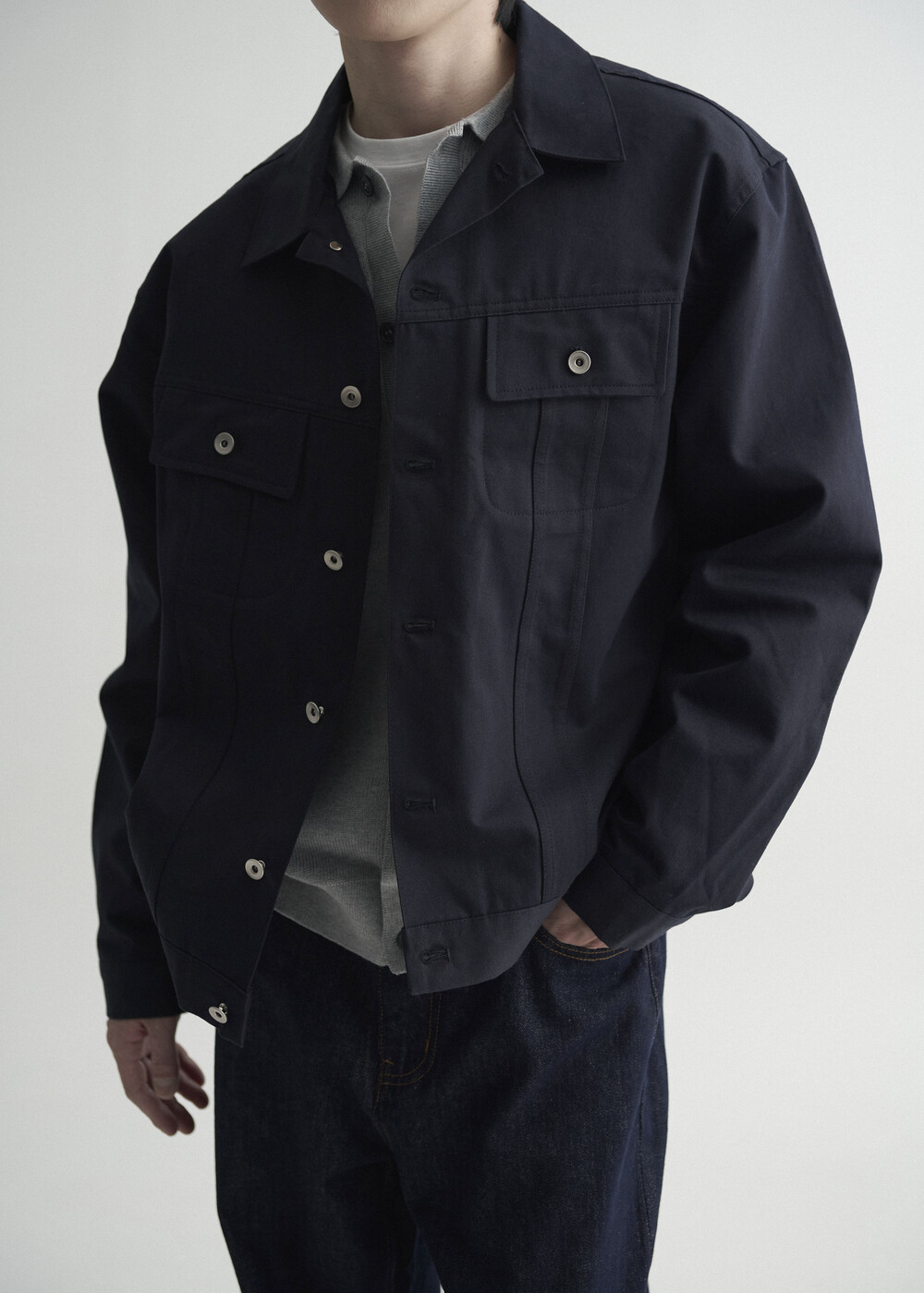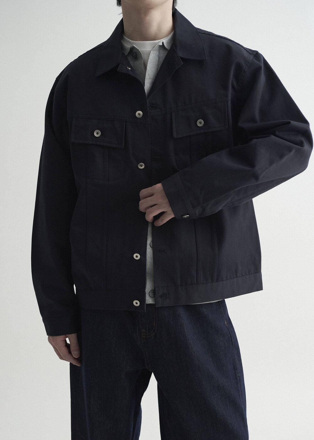- 탄탄한 조직감의 세미 오버 실루엣을 띄는 코튼 트러커 자켓 제품