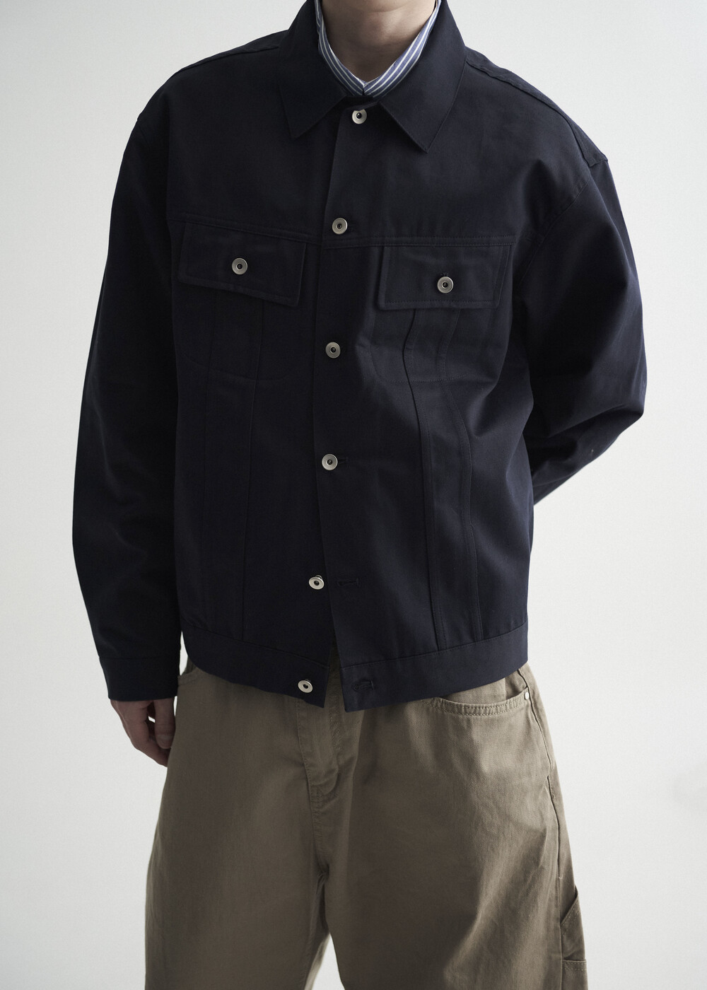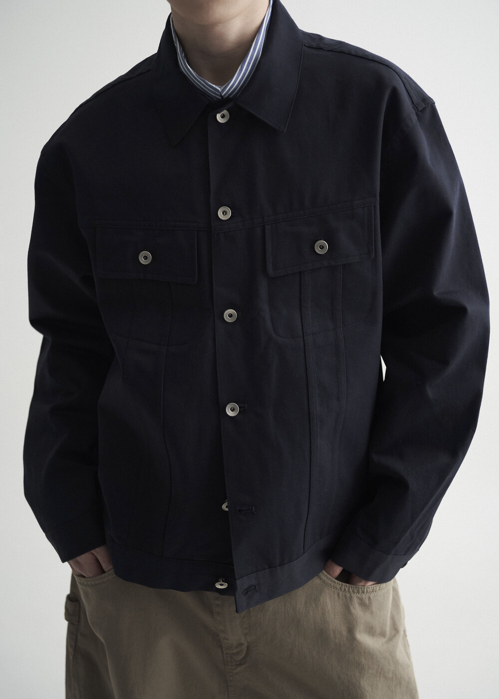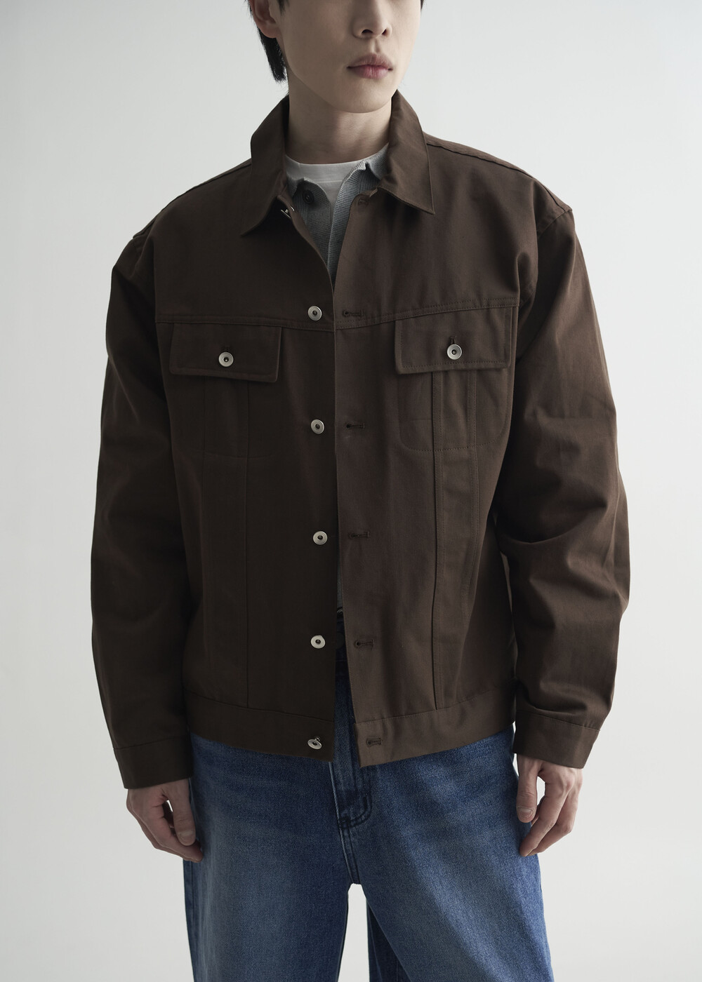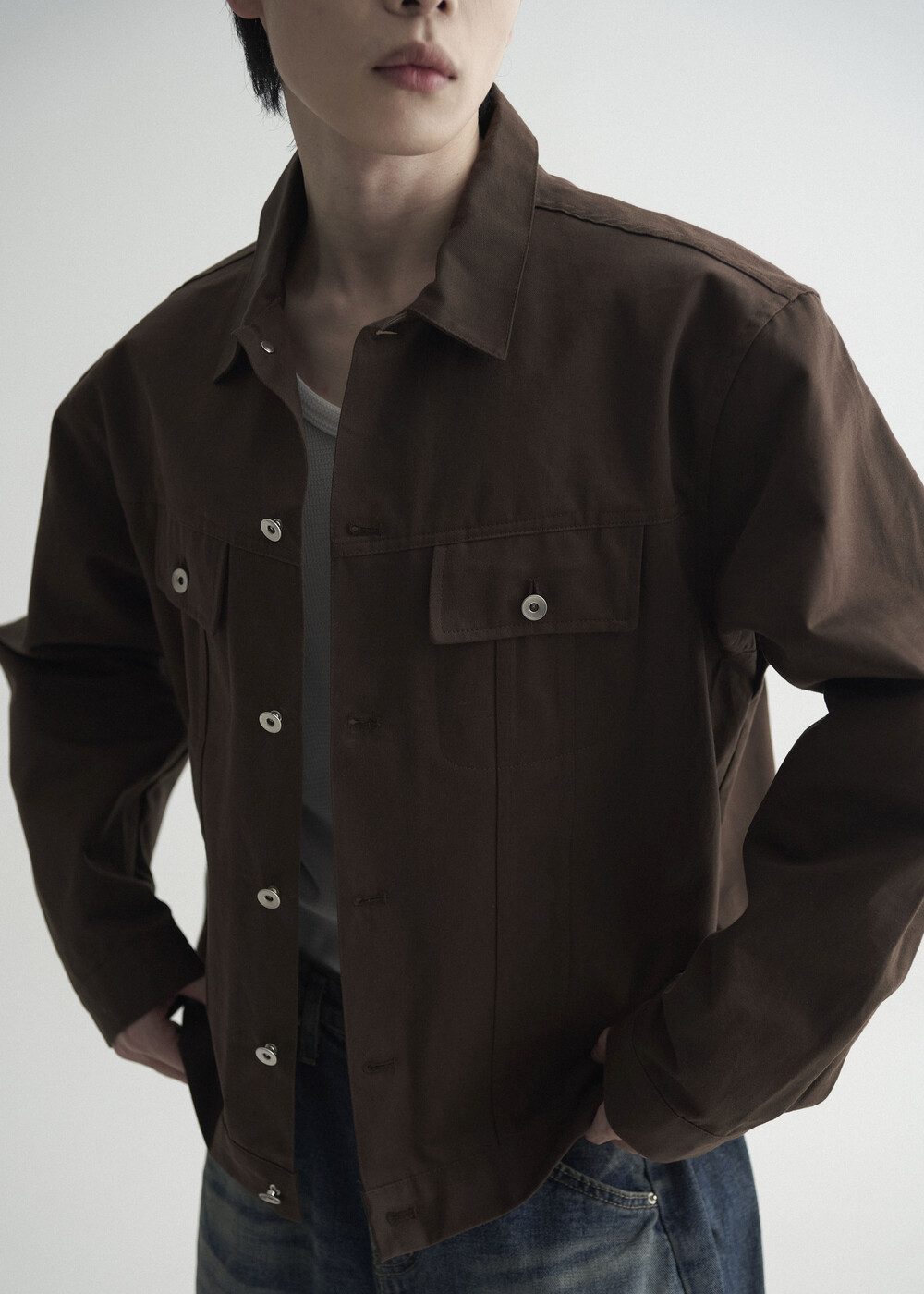 - 탄탄한 조직감의 세미 오버 실루엣을 띄는 코튼 트러커 자켓 제품