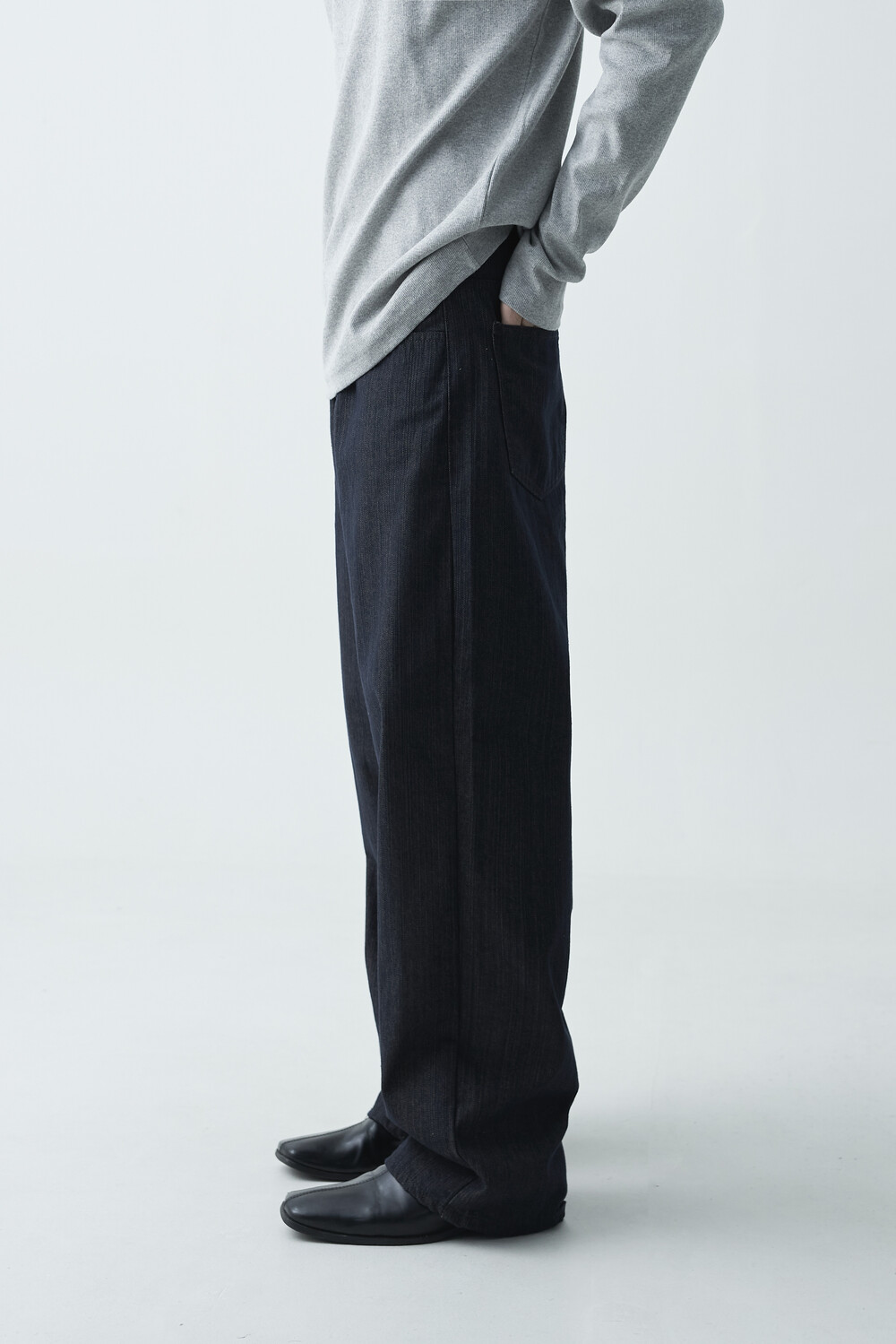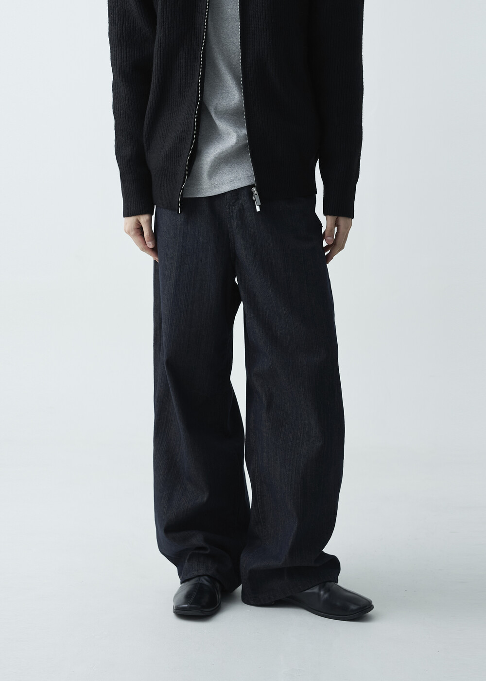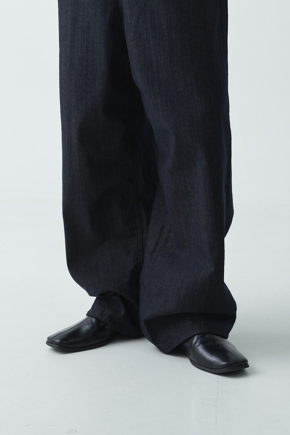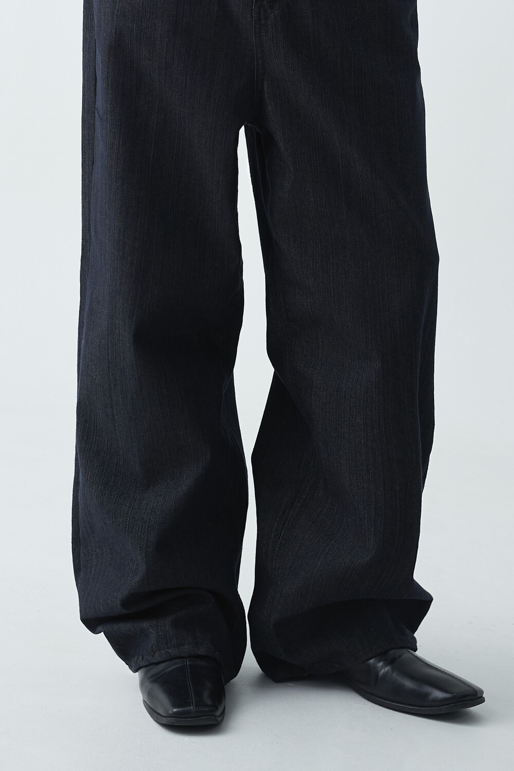 논페이드 생지 코튼 데님 소재감의 와이드 데님 팬츠 제품입니다. 은은한 슬럽 원단감이 더욱 고급스러운 매력을 전하며, 생지데님 특유의 탄탄한 조직감이 견고하게 잘 나타나는 와이드 팬츠 제품입니다.