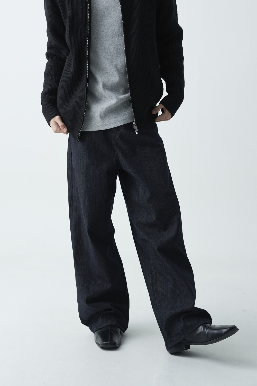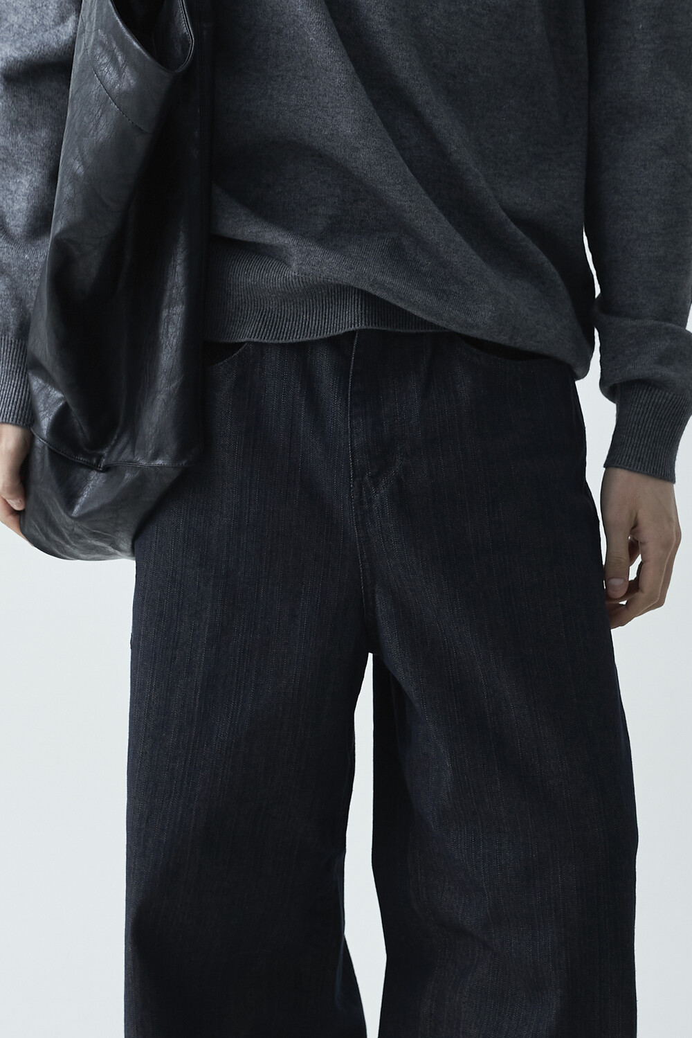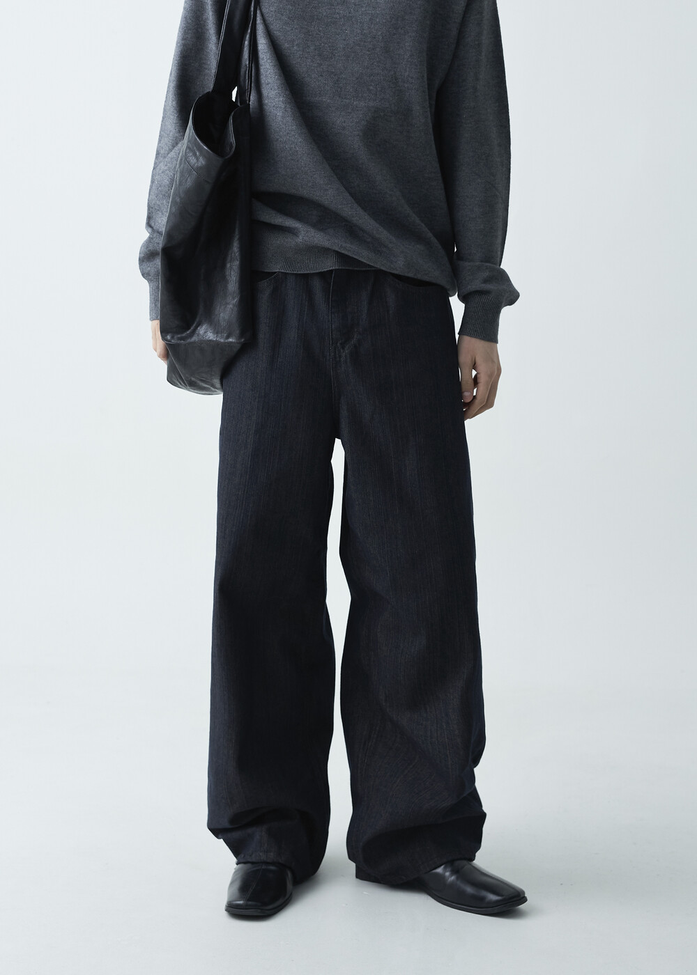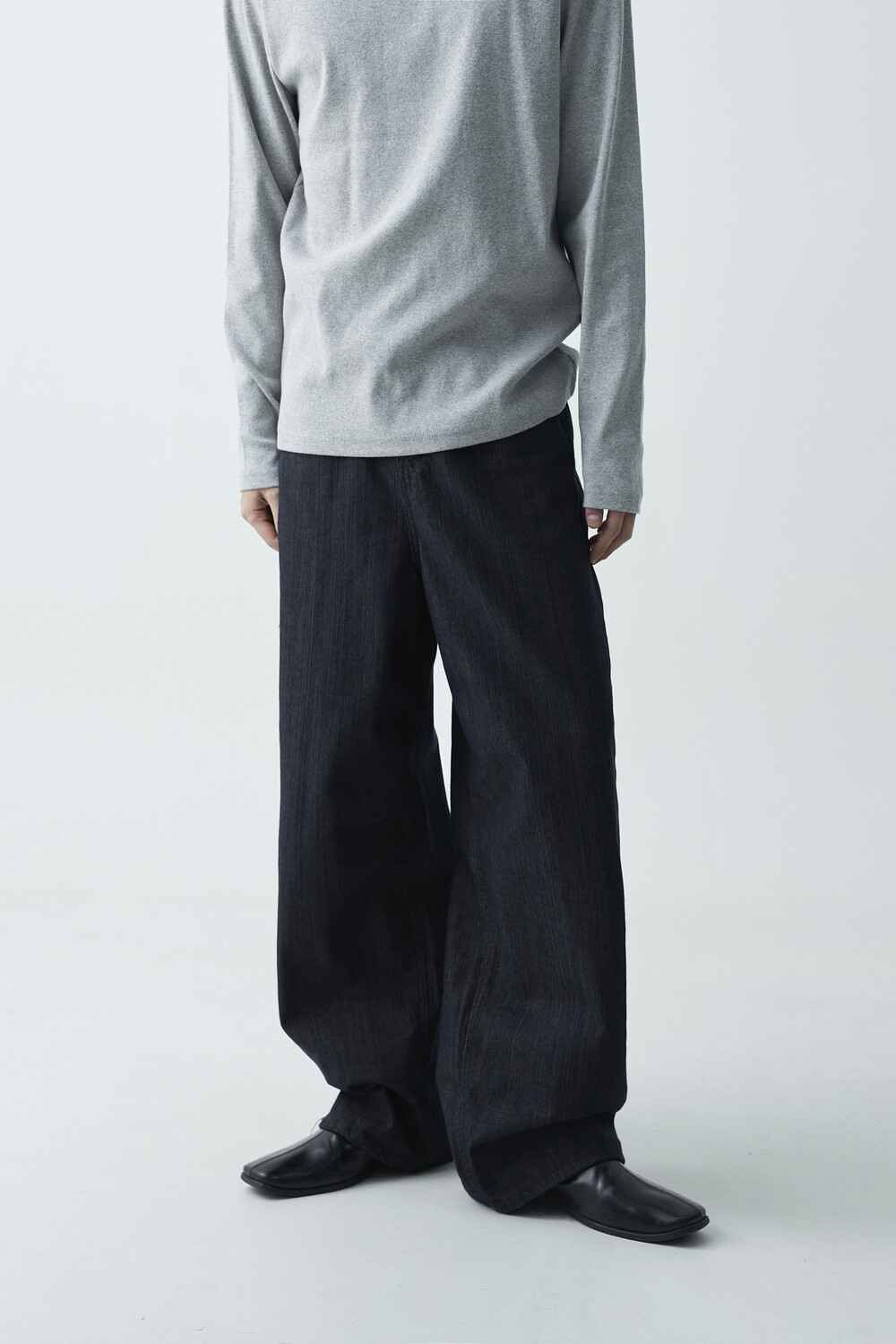 논페이드 생지 코튼 데님 소재감의 와이드 데님 팬츠 제품입니다. 은은한 슬럽 원단감이 더욱 고급스러운 매력을 전하며, 생지데님 특유의 탄탄한 조직감이 견고하게 잘 나타나는 와이드 팬츠 제품입니다.