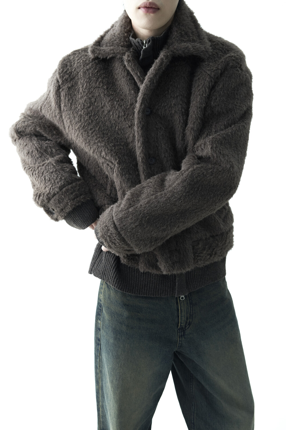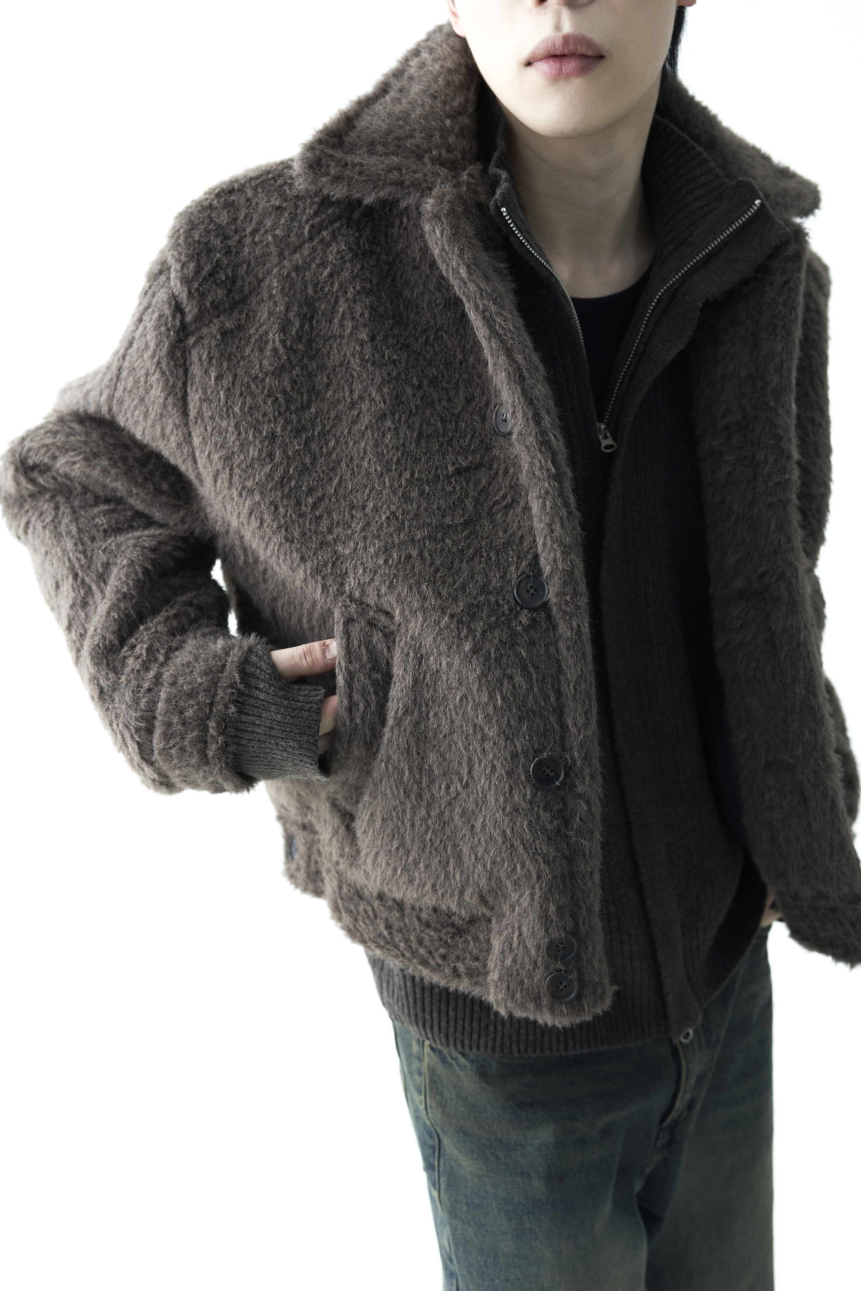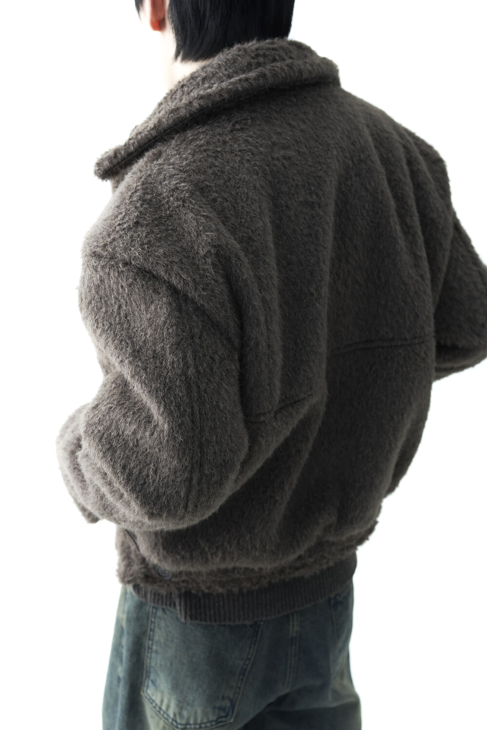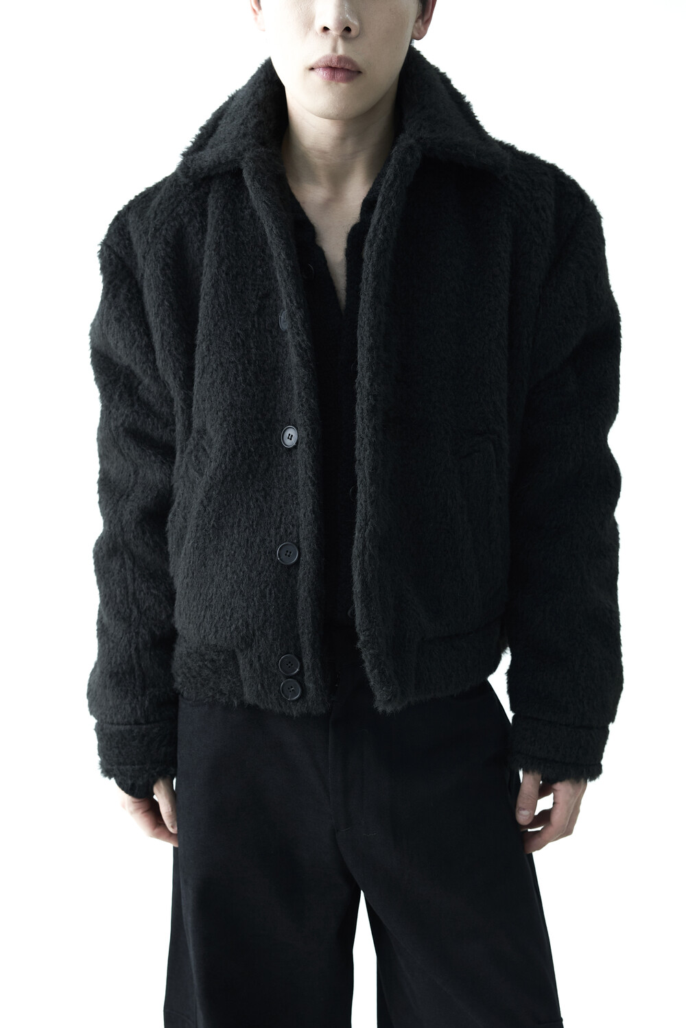 - 루즈한 카라 라인과 숏 크롭한 기장감으로 젠더리스한 아웃핏을 선사하는 헤어리 울 점퍼 제품입니다.