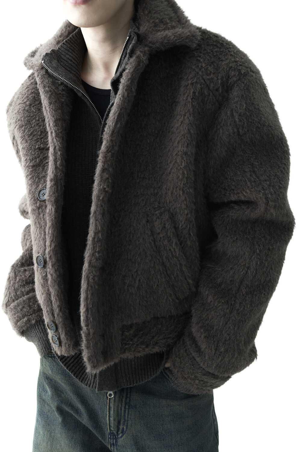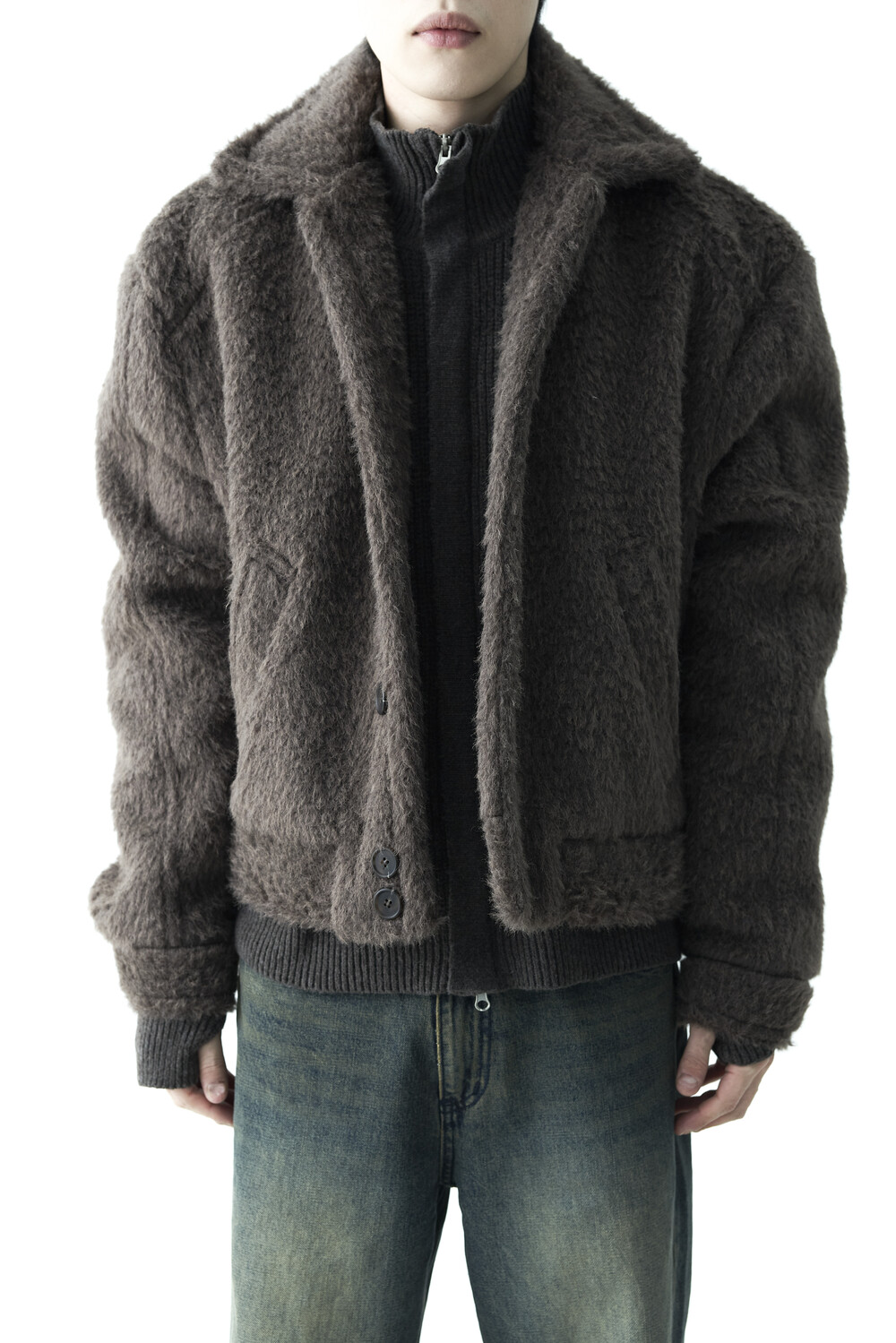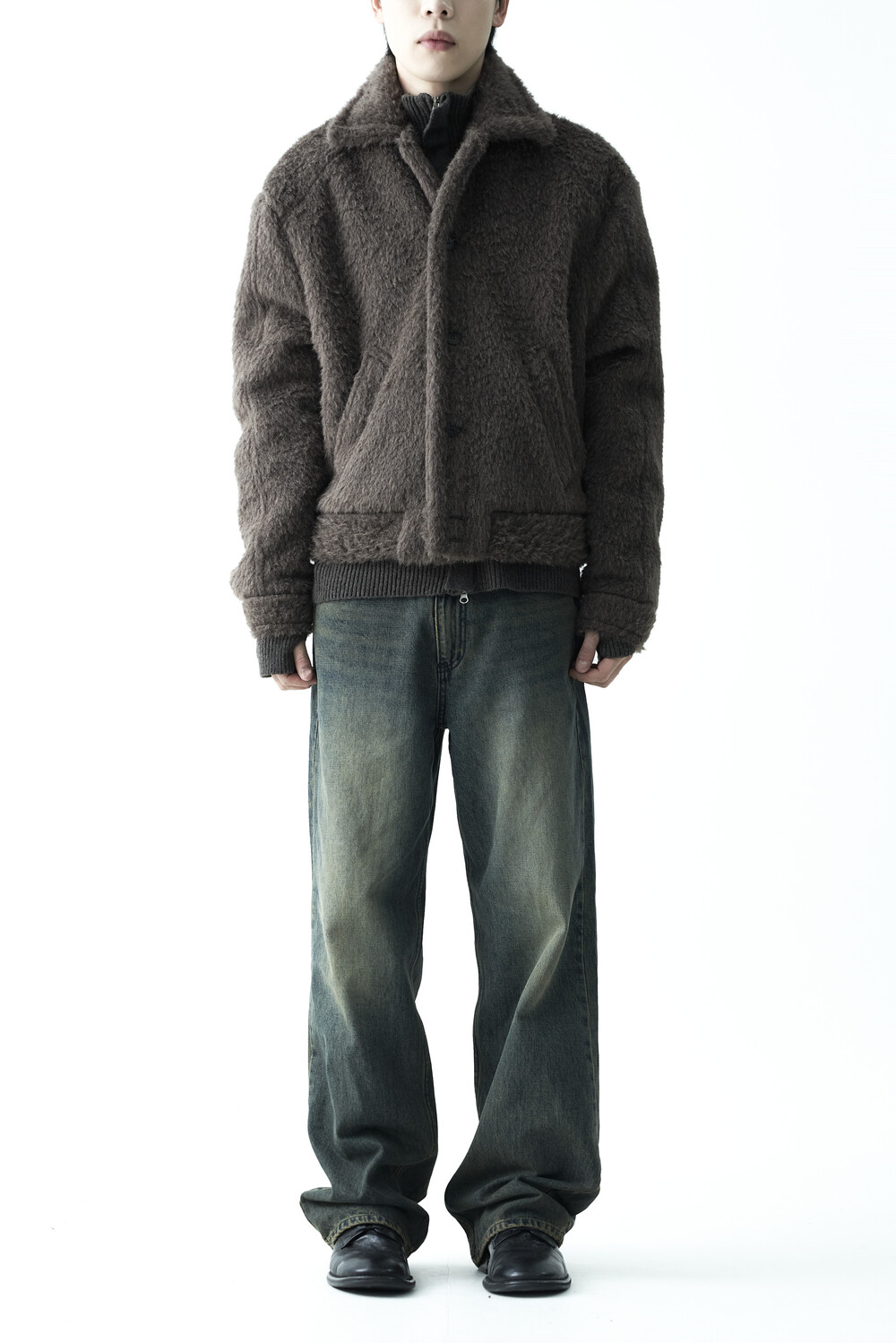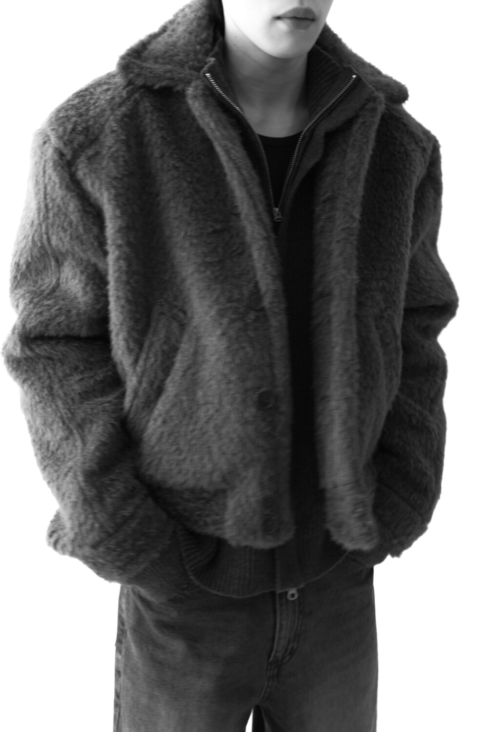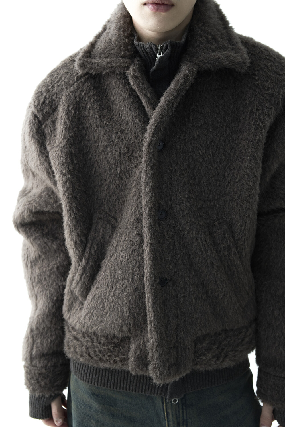 - 루즈한 카라 라인과 숏 크롭한 기장감으로 젠더리스한 아웃핏을 선사하는 헤어리 울 점퍼 제품입니다.