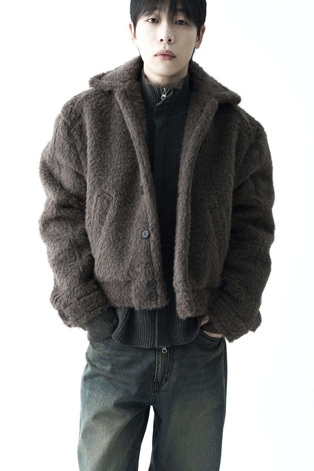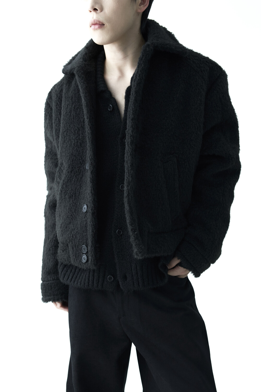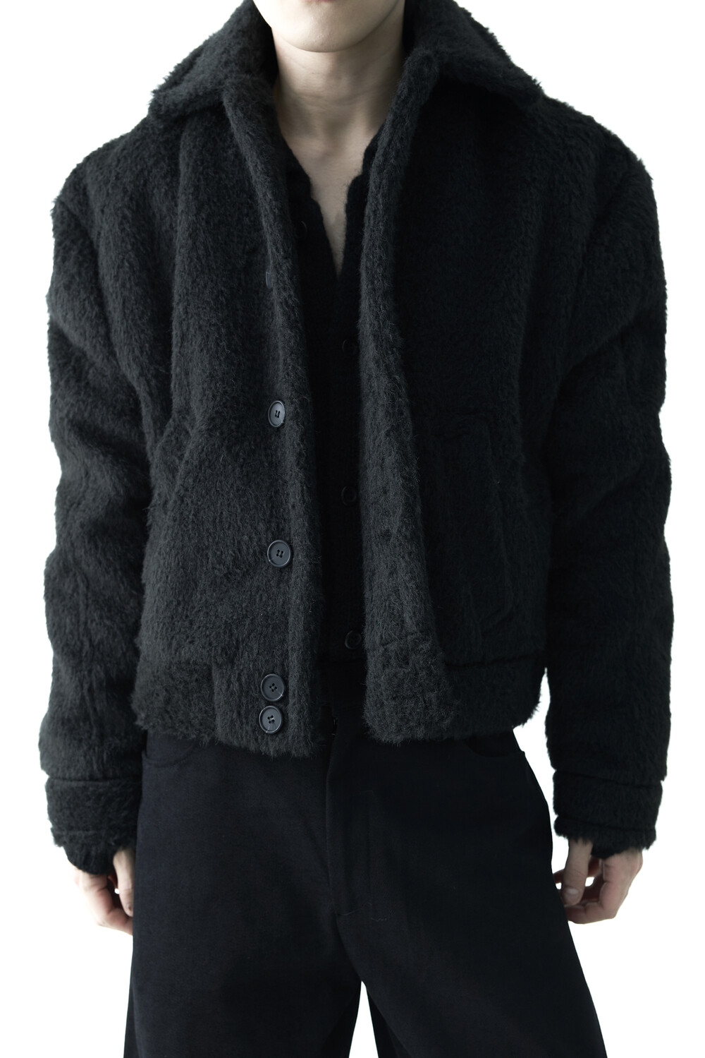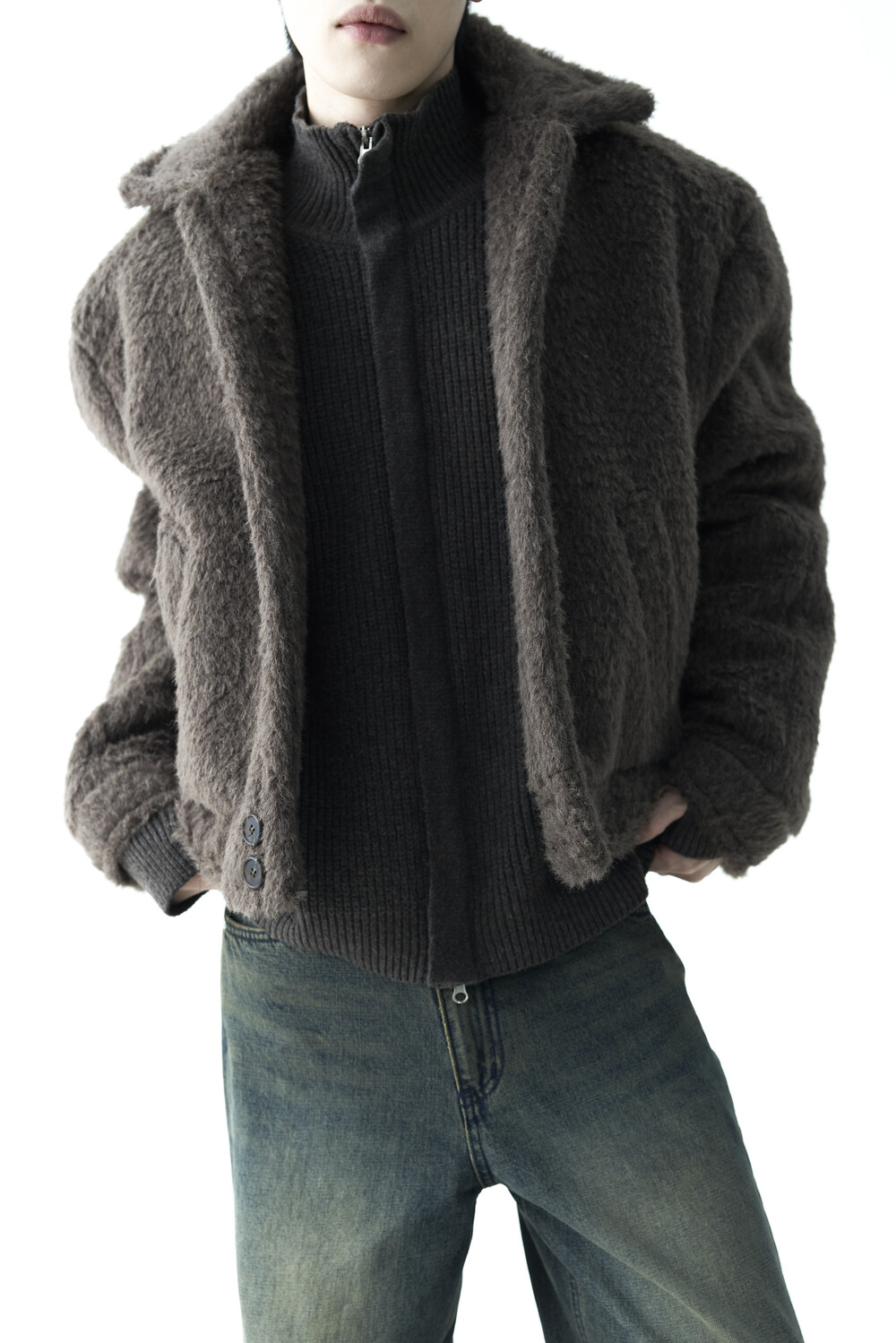 - 루즈한 카라 라인과 숏 크롭한 기장감으로 젠더리스한 아웃핏을 선사하는 헤어리 울 점퍼 제품입니다.