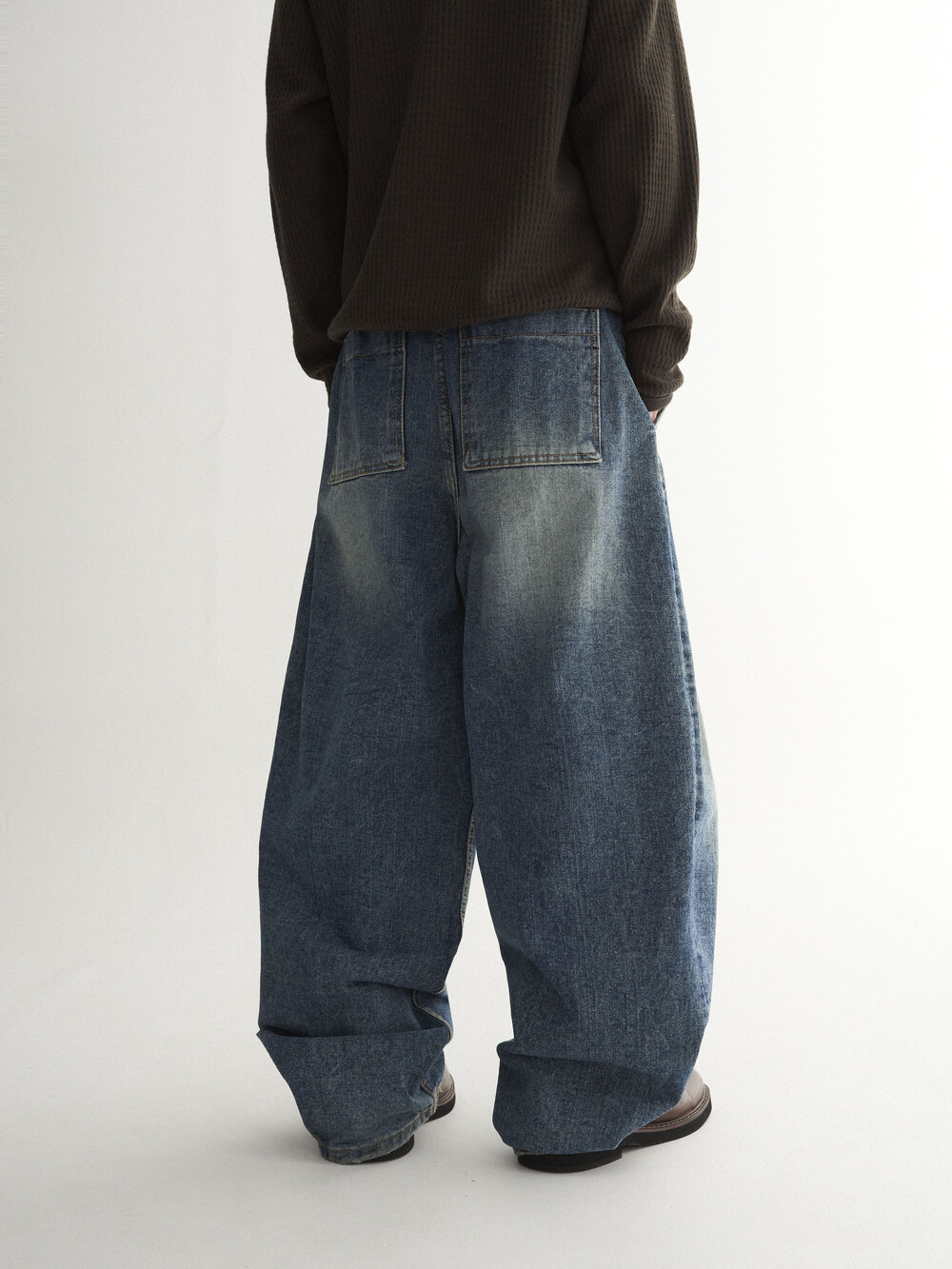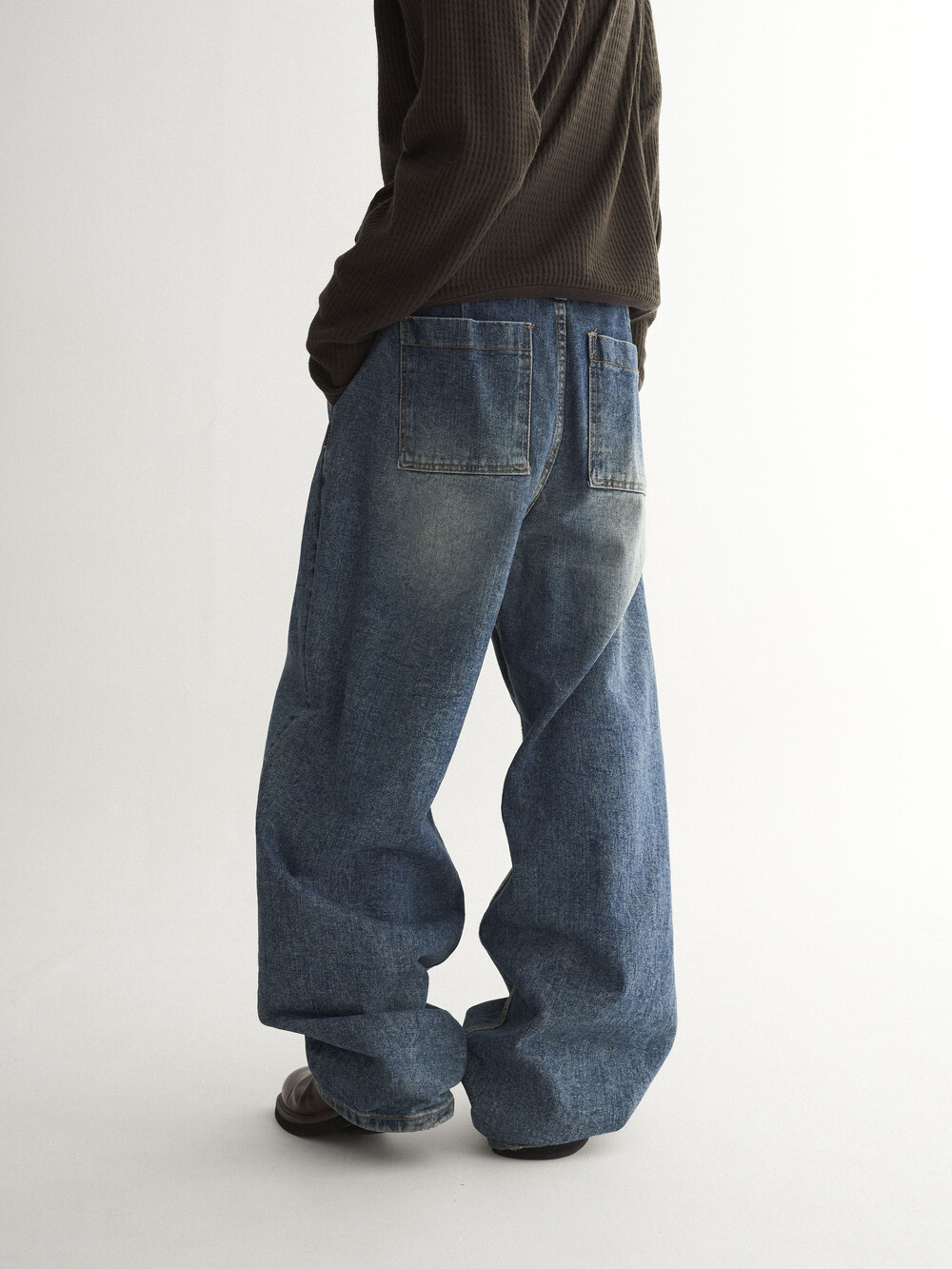 탄탄한 데님소재감과 함께 과하지 않은 와이드리함을 겸하고 있는 제품입니다.
