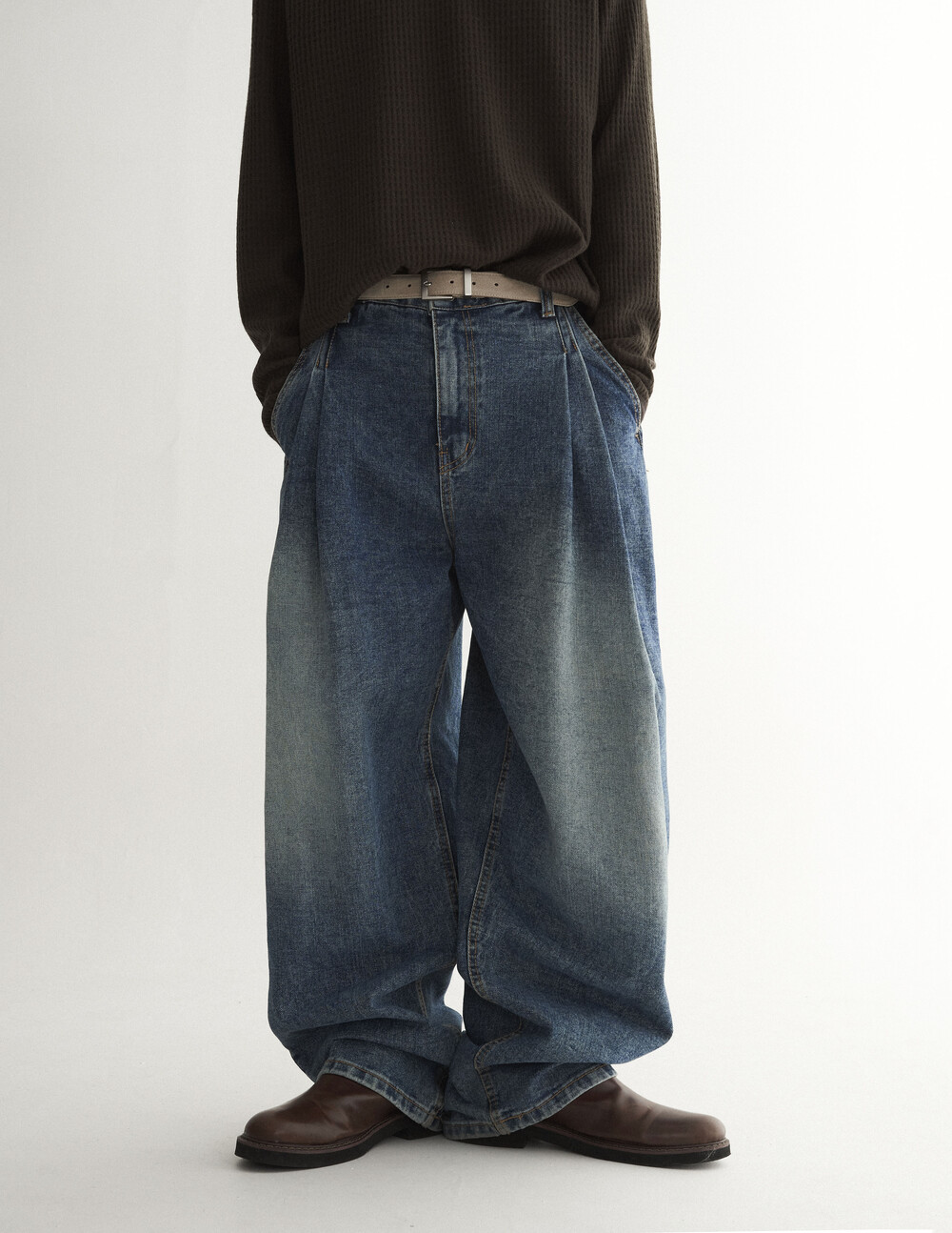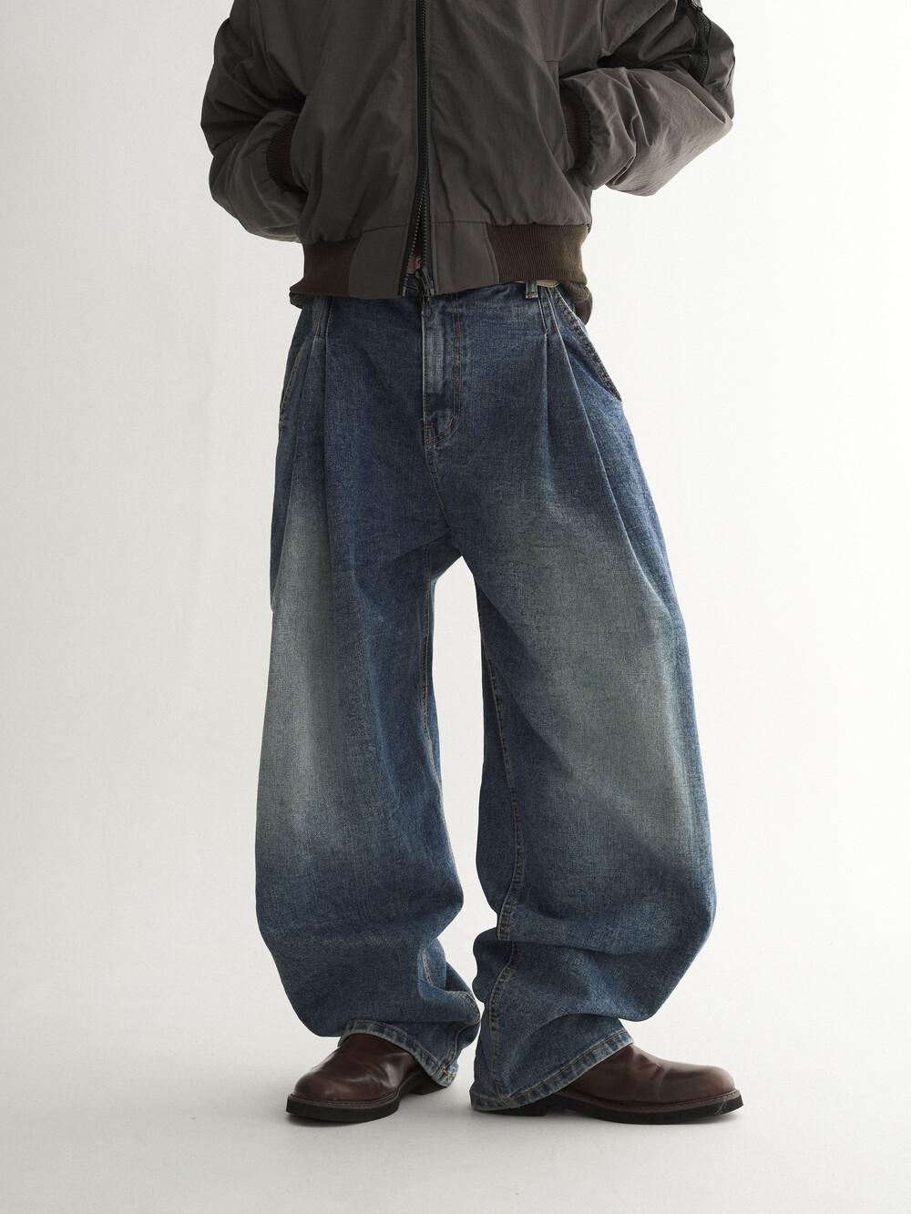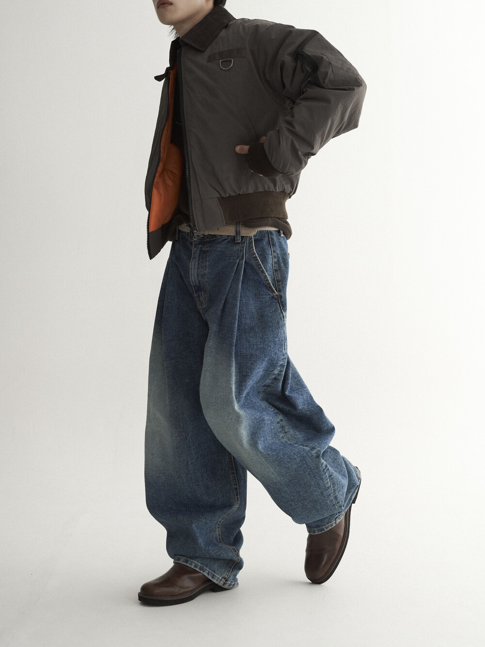- 전면부 사이드 라인의 2핀턱 디테일로 제작된 와이드 데님팬츠